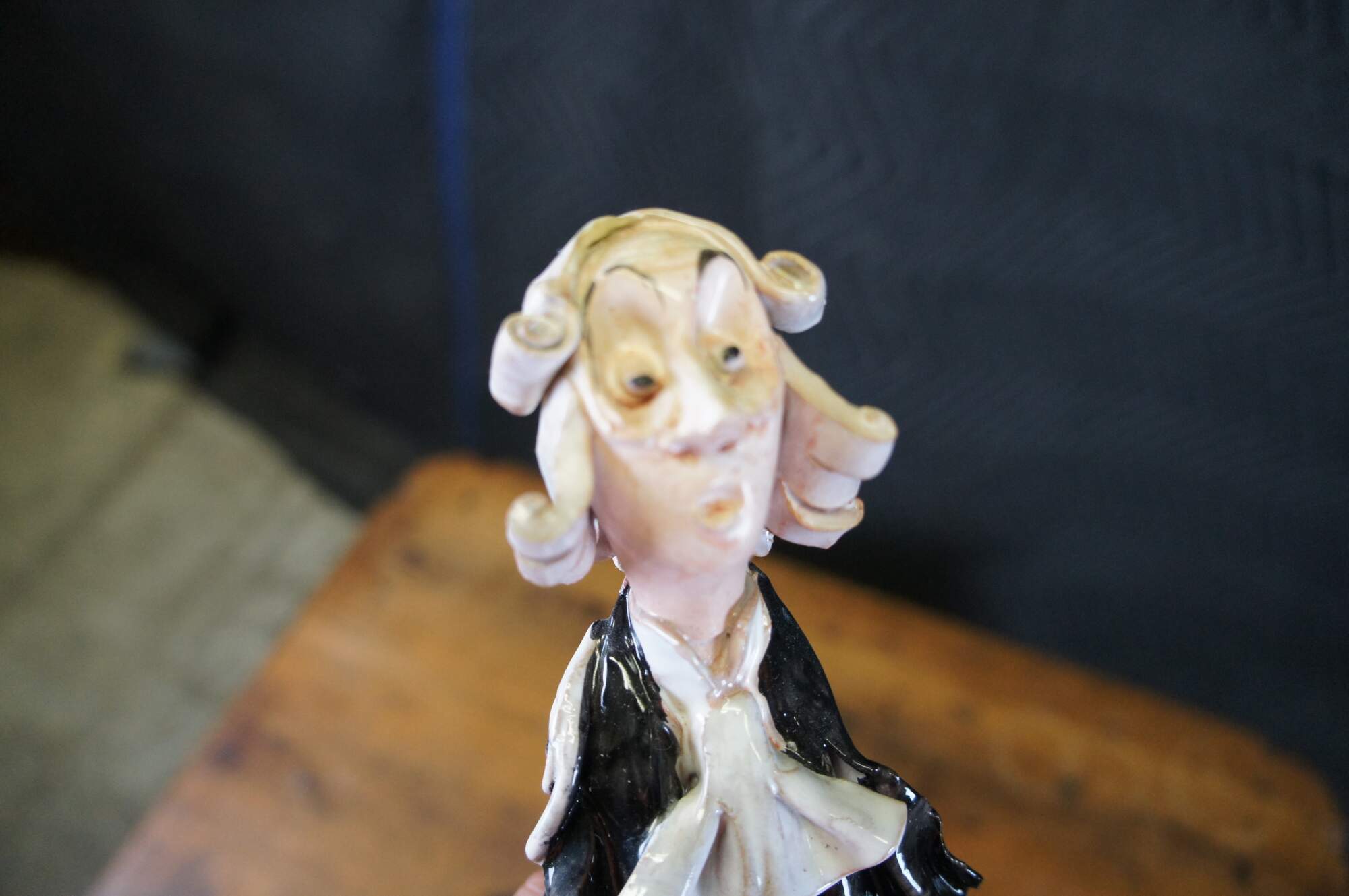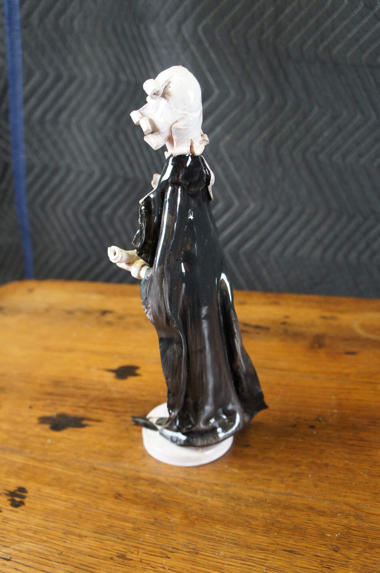 Scat by Poli Cesare, a whimsical Italian art pottery figurine featuring a lawyer / barrister / judge in full dress, holding a scroll that reads Law.
