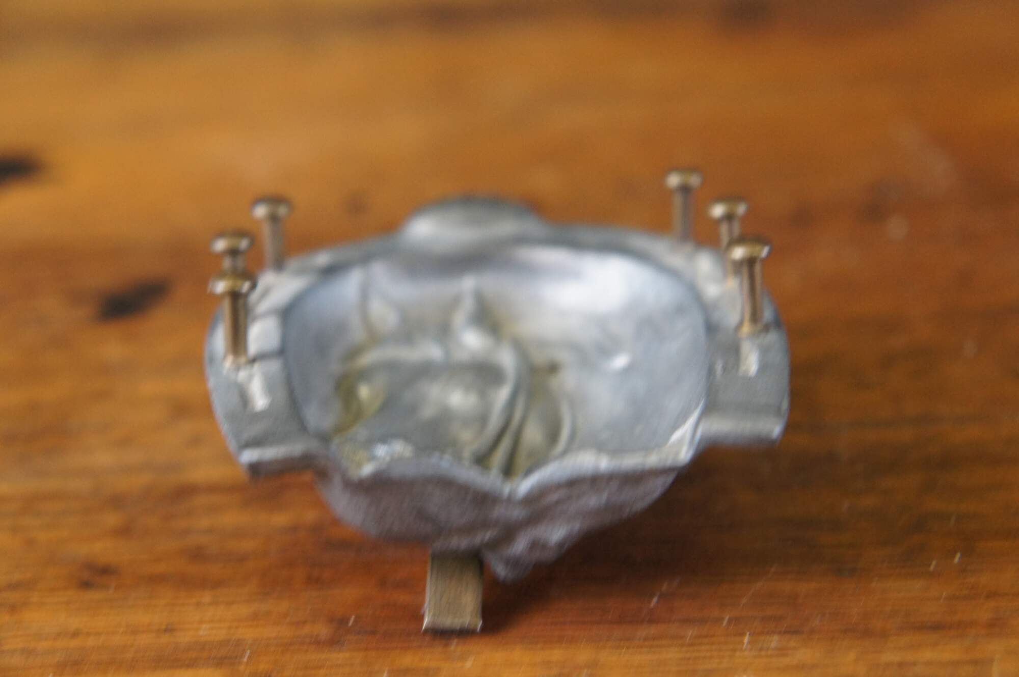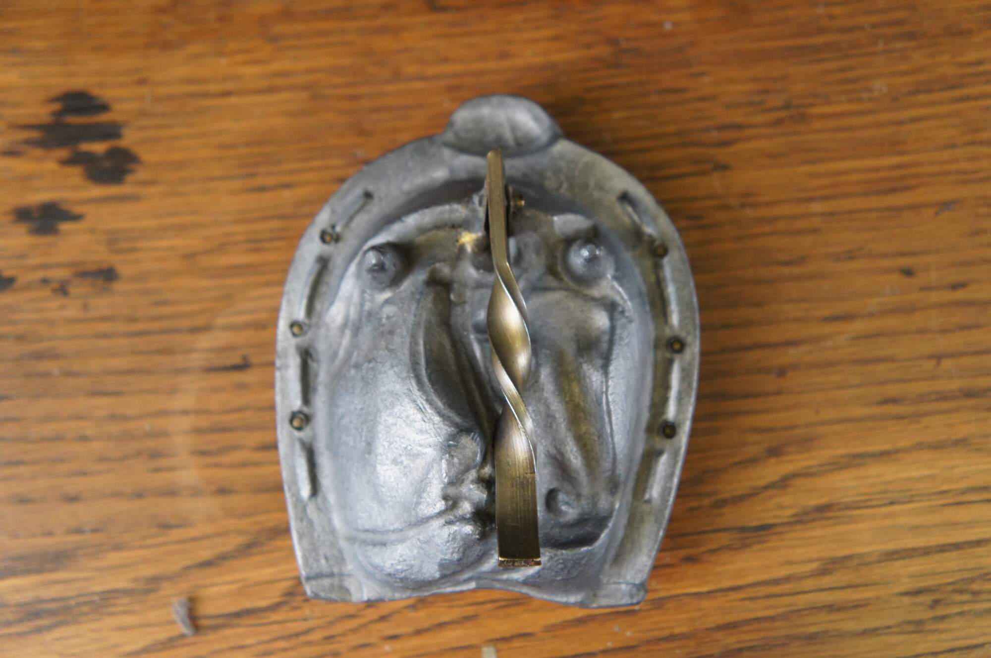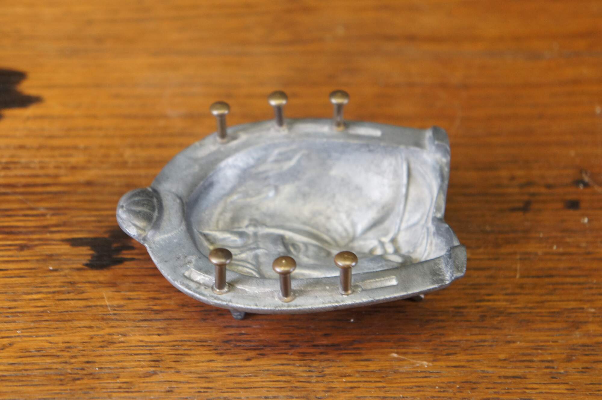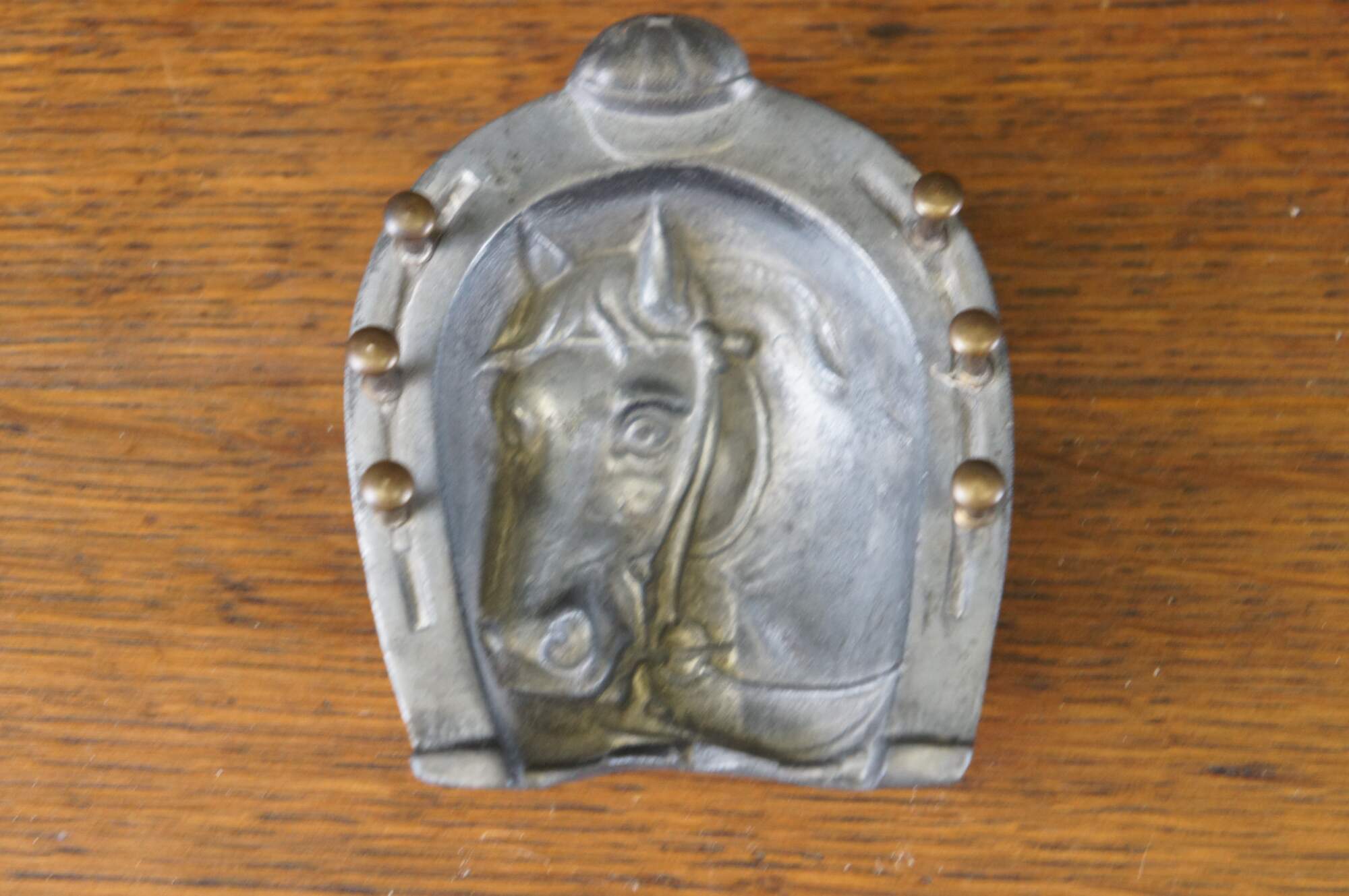 Vintage English folk art Equestrian / Horse theme inkwell pen / quill holder / aluminum ashtray featuring a horseshoe with slots for 3 pens.