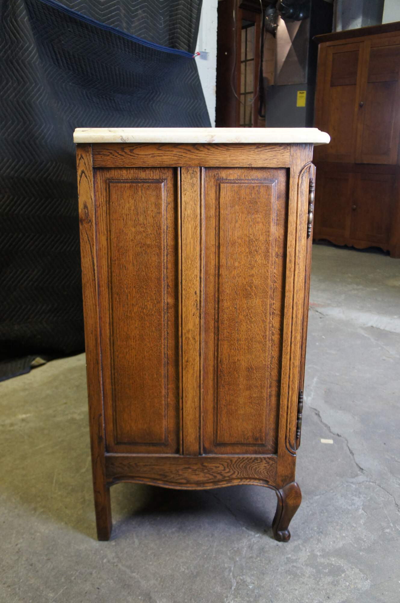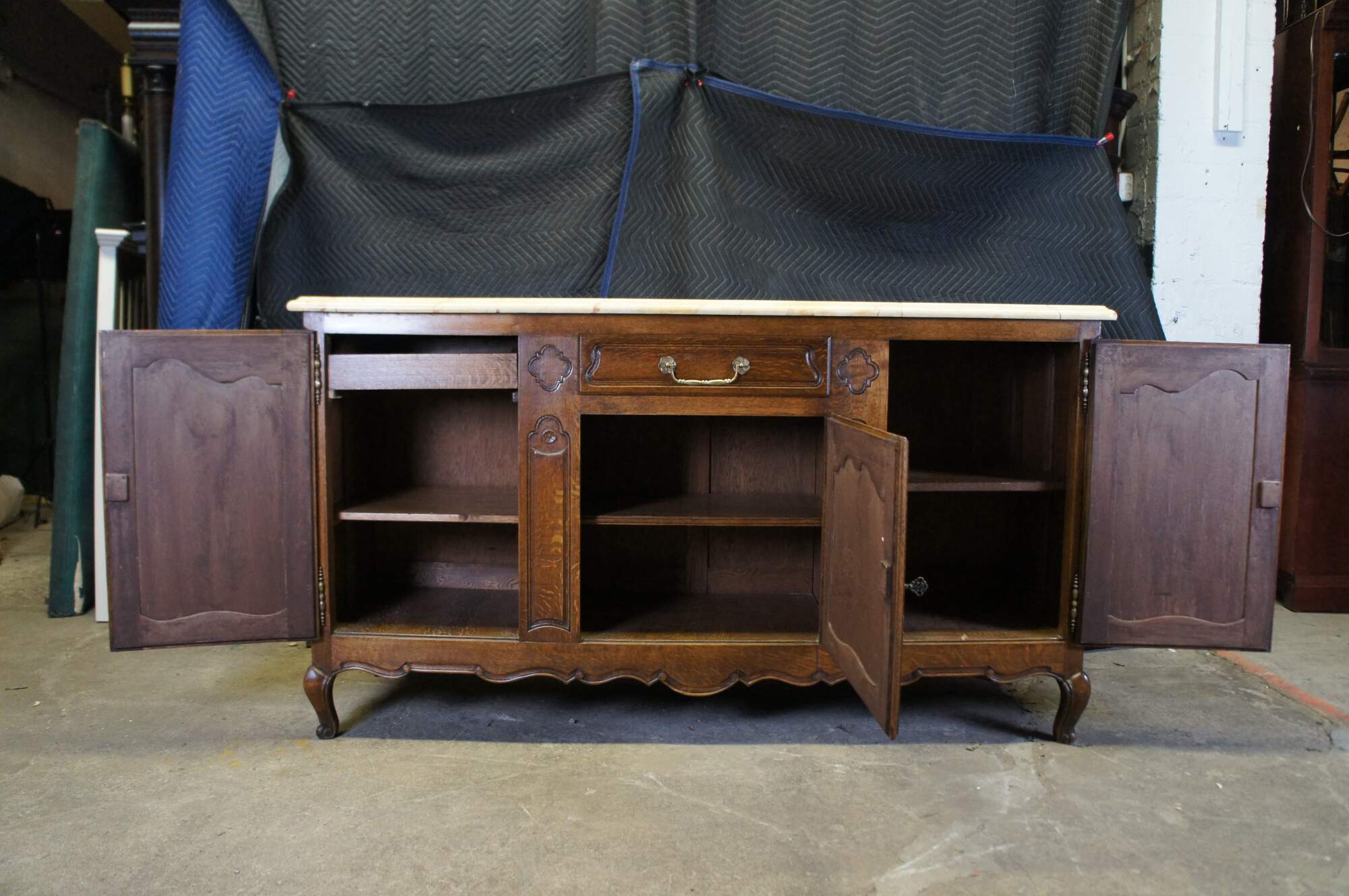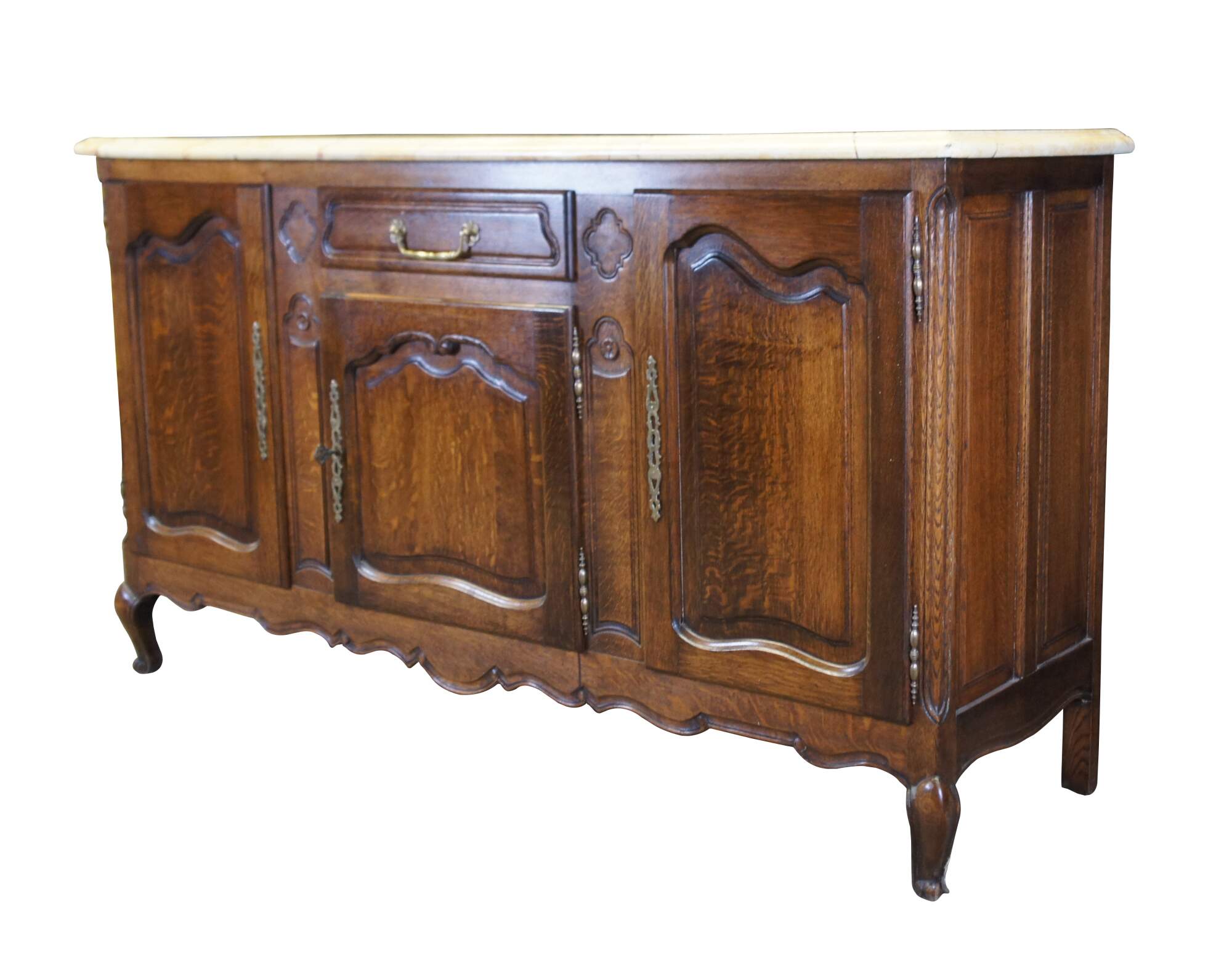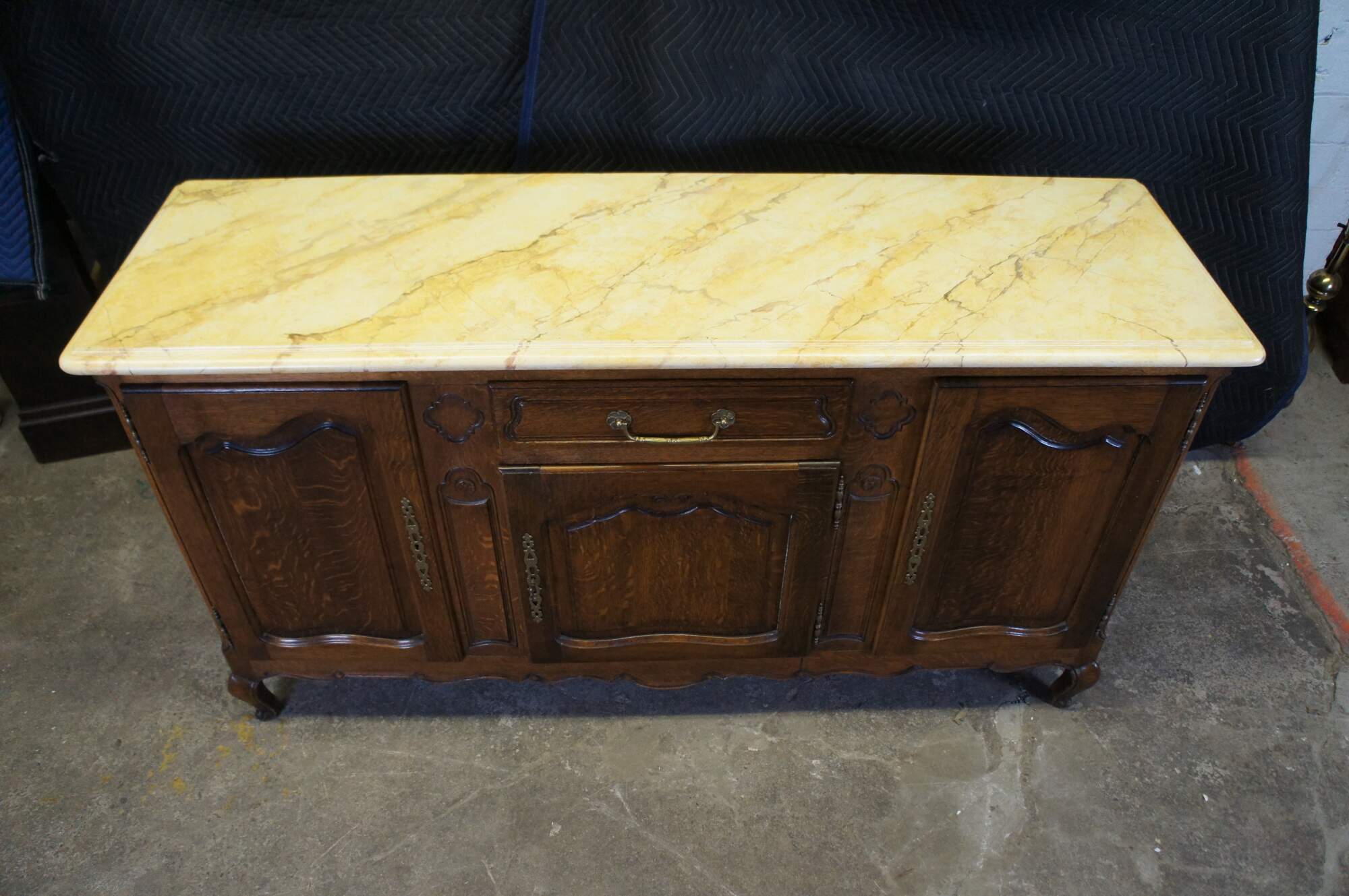 Antique belgian made oak sideboard. Features French Provincial styling with quartersawn (tiger) oak panelling and yellow / off-white faux marble top. Includes 3 lockable cabinets, central drawer for flatware. scalloped and scrolled accents. The cabinet is supported by cabriole legs flanking a lower serpentine cut apron.