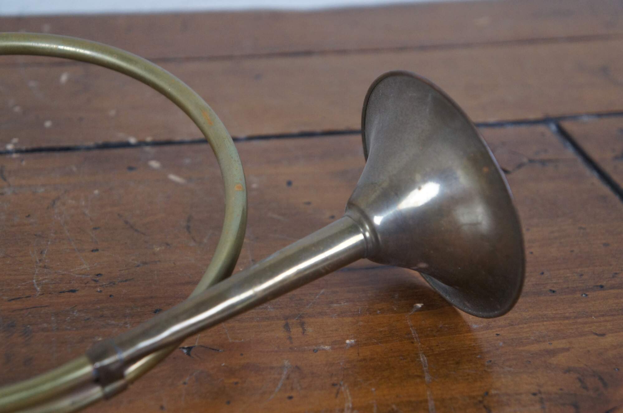 Pair of mid to late 20th century brass French hunting horns/ bugle / instruments, perfect for reenactment or a Christmas display. One large and one small.