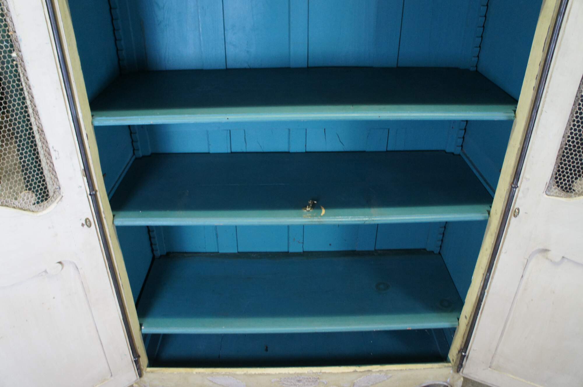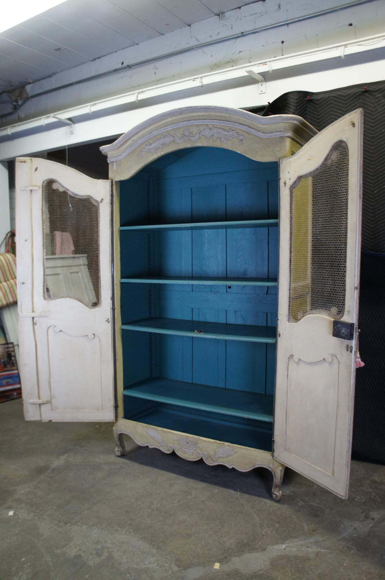 Antique late 18th Century French armoire. Featuring a blend of Country French and Provincial styling with floral and acanthus accents, chicken wire drape doors with long iron hinge, and cabriole legs. Opens to blue painted interior with four shelves and optional linen drapes to cover doors.