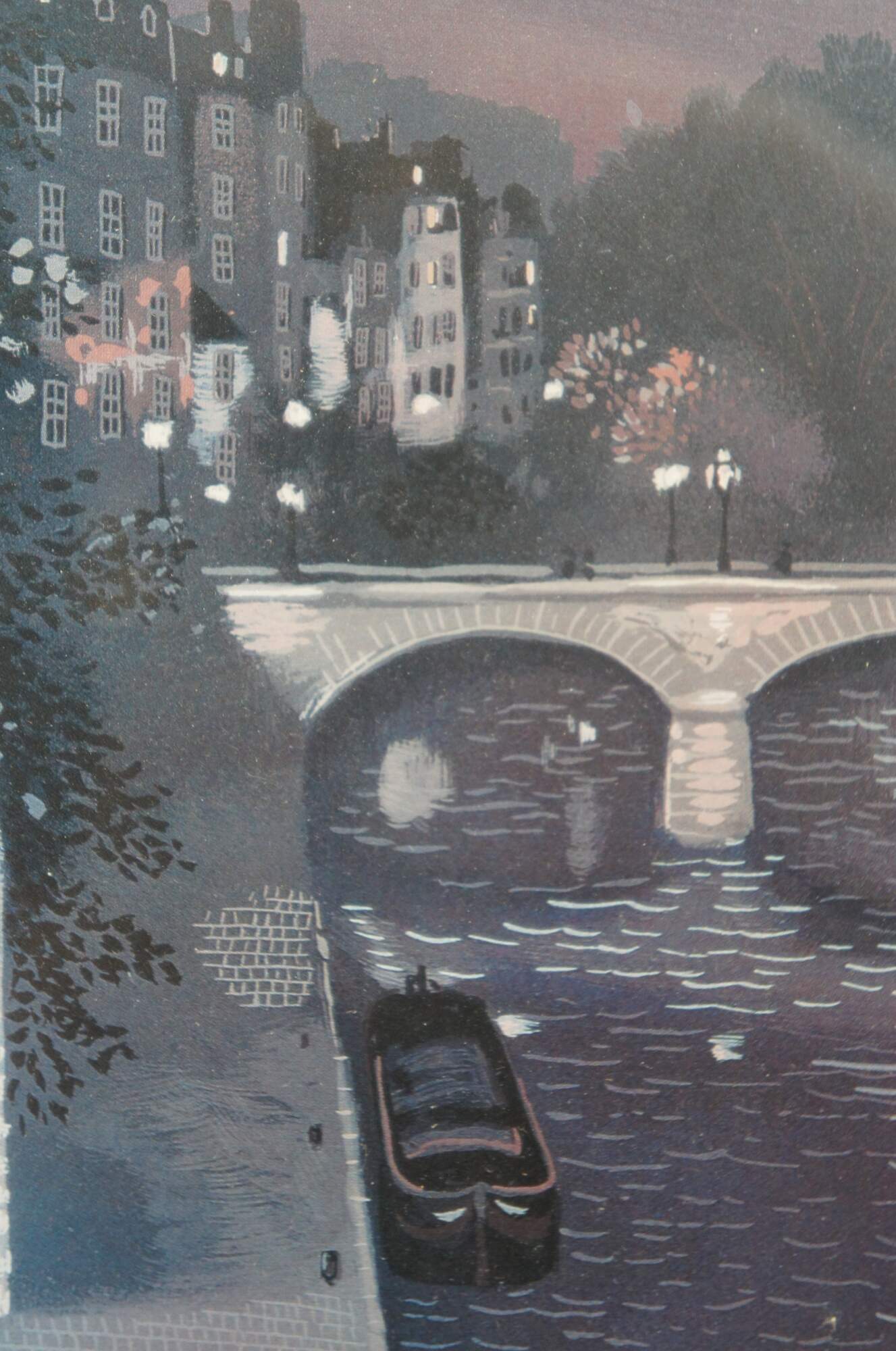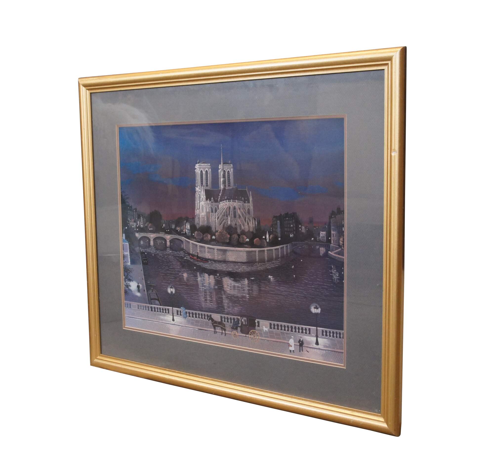 Late 20th century lithograph poster print titled "Le Chevet de Notre Dame la Nuit" (Our Lady's Bedside at Night) by Michel Delacroix. Depicts a nighttime view of the Cathedral of Notre Dame in Paris seen from Ile Saint-Louis. Genesis Galleries Inc, Certificate of Authenticity - Registration No. 08277. Brown and gray layered may; gilt frame with rounded bevel.