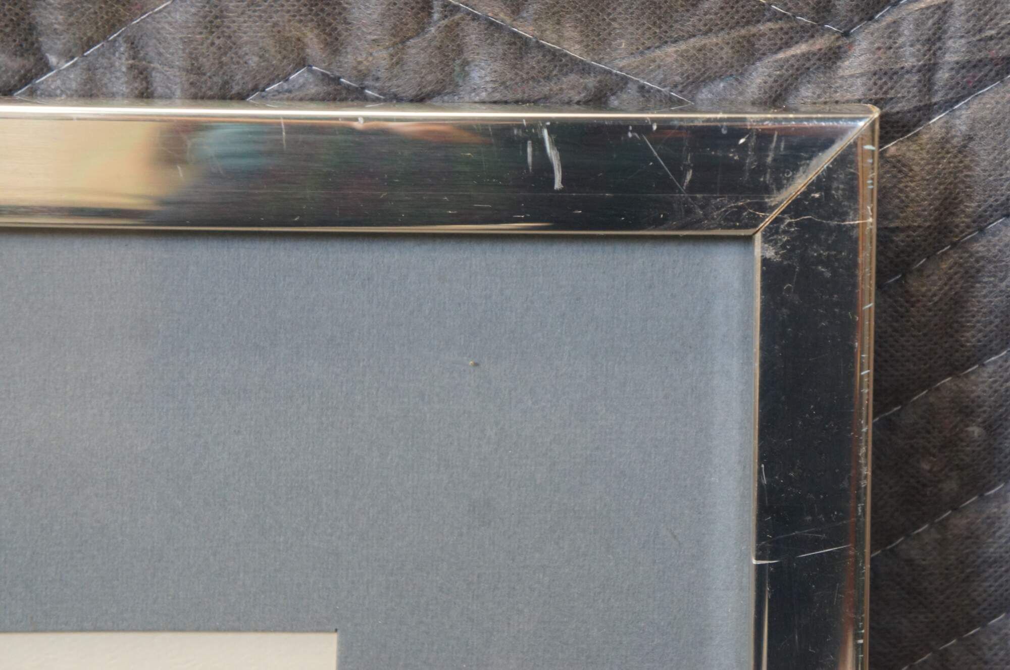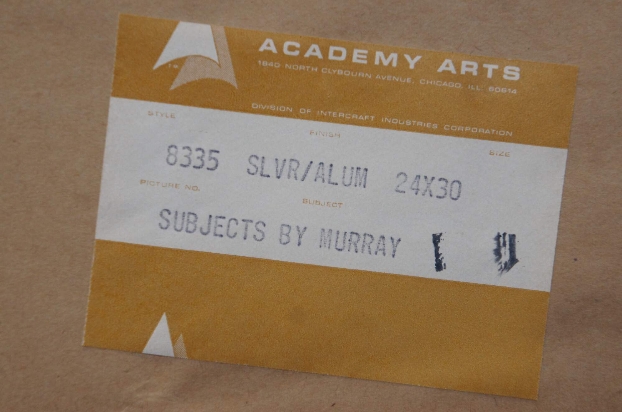 Late 20th century black and white lithograph print titled "Windy" by Alan Murray, showing the laughing face of two windswept children. Signed in plate Murray '77. Distributed by Academy Arts - Style 8335 - Finish Silver/Alum - Size 24x30 - Subjects by Murray. Blue gray mat; shiny silver tone metal frame.