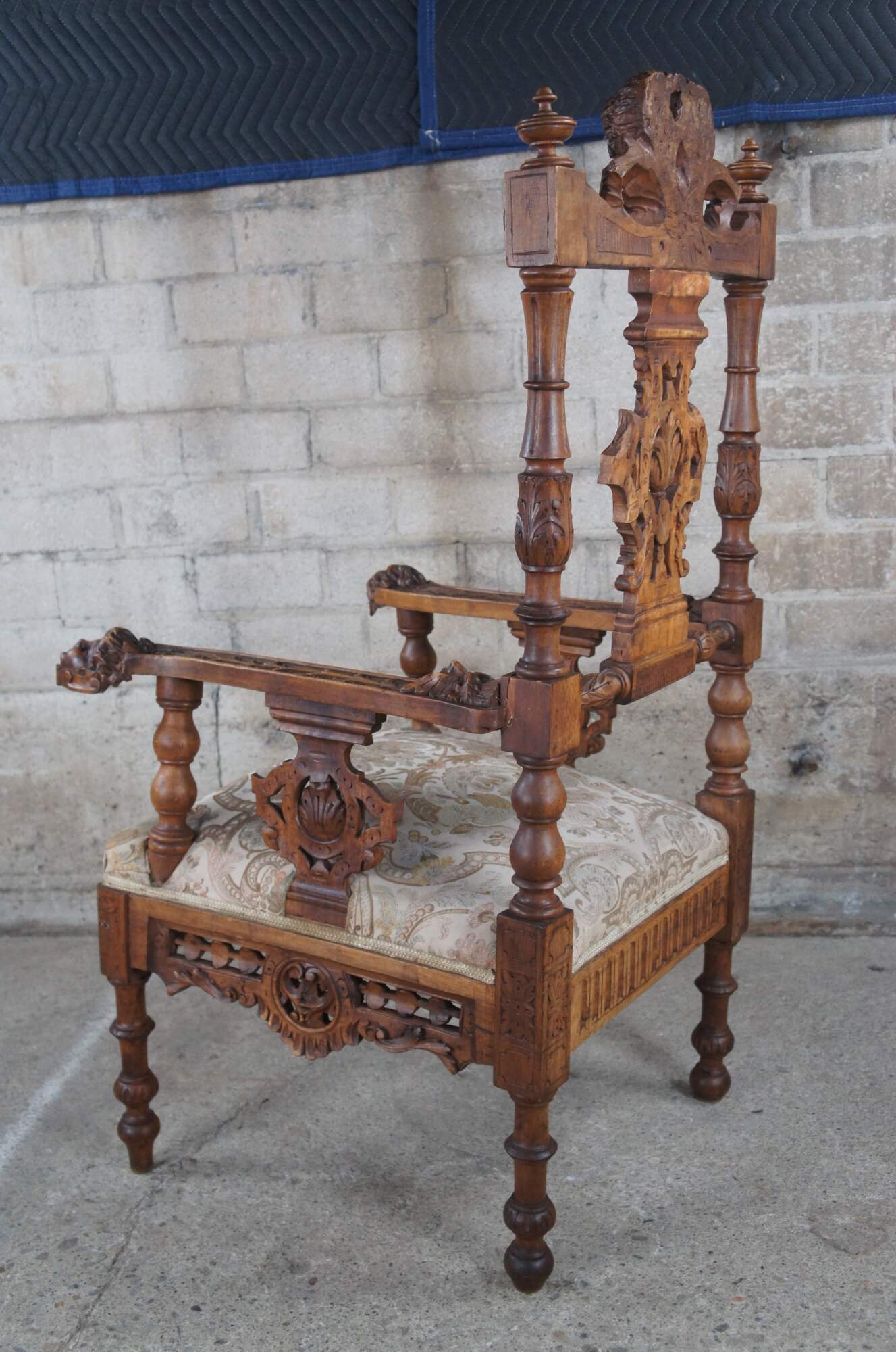 Set of 7 pieces of antique Italian Neo-Renaissance furniture, circa 1870s, including 2 side chairs, 2 corner chairs, 2 arm chairs, and a parlor settee / loveseat. Made of walnut featuring Neoclassical styling with high relief figural carvings of cherubs / puttis, Northwind faces, doves / birds, acanthus / floral and reticulated / pierced accents. The chairs showcase a nice upholstered brocade seat over contoured and reticulated aprons. Legs are turned with arrow feet.