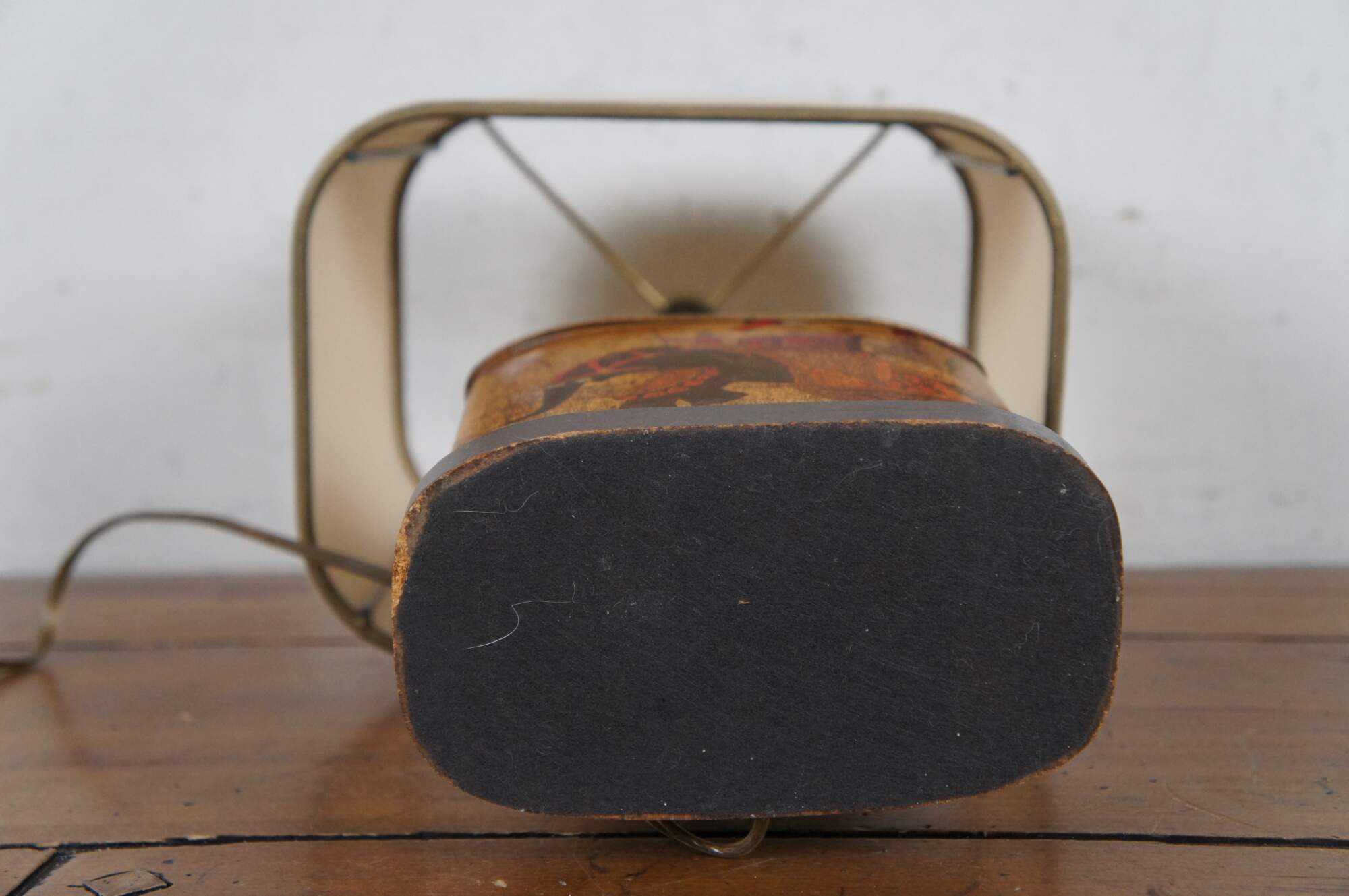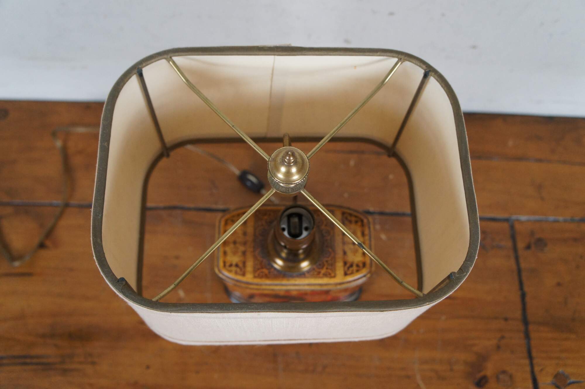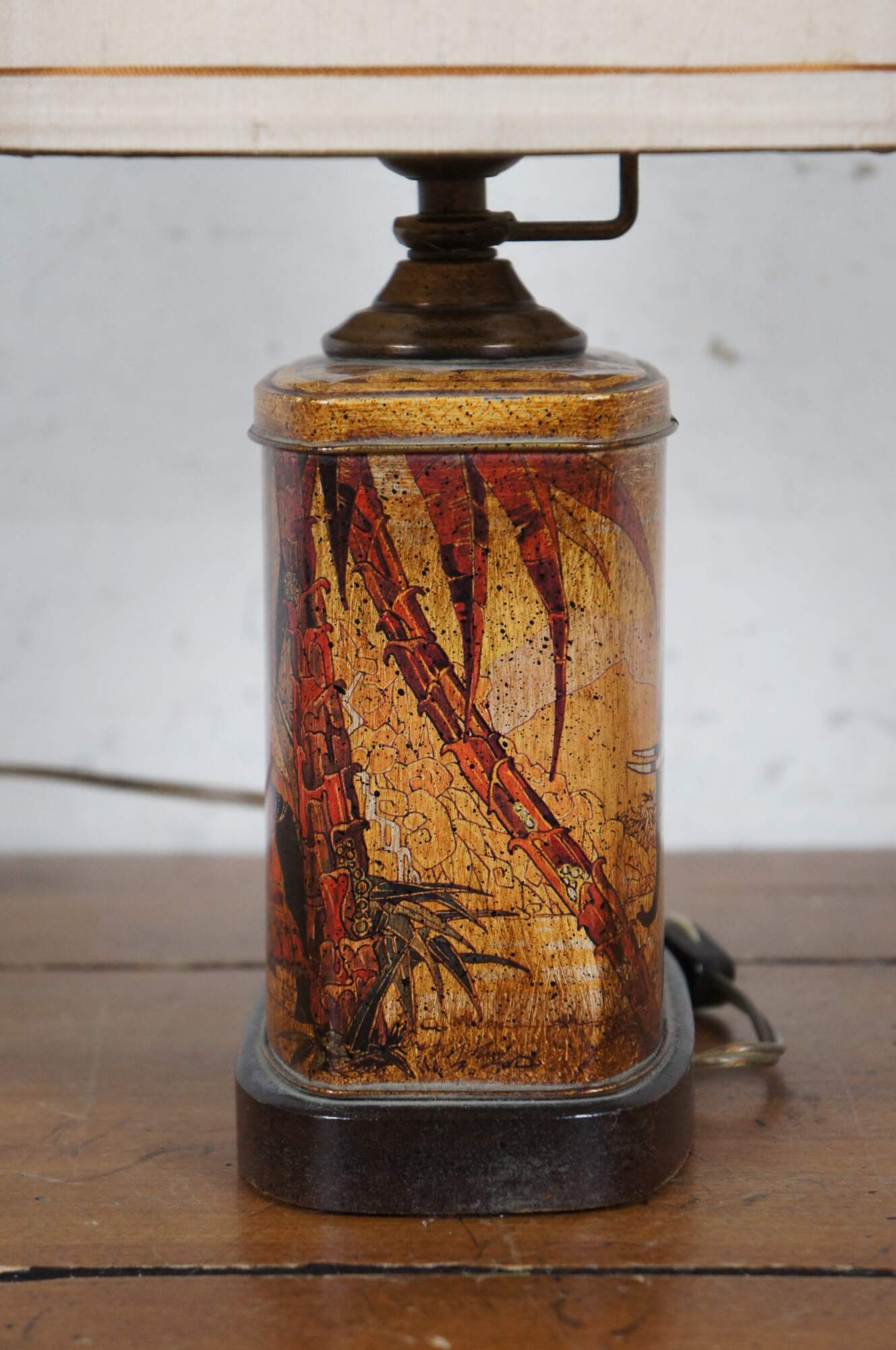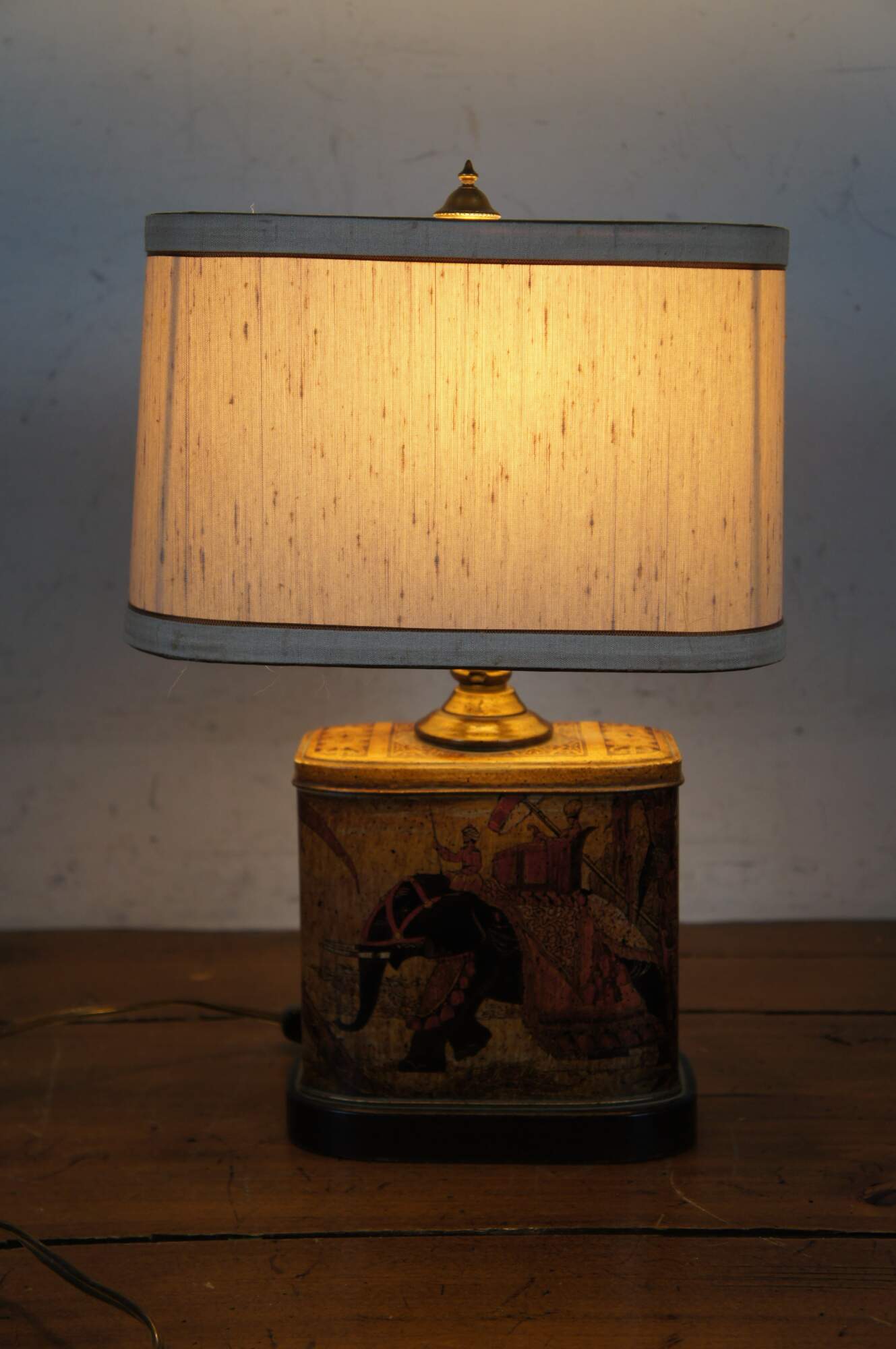Late 20th century Frederick Cooper Wildwood table lamp featuring a wooden base, rectangular tin tea caddy painted with a British Colonial scene of figures riding a howdah on an Indian elephant, and a fixed L shaped harp. Includes gold trimmed, white linen shade and top shaped brass finial.
