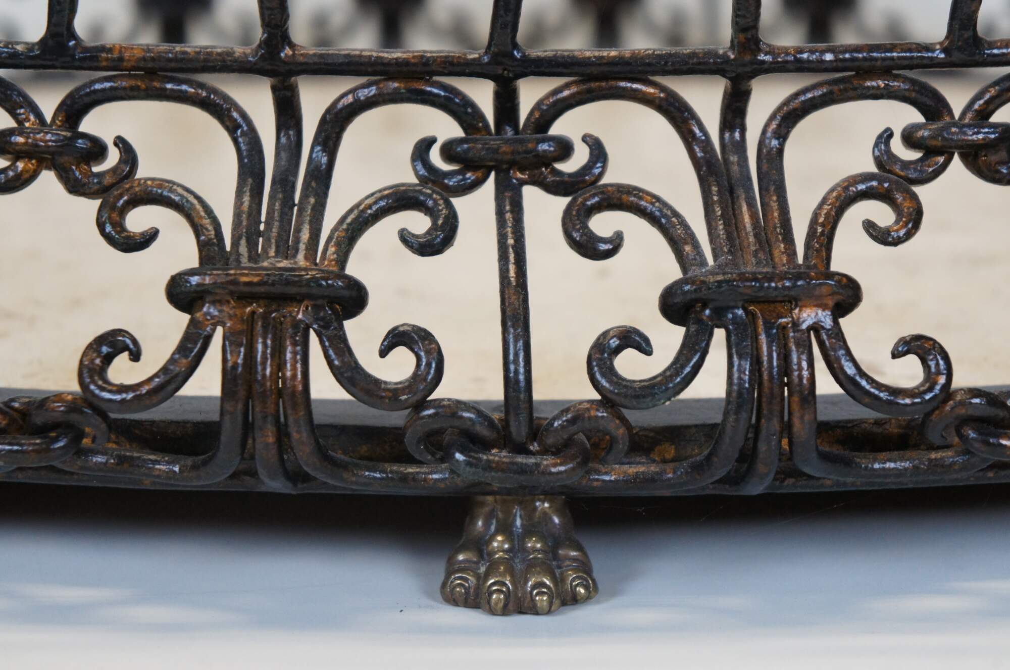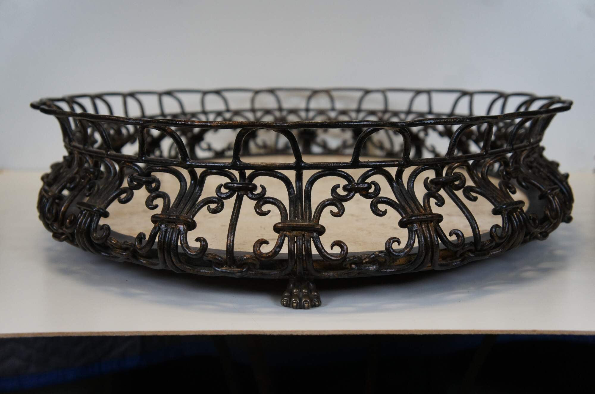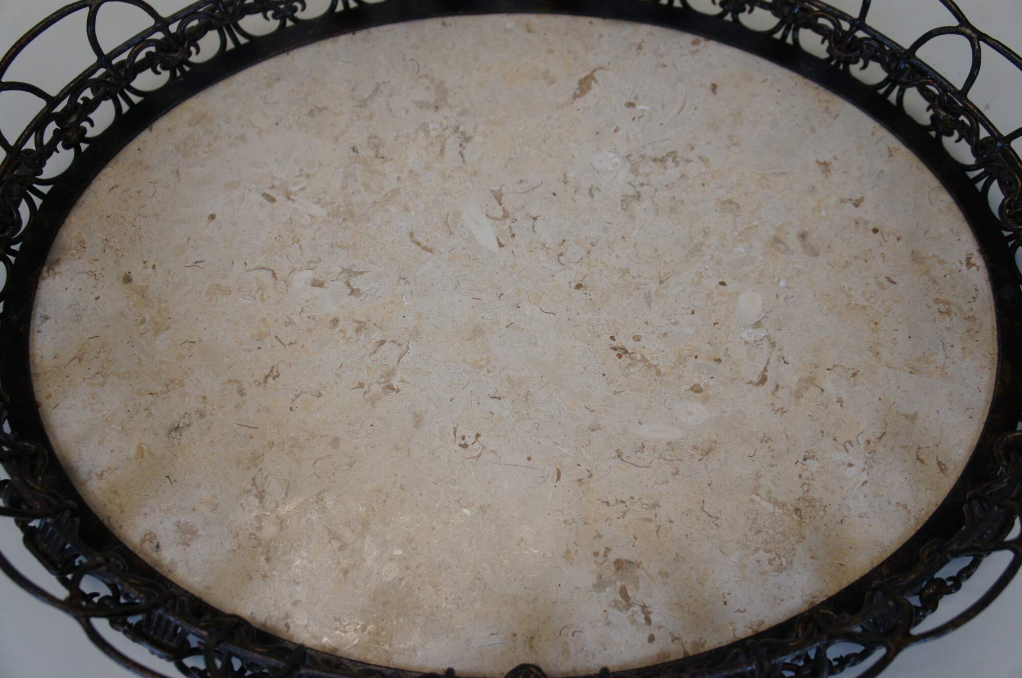 Late 20th century bar serving tray by Maitland Smith - features an oval base of white and beige tavertine marble, surrounded by a flared wrought iron gallery of fleur de lis, standing on four lion's paw feet. Sticker on base. Hand Made in Philippines.