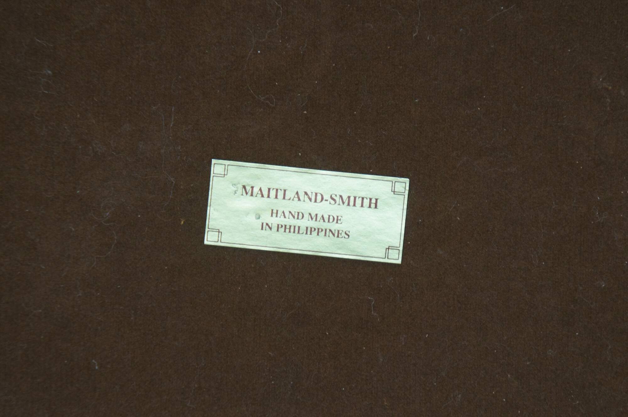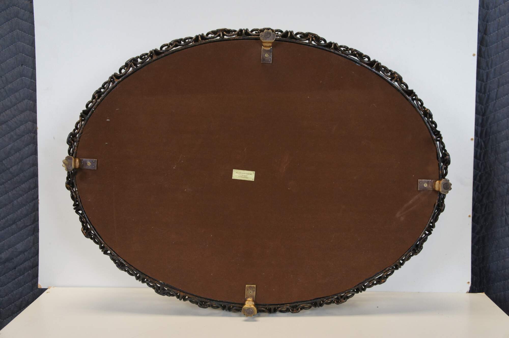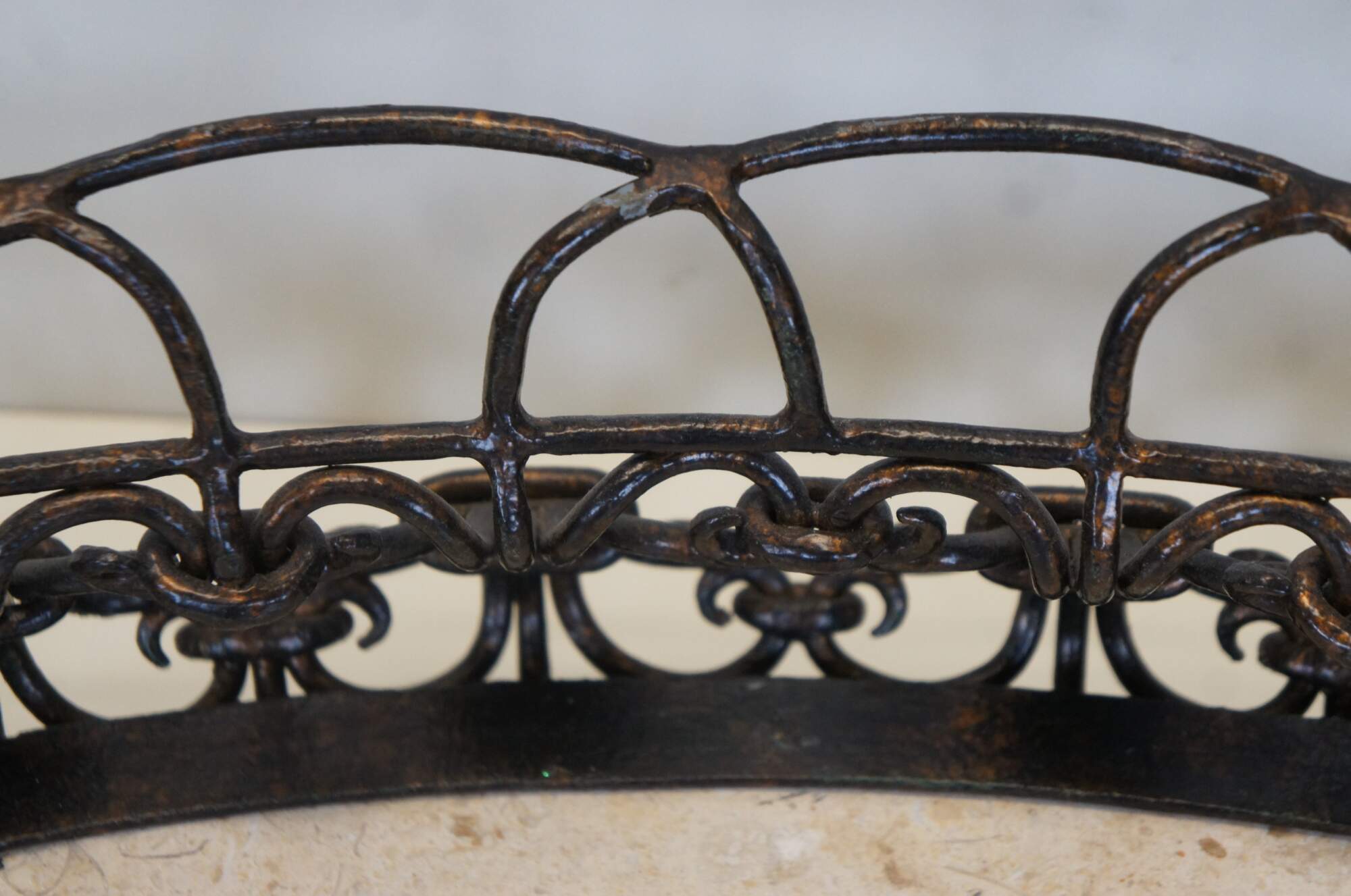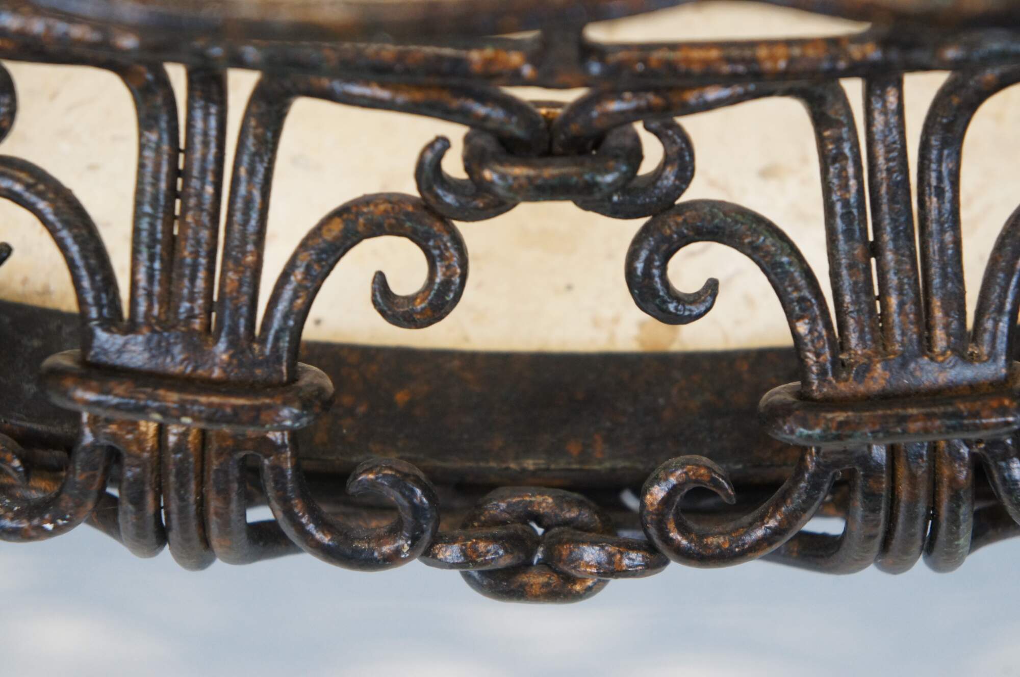 Late 20th century bar serving tray by Maitland Smith - features an oval base of white and beige tavertine marble, surrounded by a flared wrought iron gallery of fleur de lis, standing on four lion's paw feet. Sticker on base. Hand Made in Philippines.