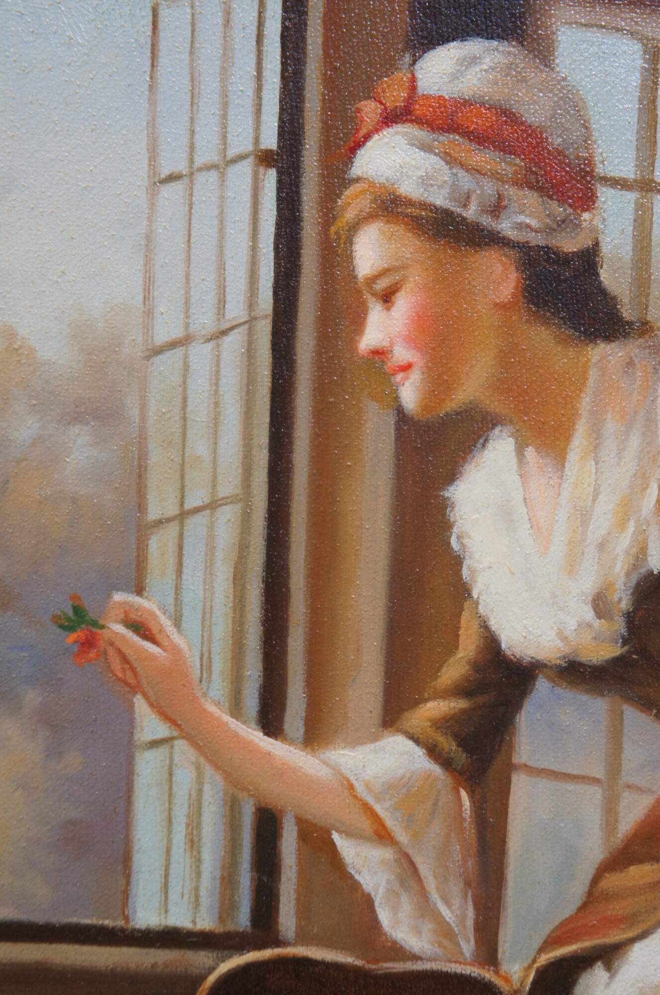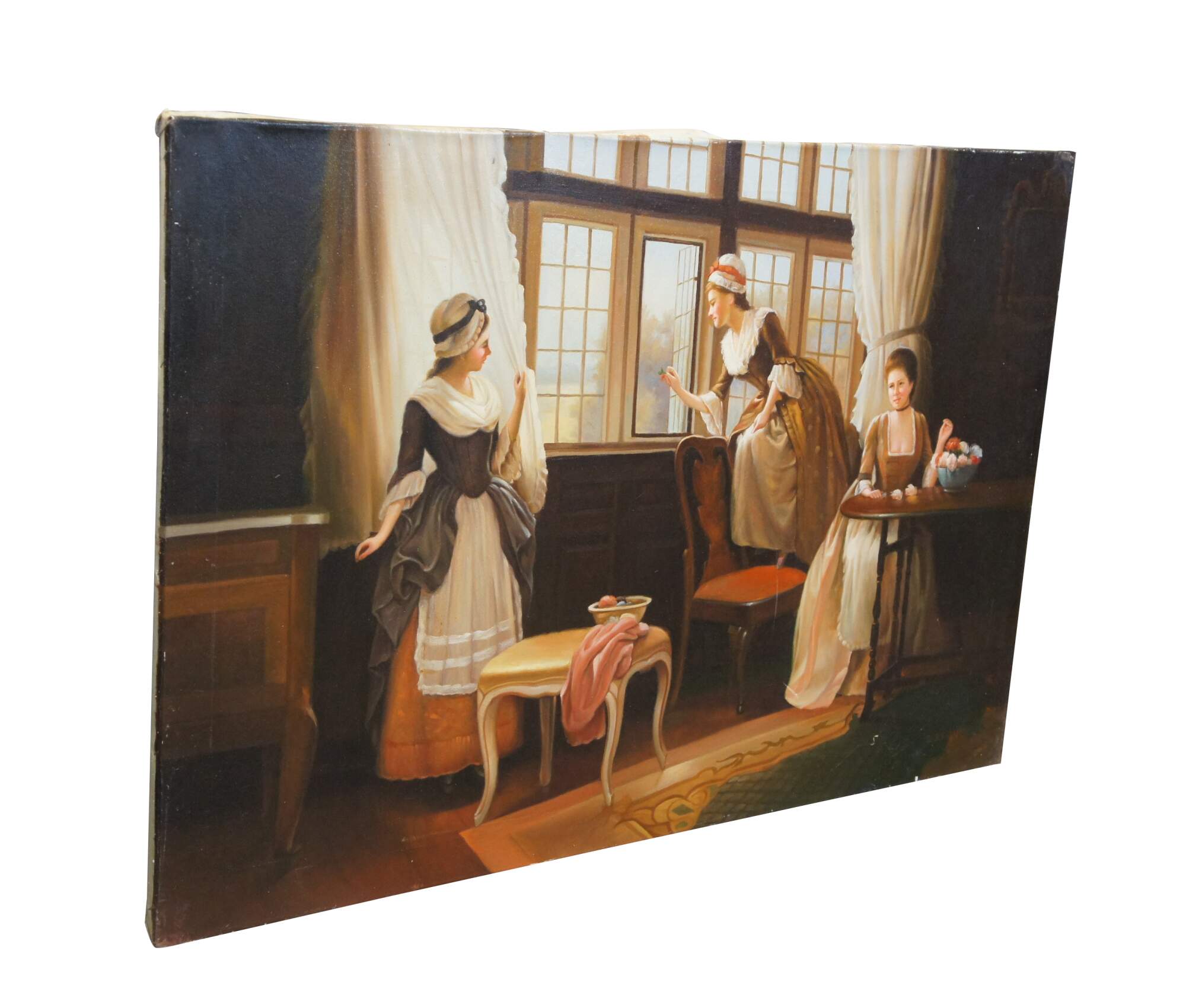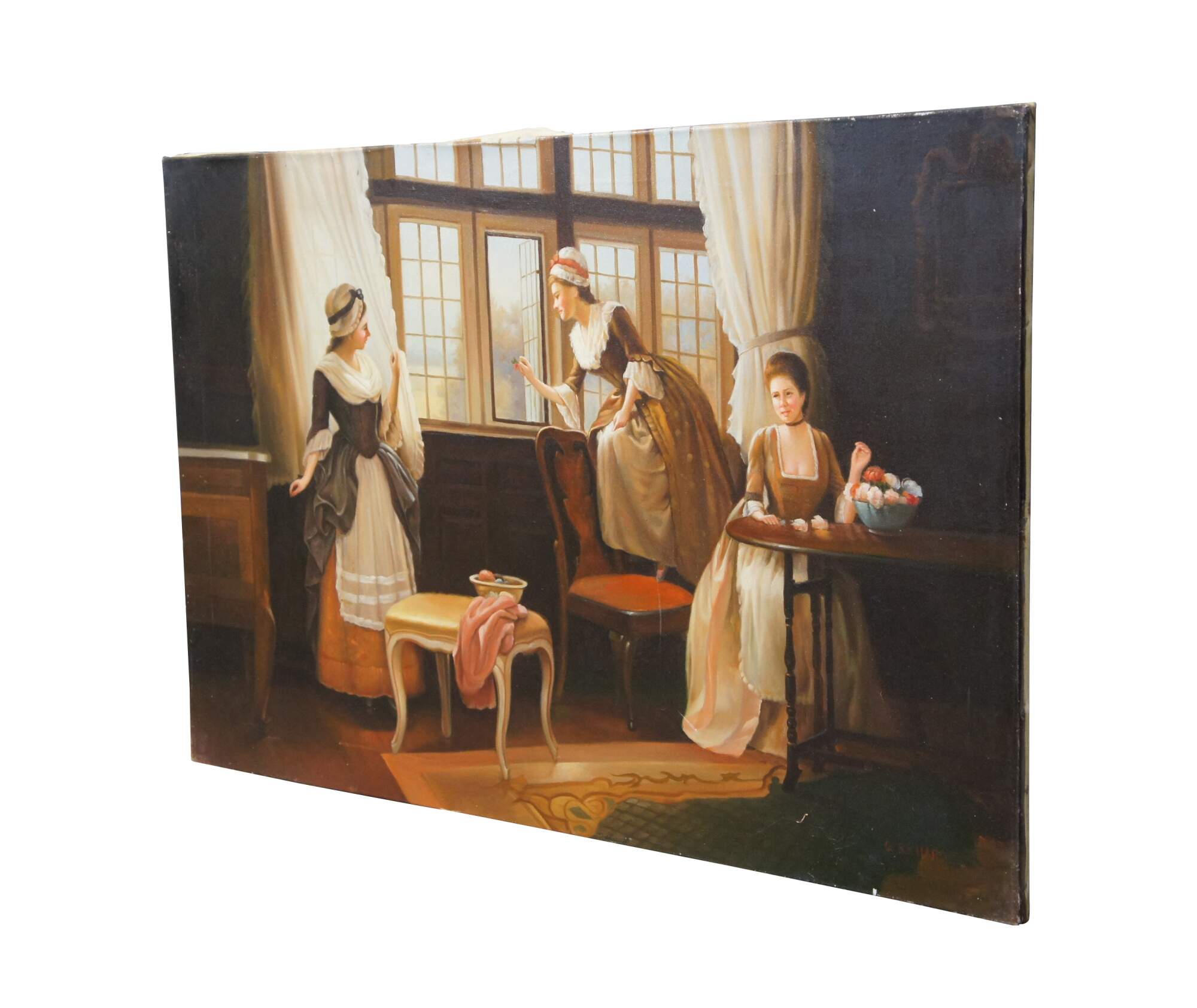 Late 20th century reproduction oil on canvas painting styled after Charles Haigh Wood's 1897 work "Fair Deceivers," depicting a trio of upper class ladies in an elegant parlour, one leaning to toss a flower out an open window. Signed Q. Richard in lower right corner.