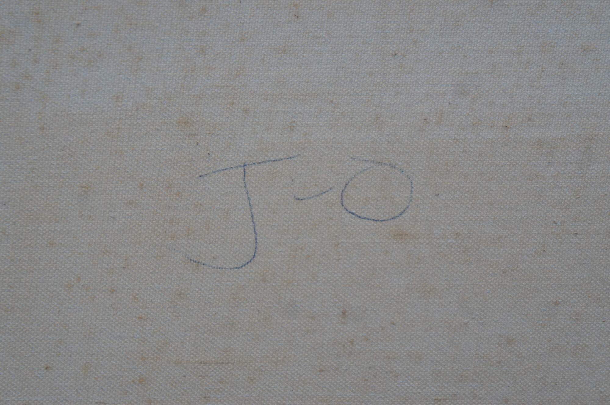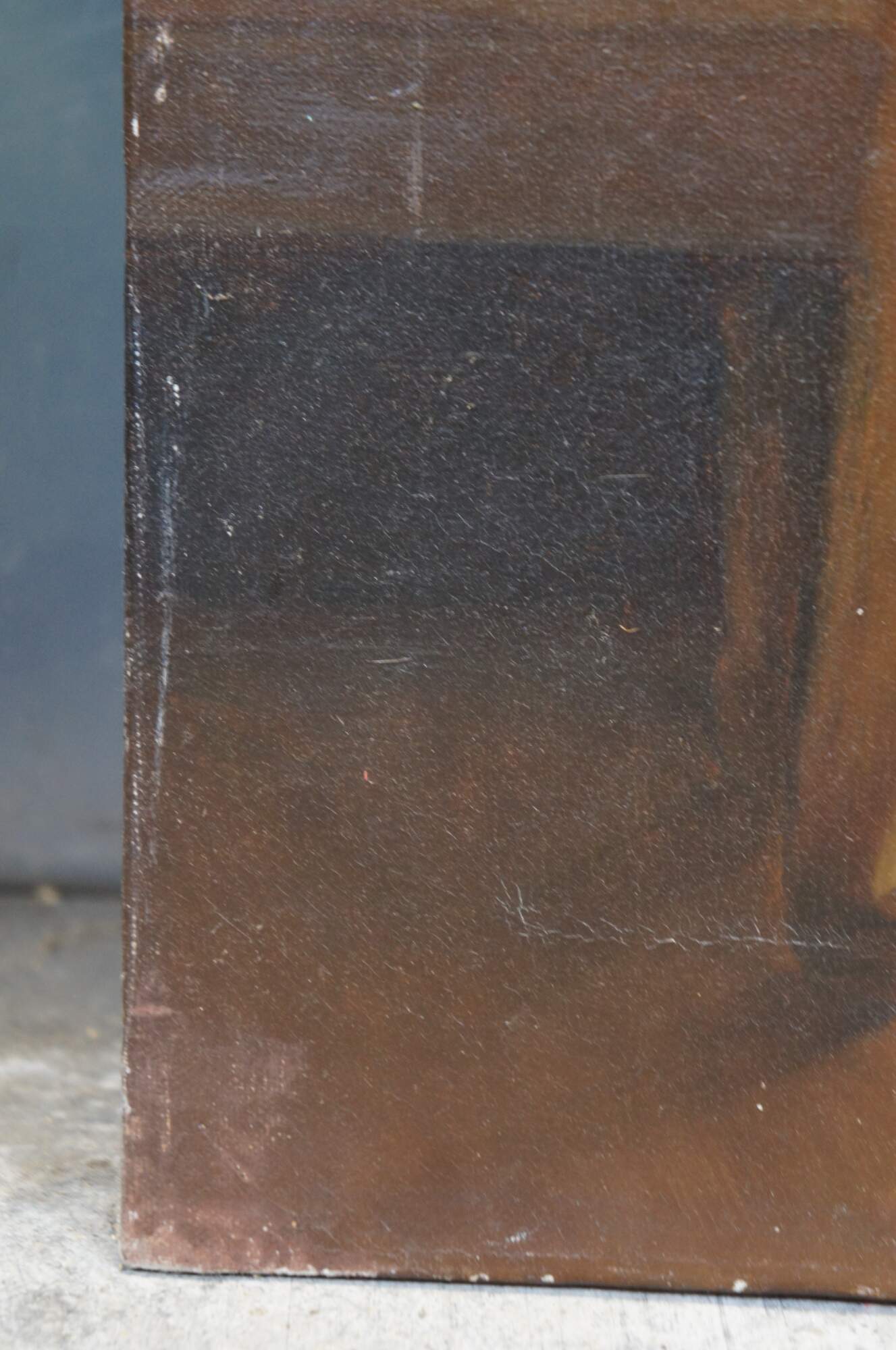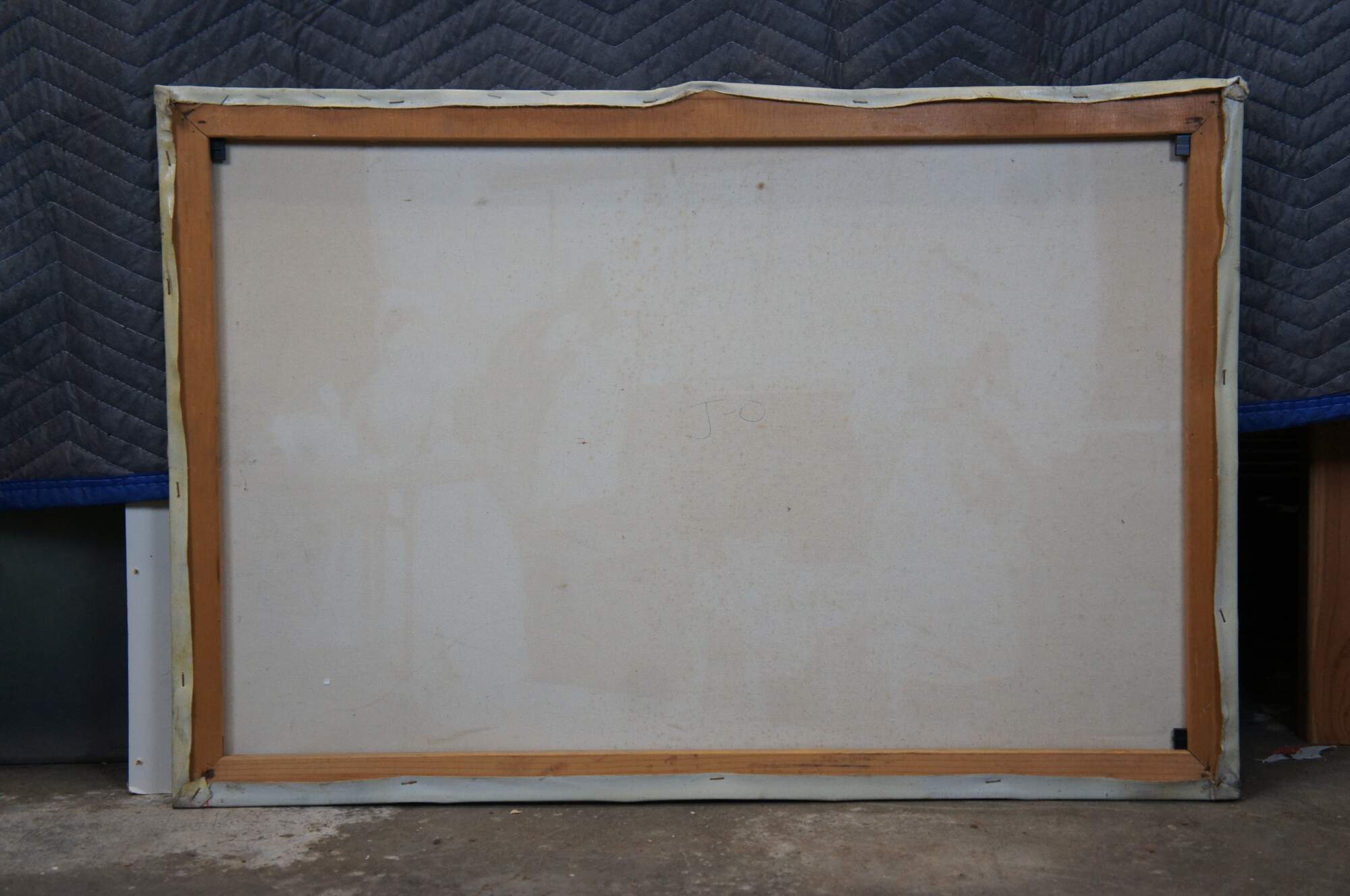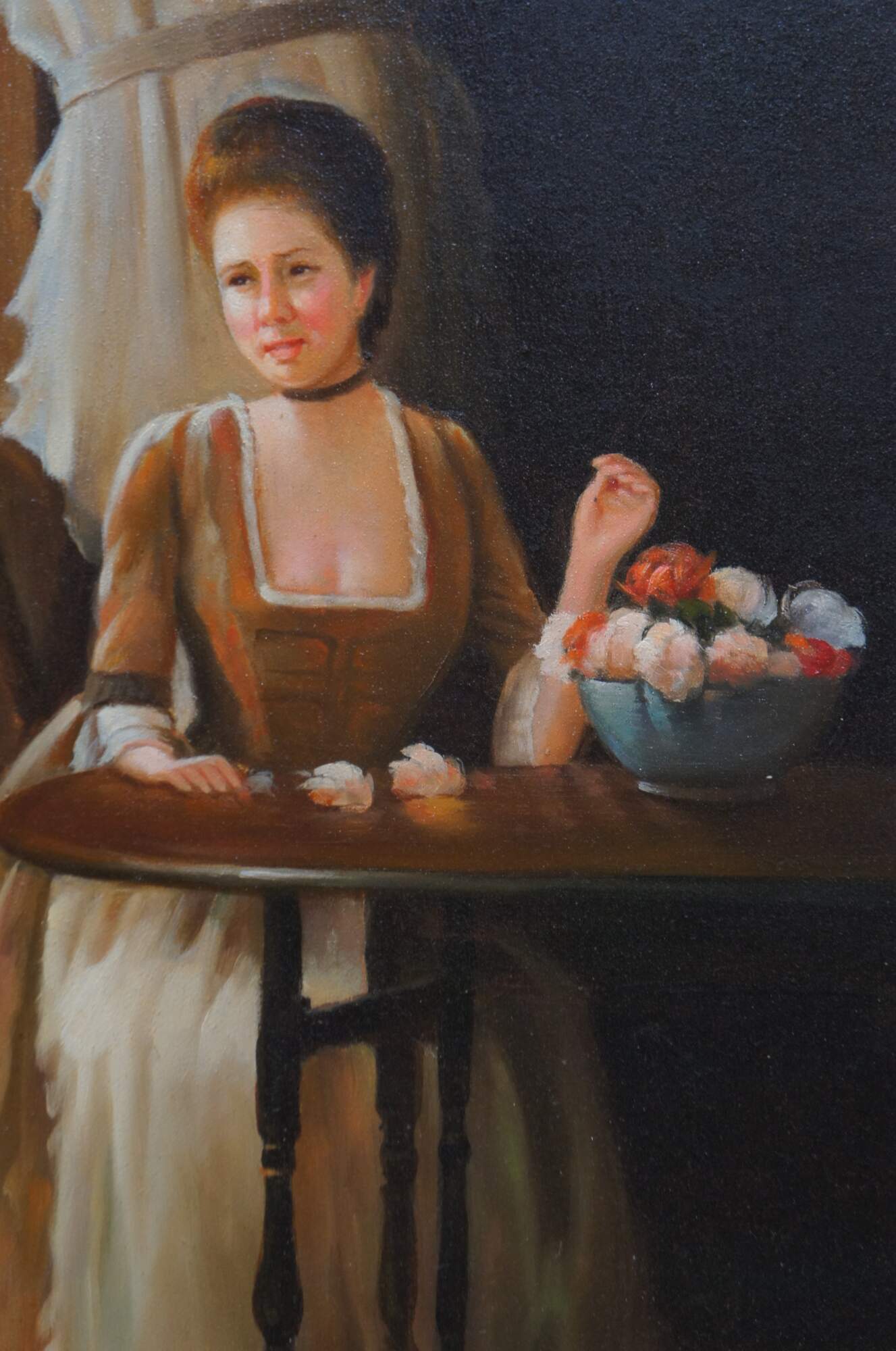 Late 20th century reproduction oil on canvas painting styled after Charles Haigh Wood's 1897 work "Fair Deceivers," depicting a trio of upper class ladies in an elegant parlour, one leaning to toss a flower out an open window. Signed Q. Richard in lower right corner.