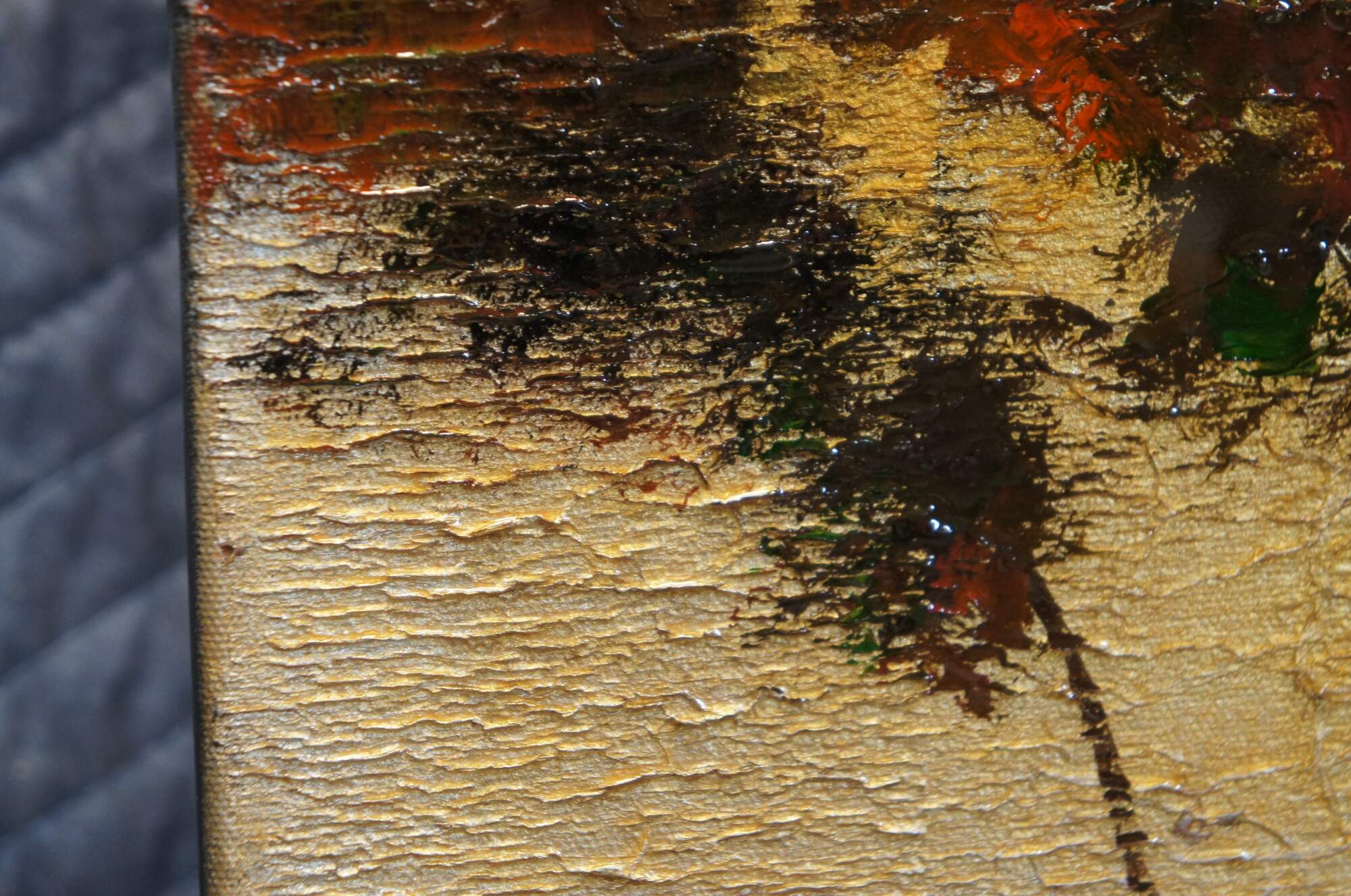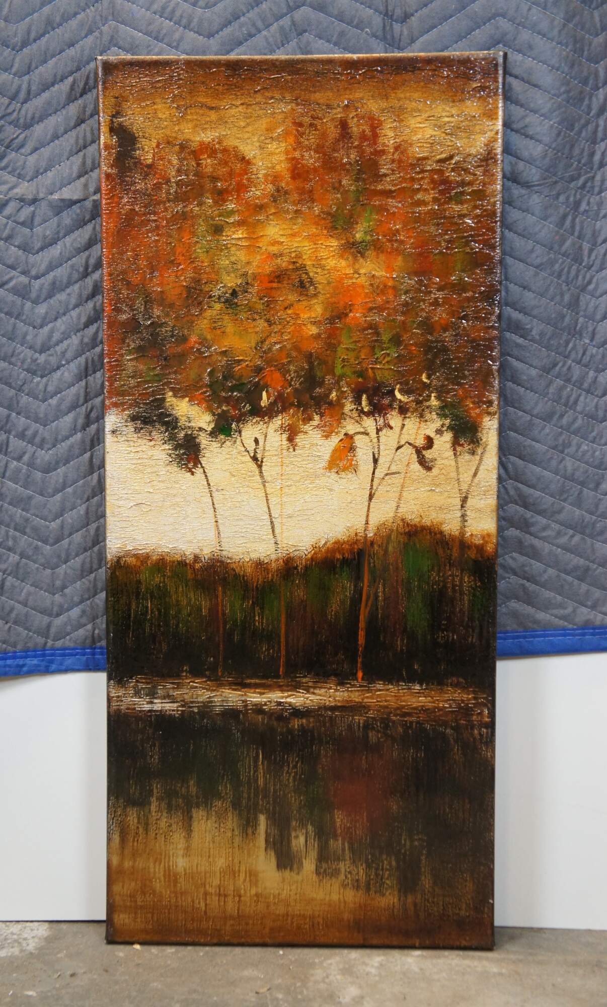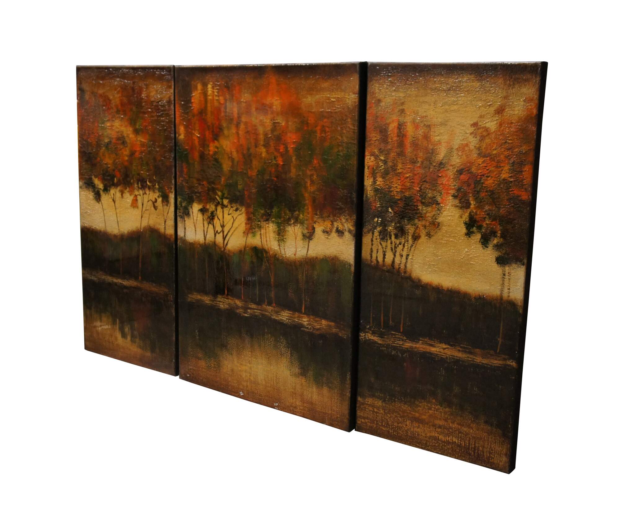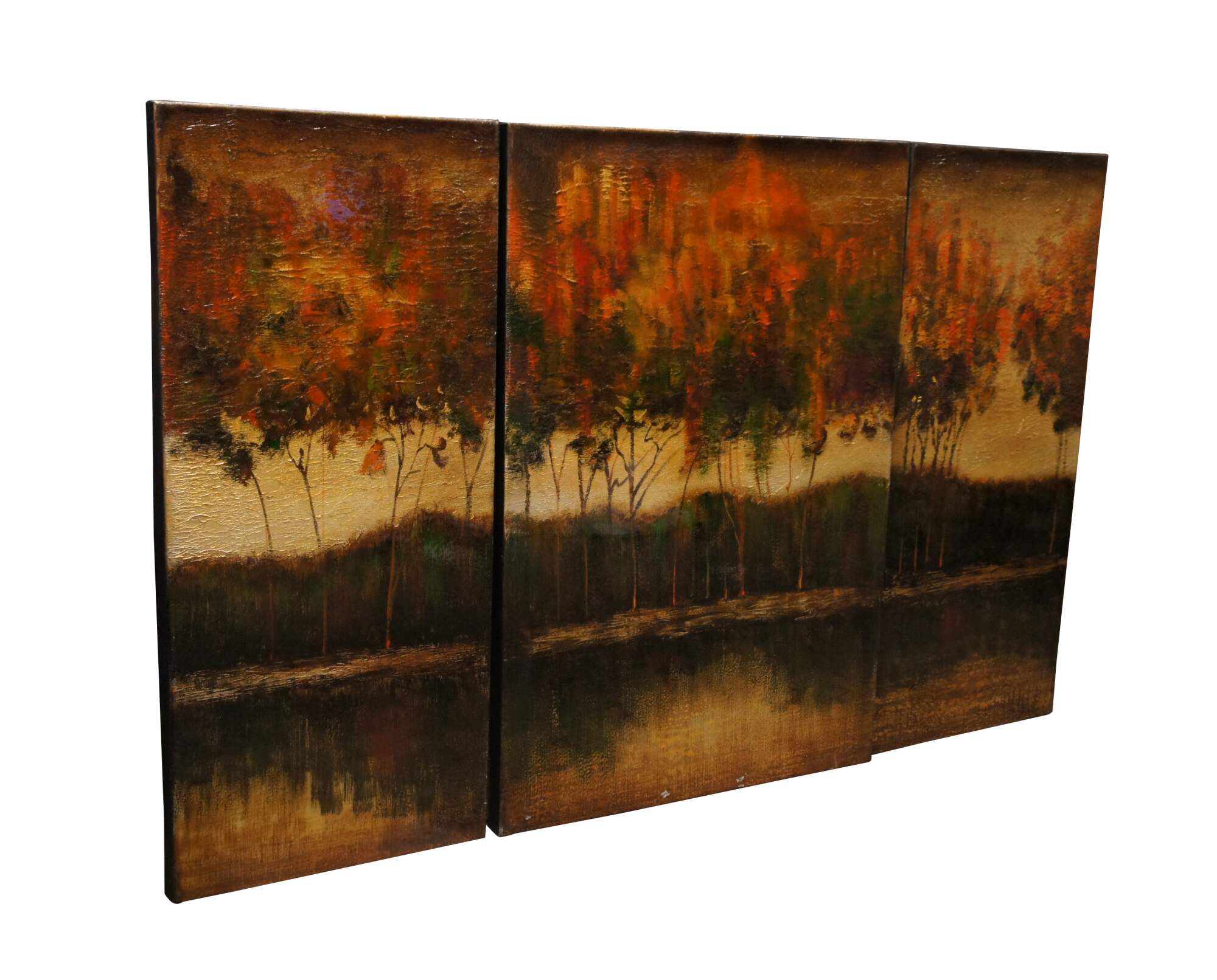 Beautiful riverscape / landscape wall art by Uttermost. This three canvas un framed triptych depicts a slightly abstracted / impressionist style scene of slender trees in rich, dark autumn colors at the edge of a broad river, accented with metallic pigments. 34207. Made in China.