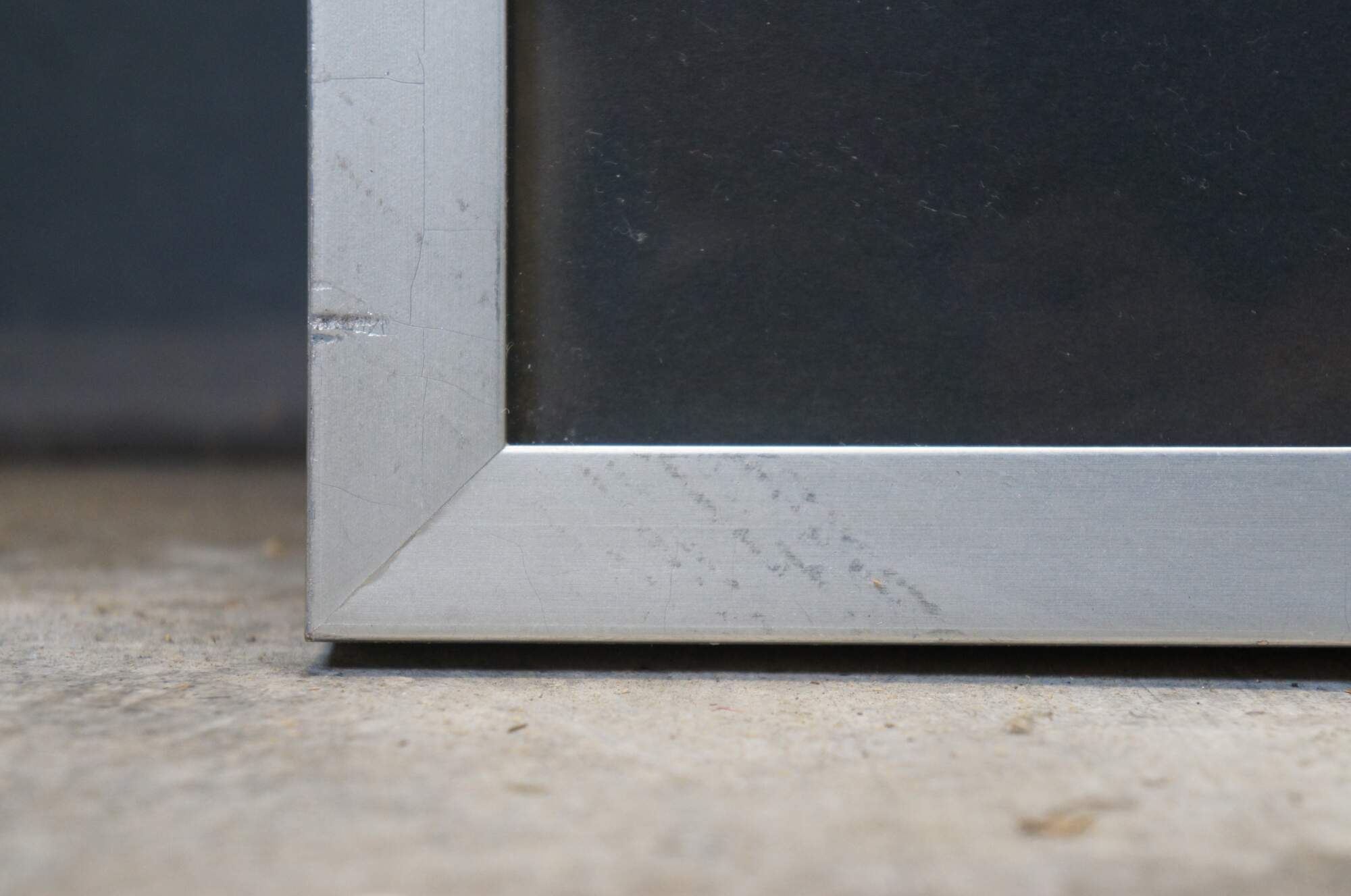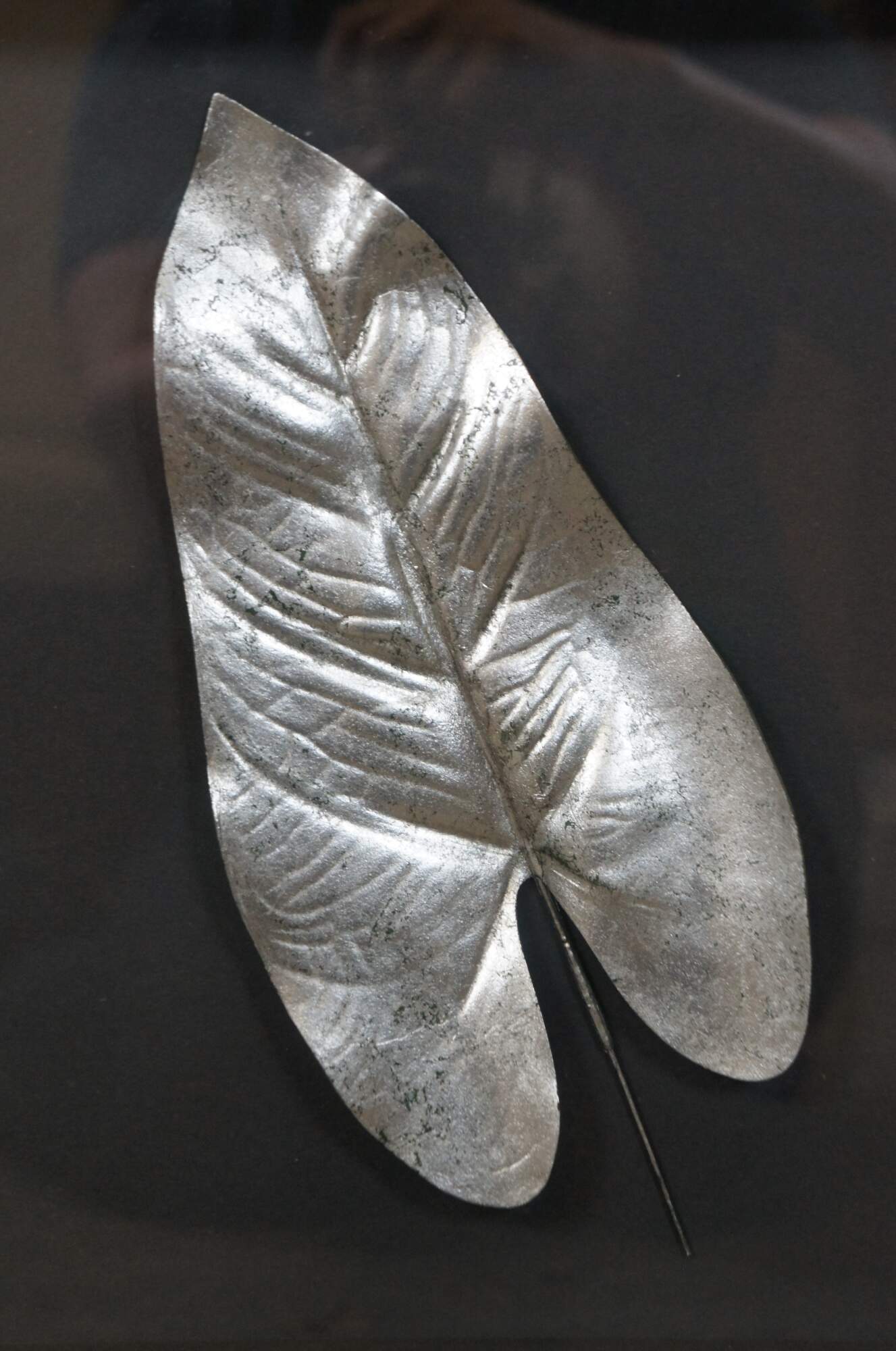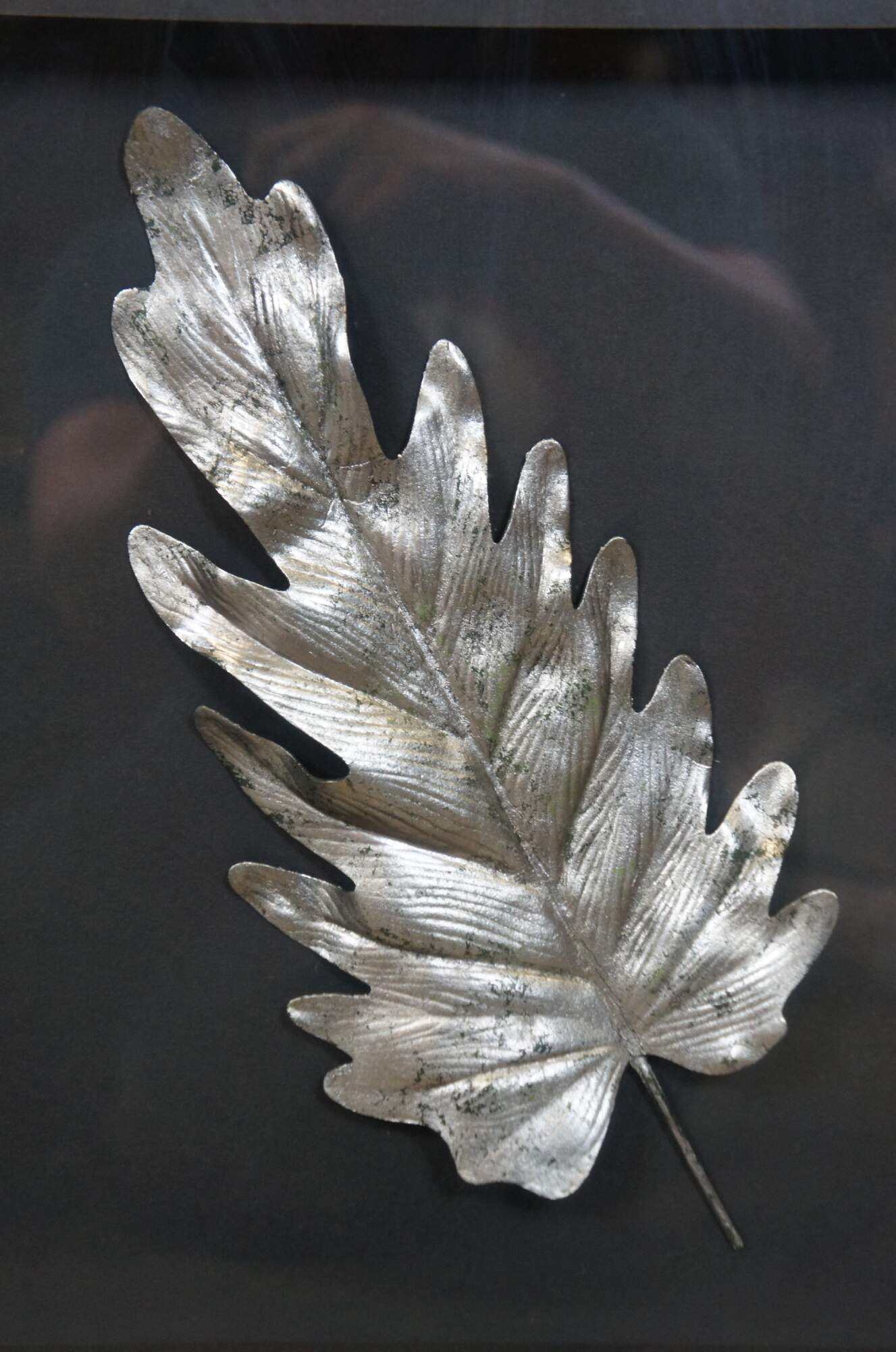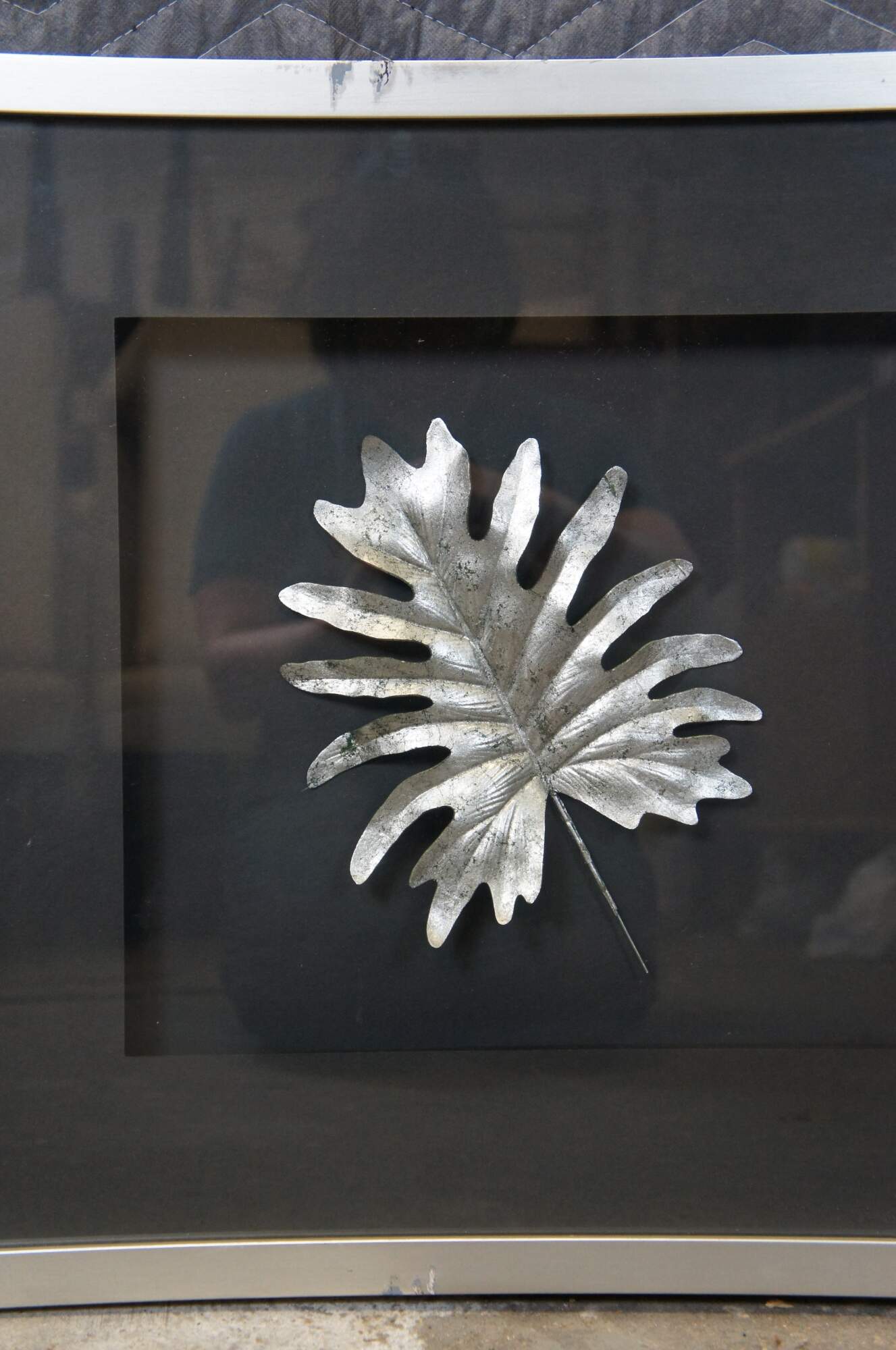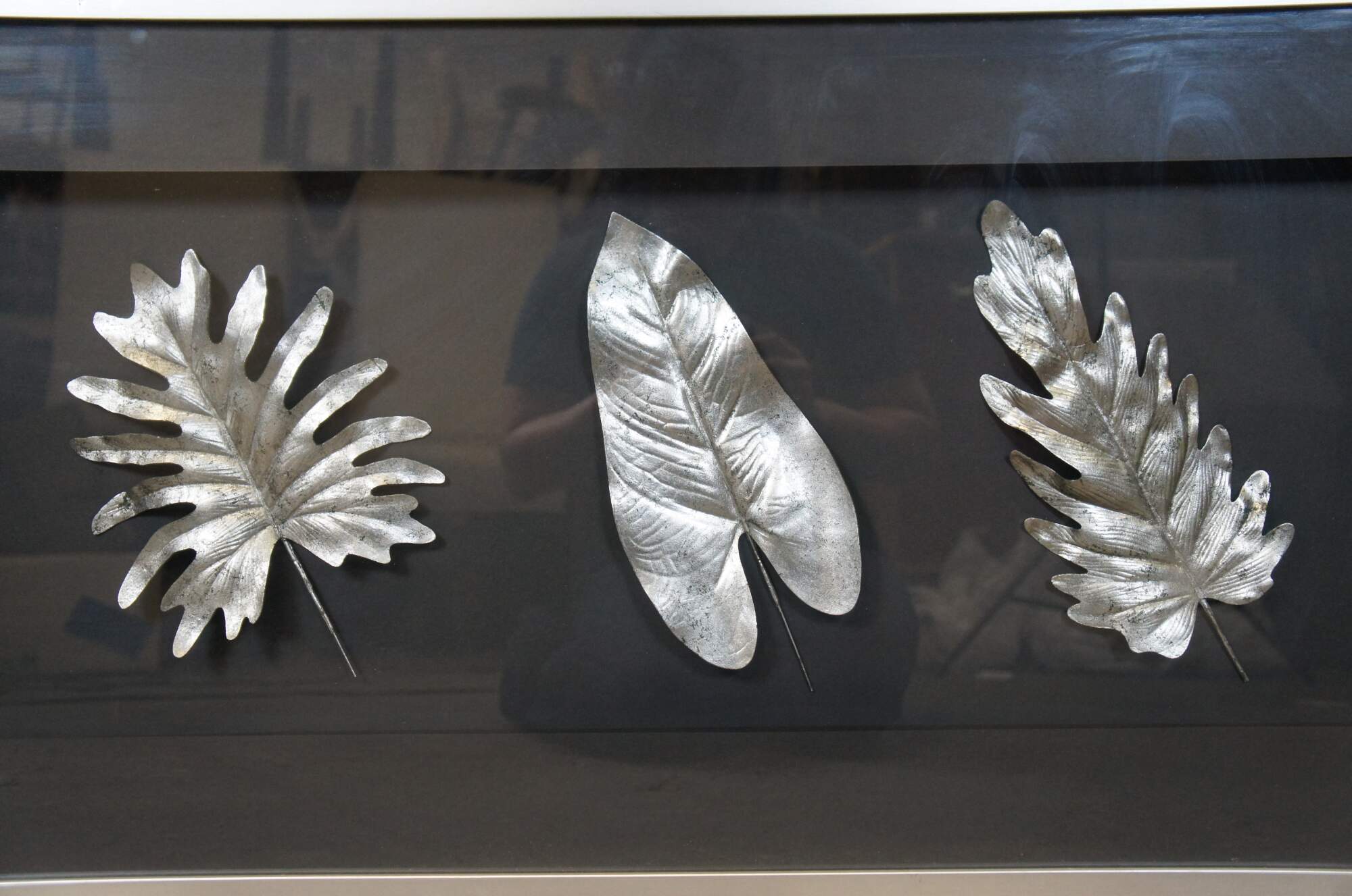 Modern shadowbox wall art by Grace Feyock for Uttermost depicting a trio of silver toned meatl leaves mounted in a black matted shadowbox with a plain brushed silver frame. 10053.