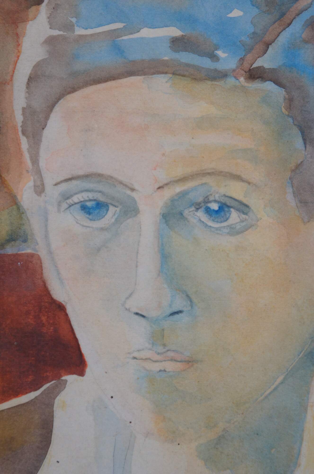 Vintage 20th century watercolor on paper portrait painting of a man seated in an armchair behind a window. Beveled giltwood frame with lightly carved edge.