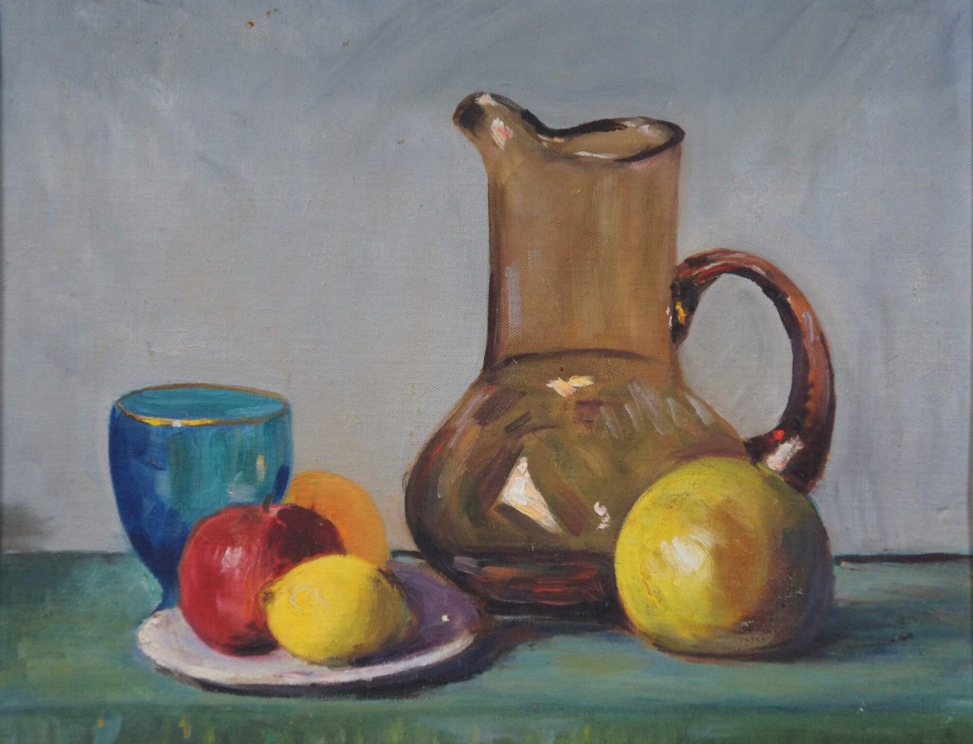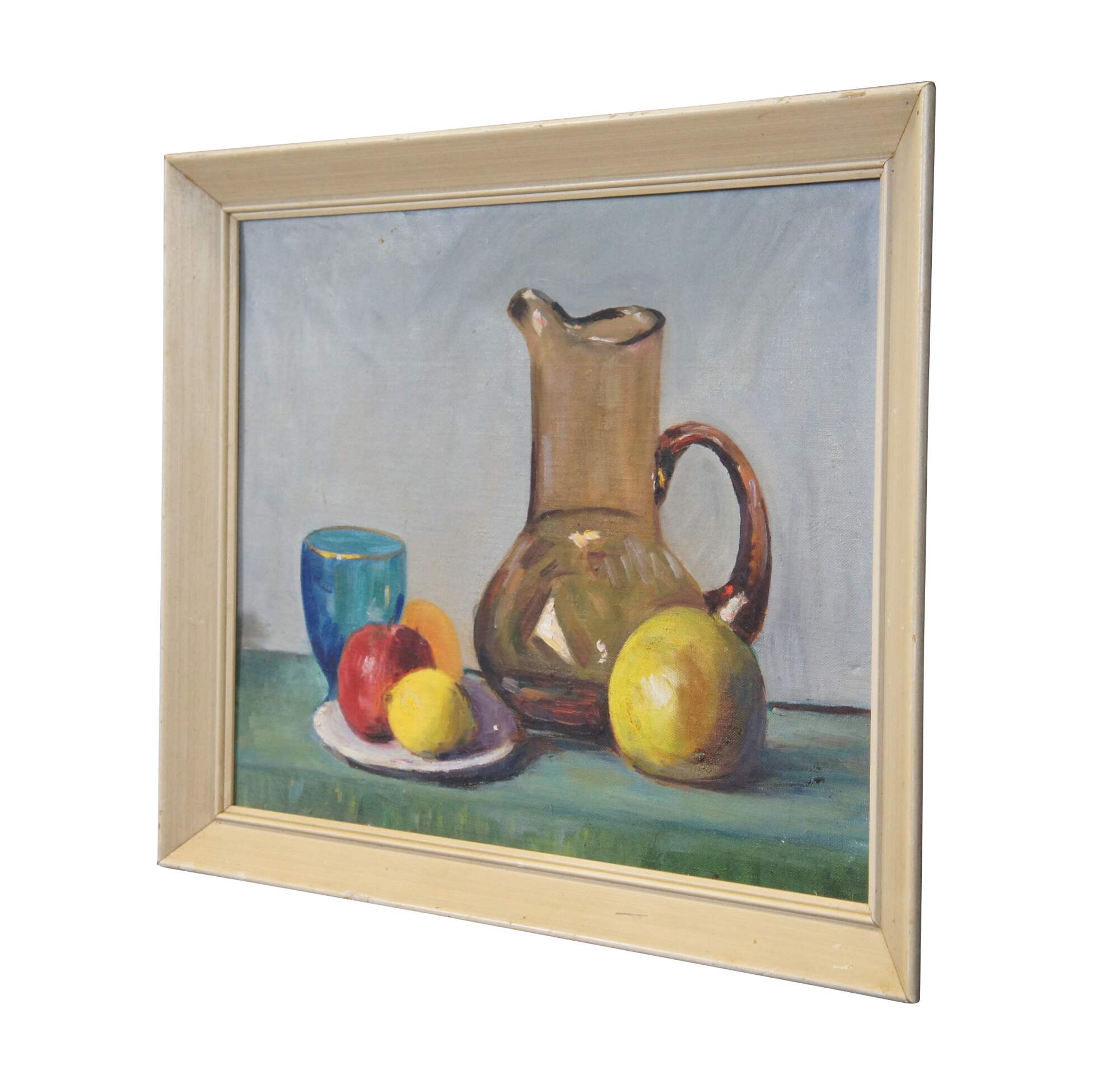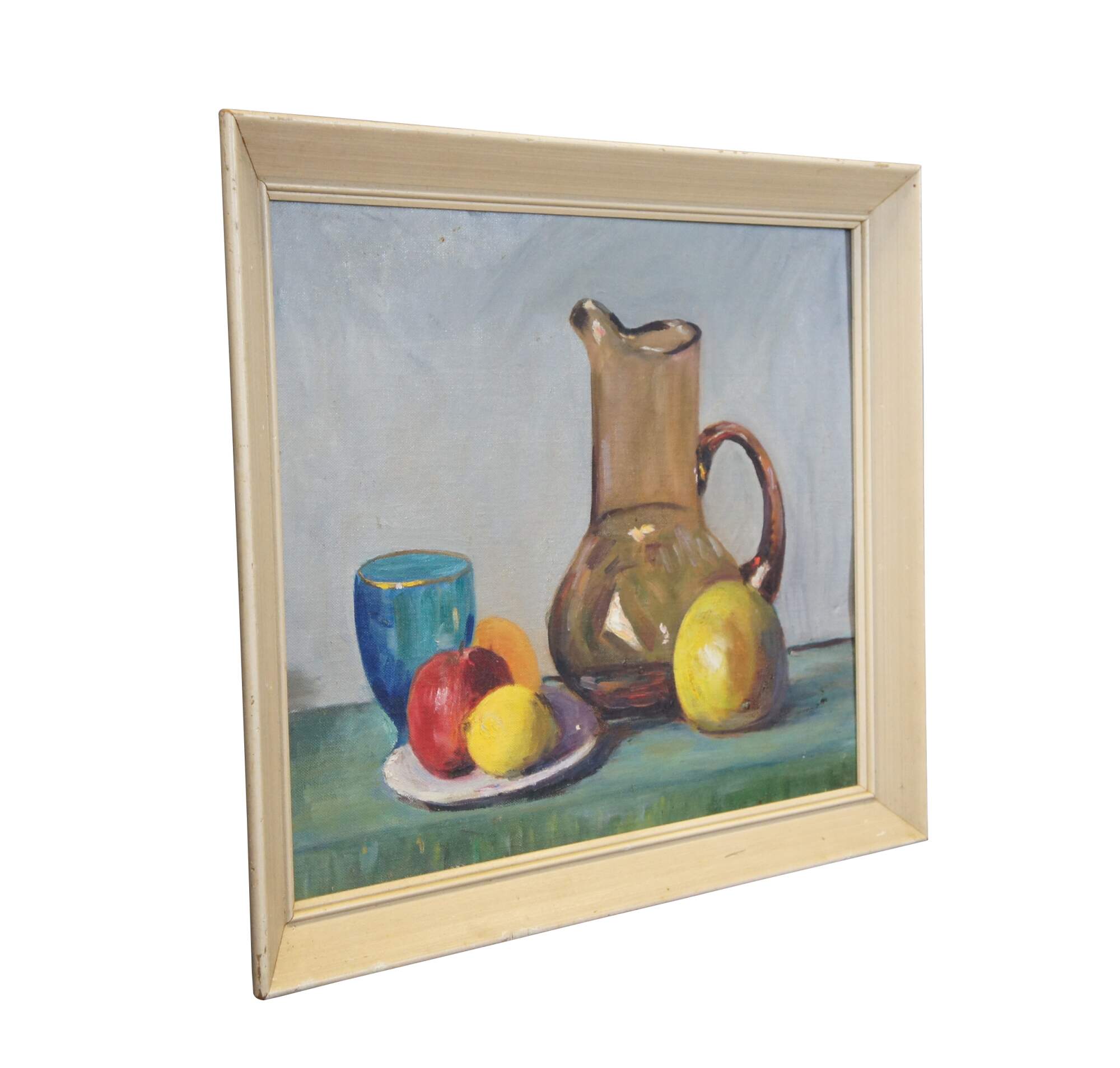 Mid to late 20th century oil on canvas board still life painting by Mrs Everett J Thomas (L. Thomas) of Fort Wayne, Indiana. Depicts a still life featuring a glass pitcher and goblet with a plate of fruit. Beveled pickled oak / off white painted frame.