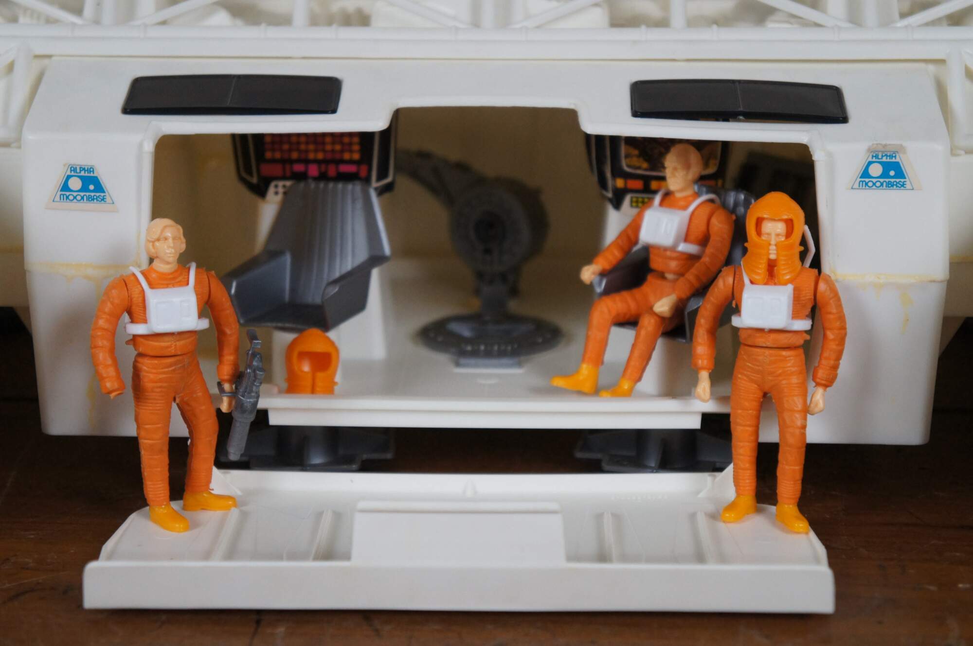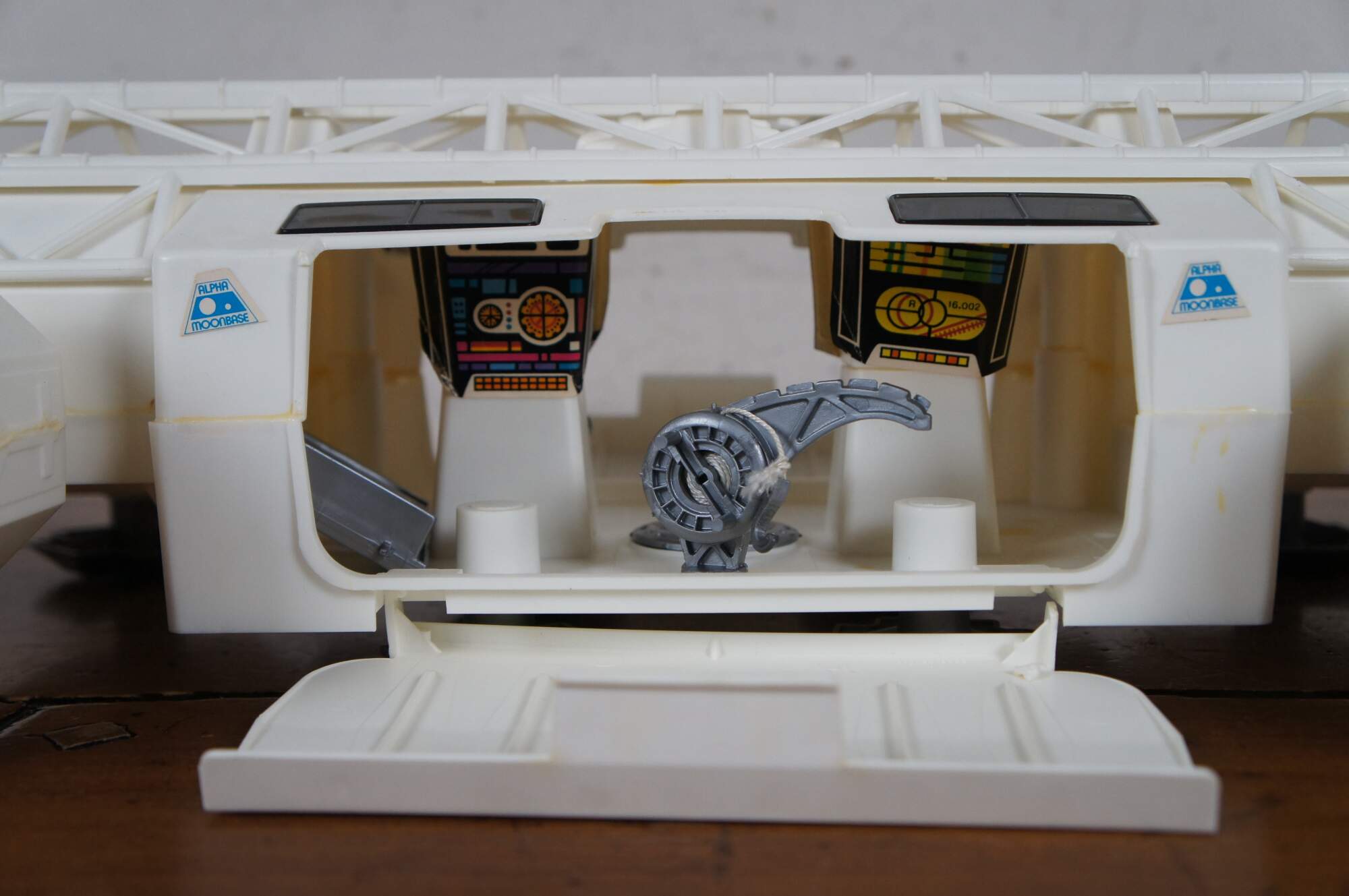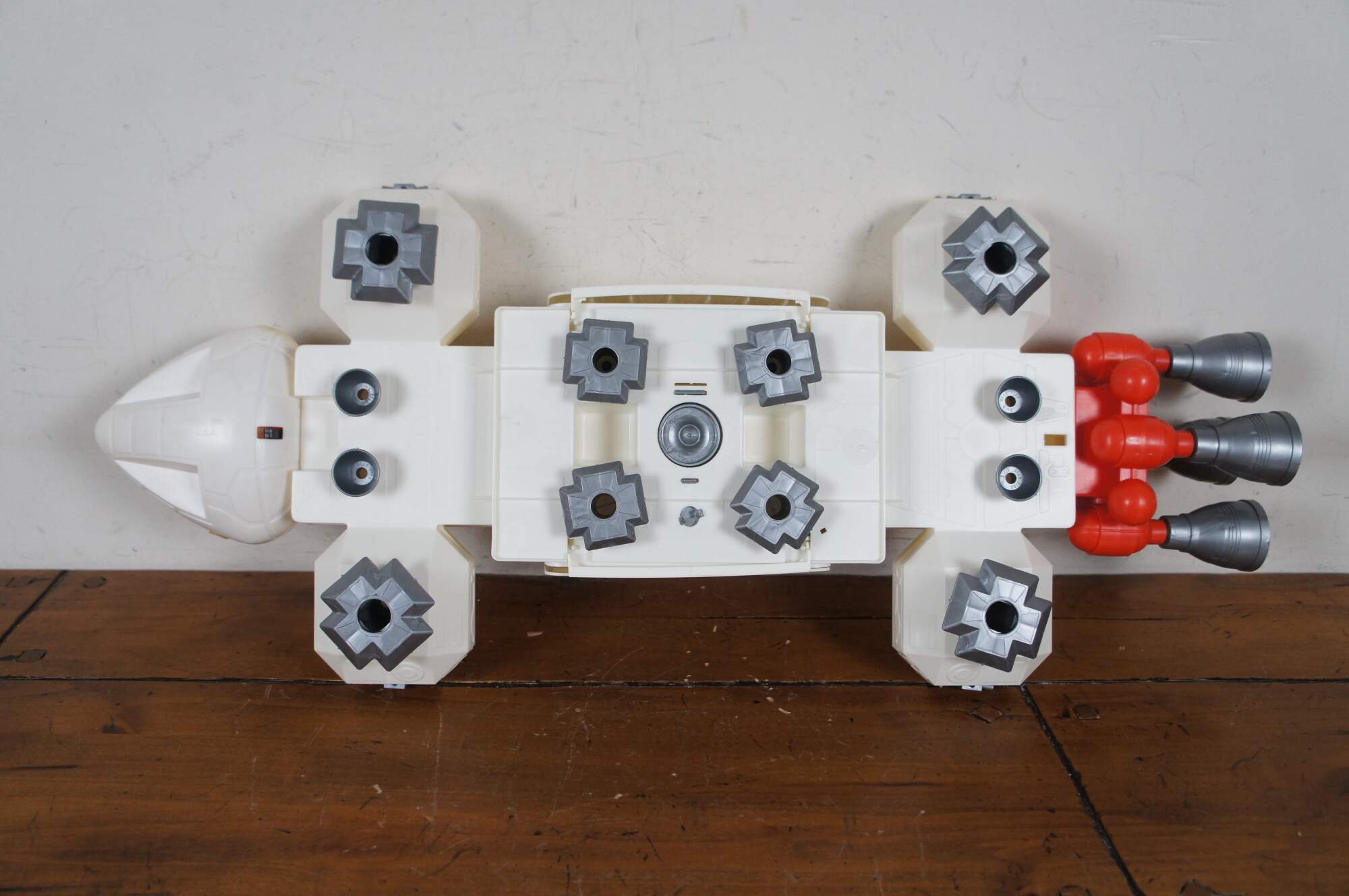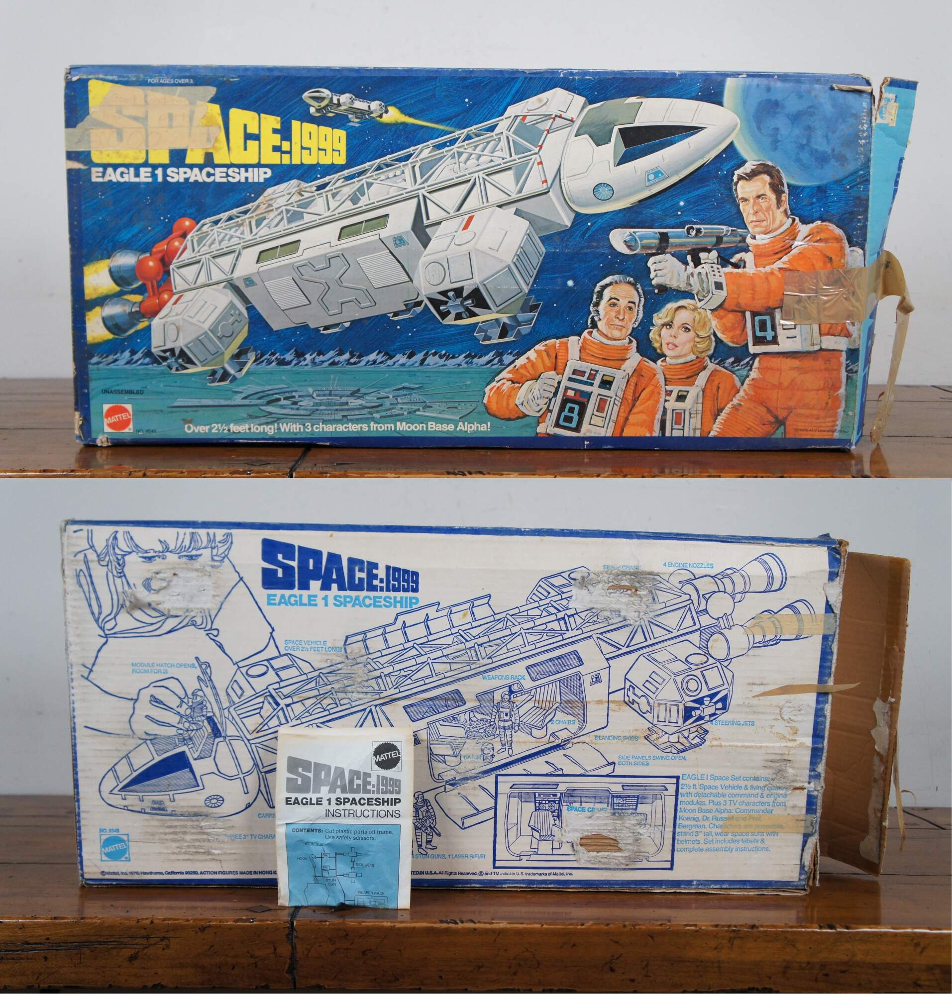 Vintage 1976 Space: 1999 Eagle 1 Spaceship with three figures (one missing helmet) and one gun accessory. Interior features crane, weapons rack (detached from floor), and two chairs. Manufactured by Mattel Inc. Made in USA. Includes original box and instructions.