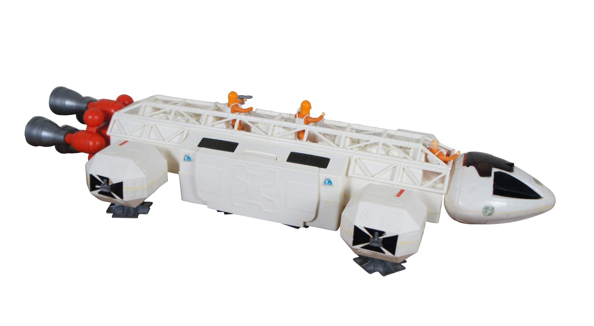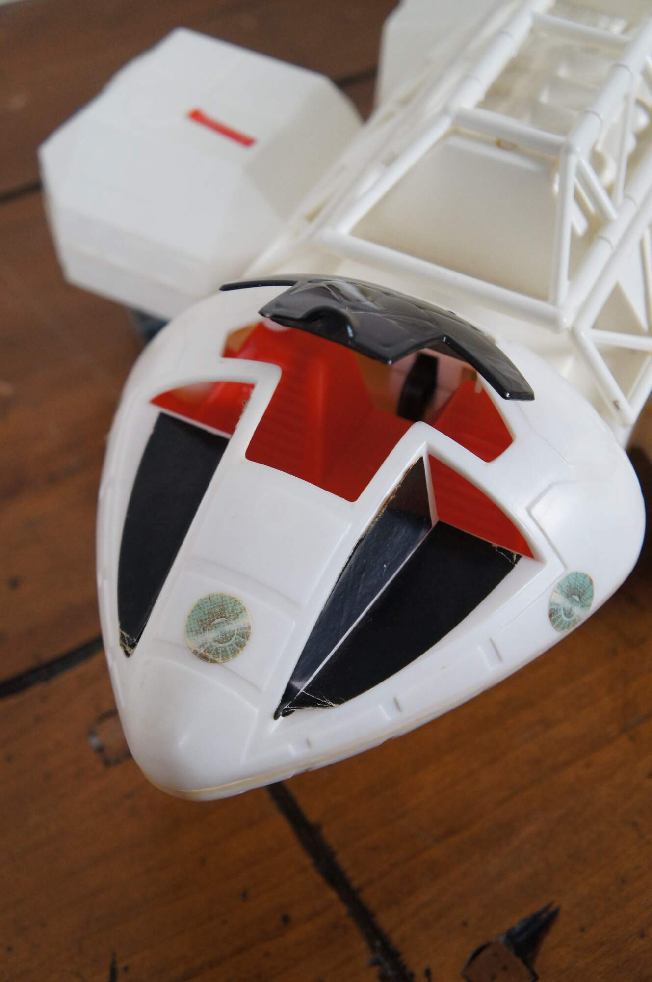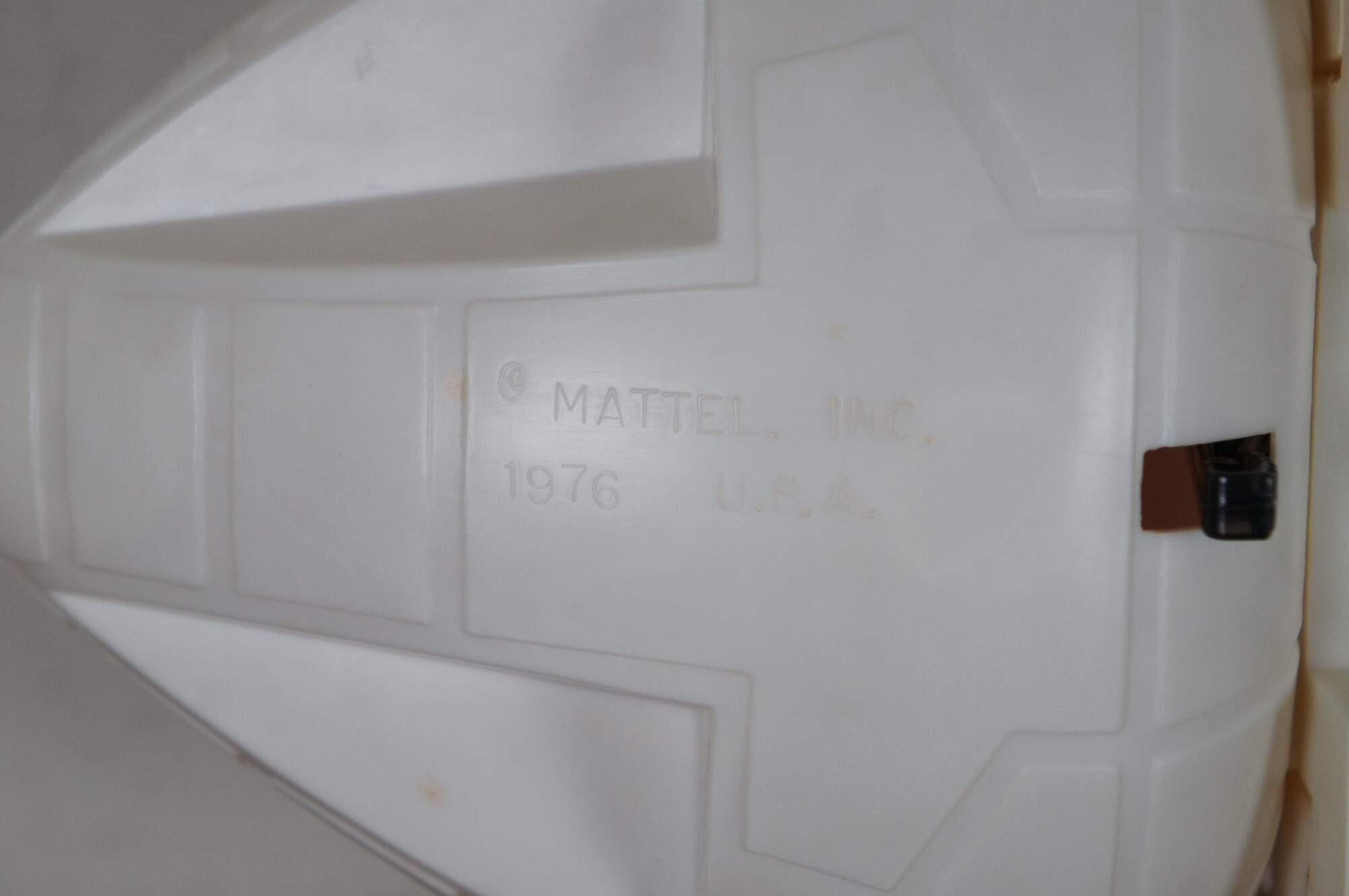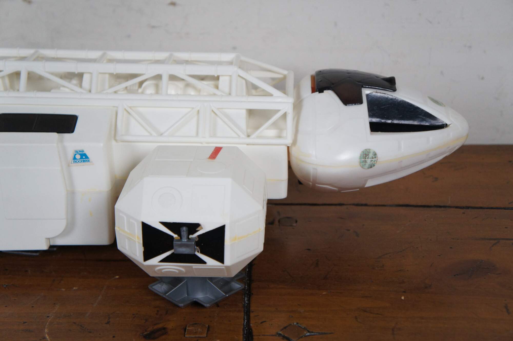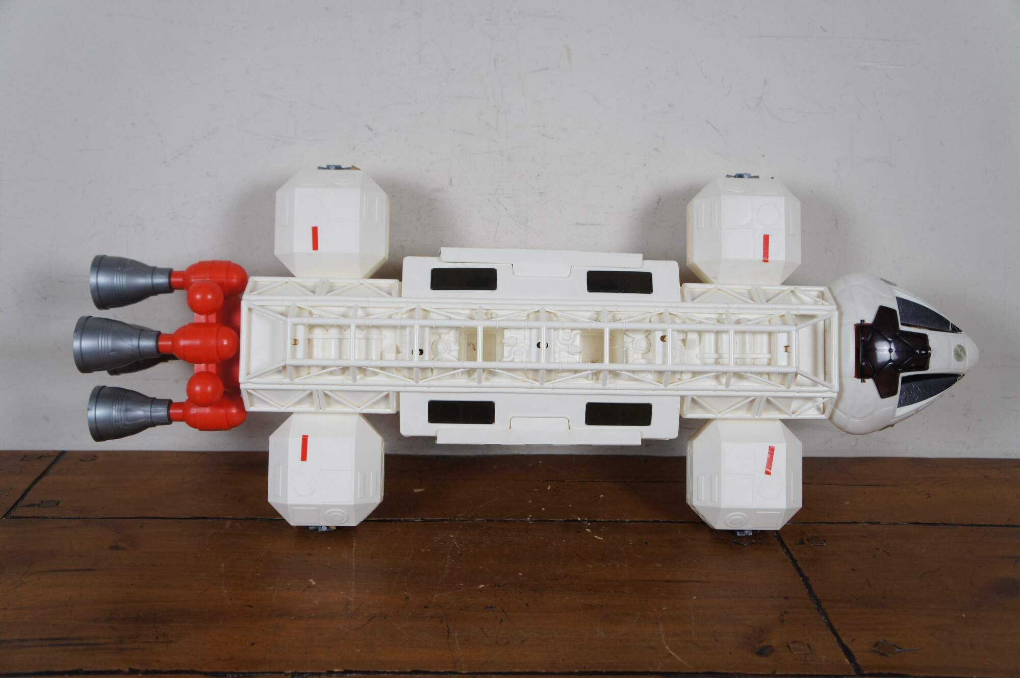Vintage 1976 Space: 1999 Eagle 1 Spaceship with three figures (one missing helmet) and one gun accessory. Interior features crane, weapons rack (detached from floor), and two chairs. Manufactured by Mattel Inc. Made in USA. Includes original box and instructions.