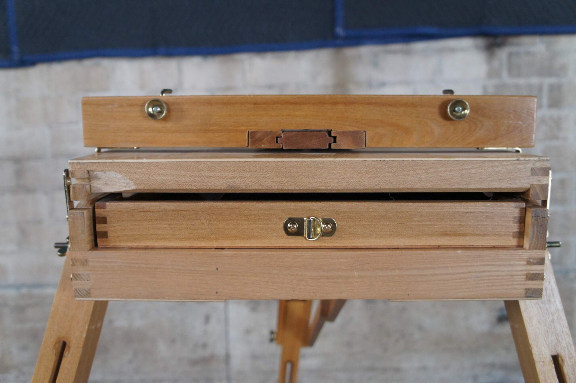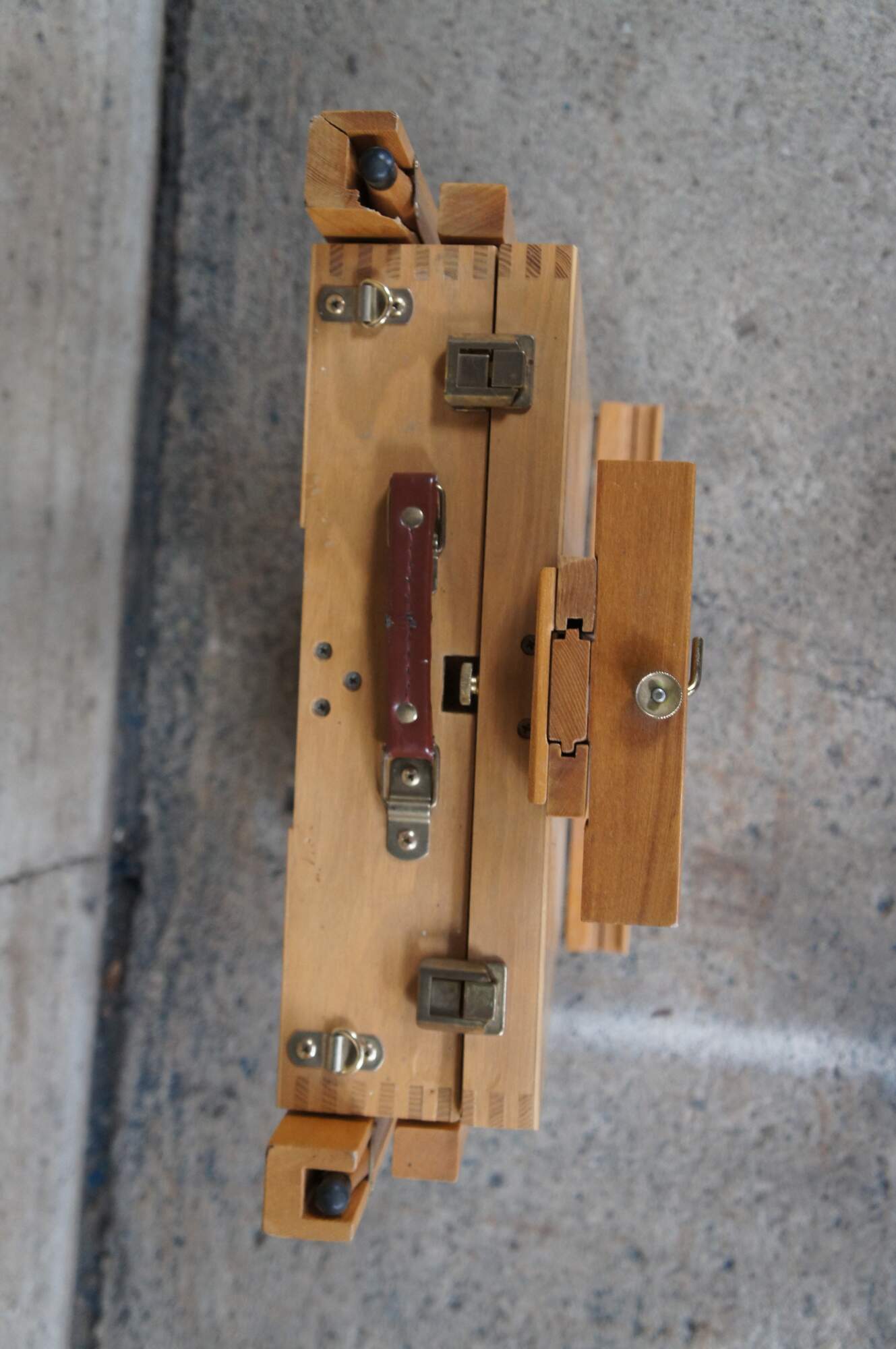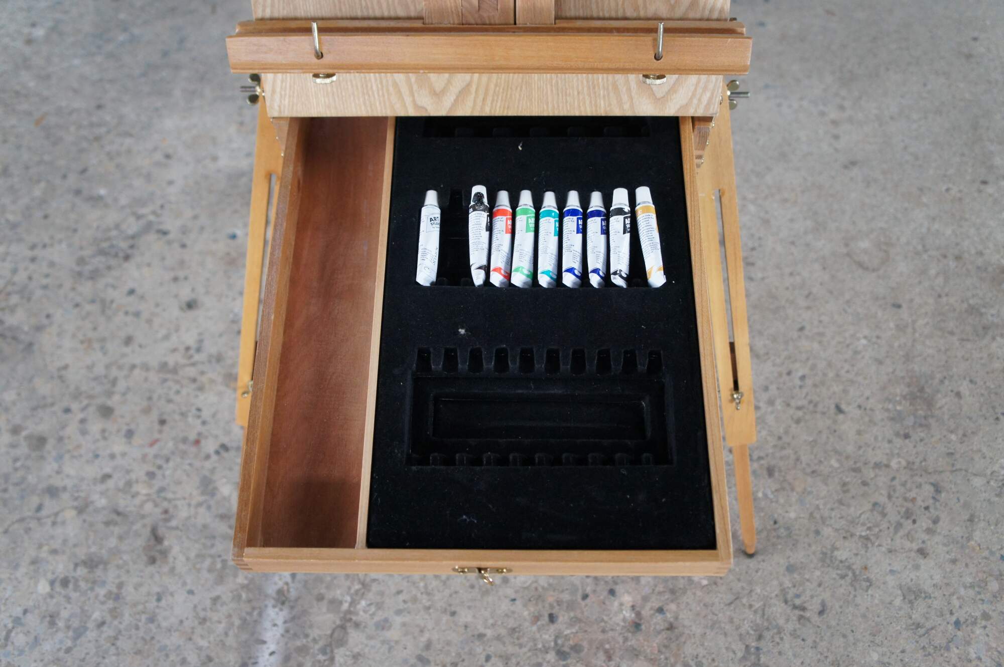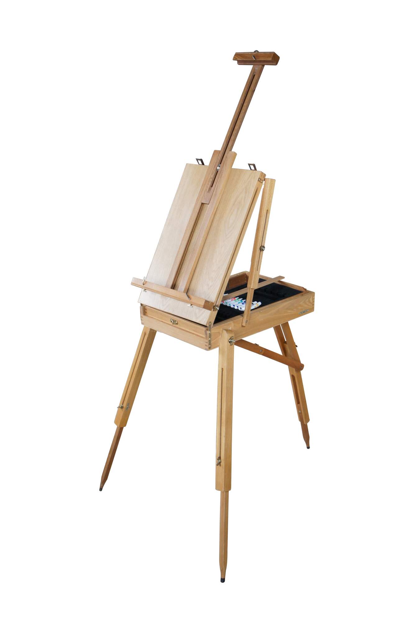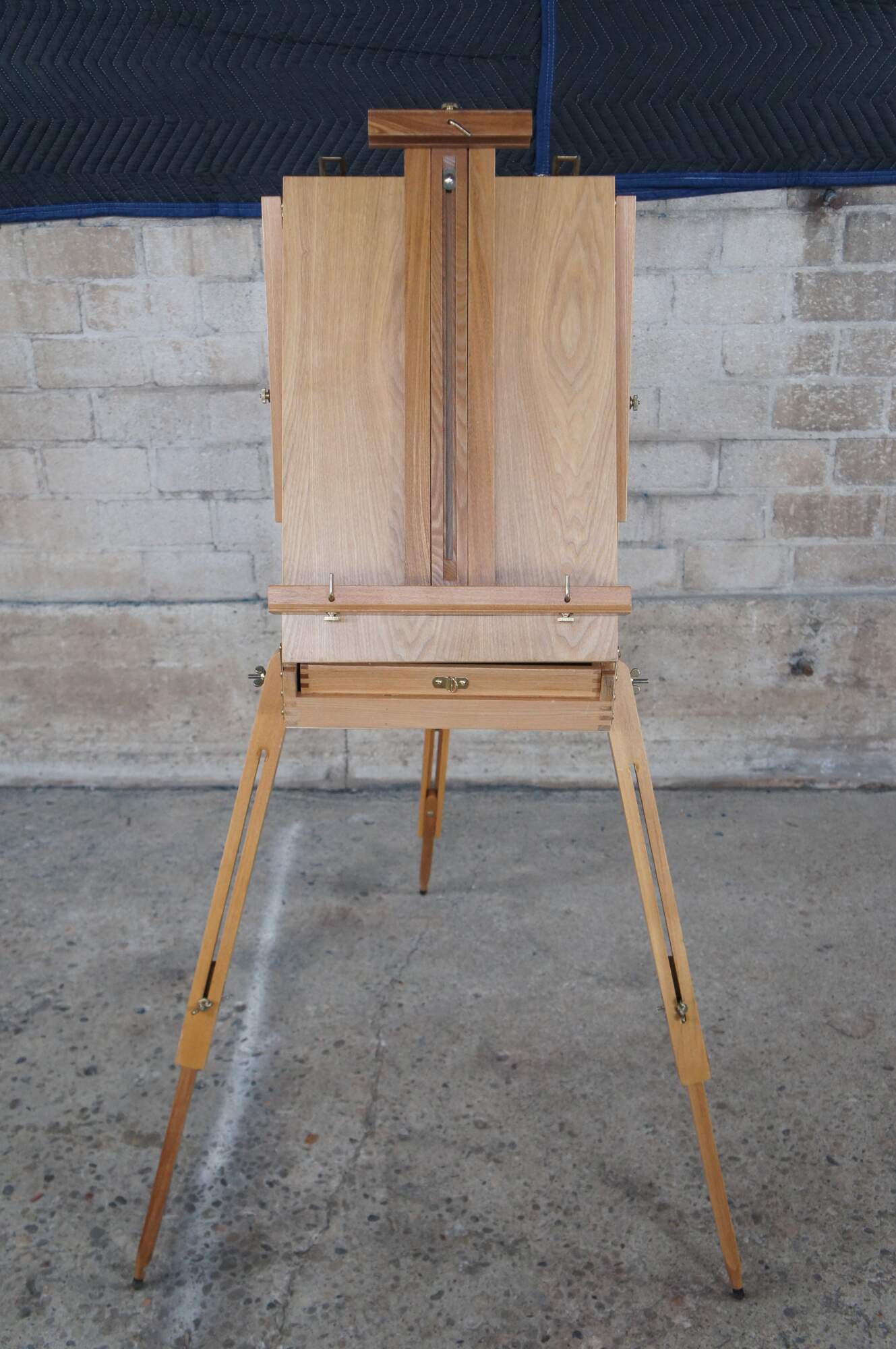 Convertable / Folding artist easel made from Beechwood. Extends from folded position for field use. Includes drawer for supplies.