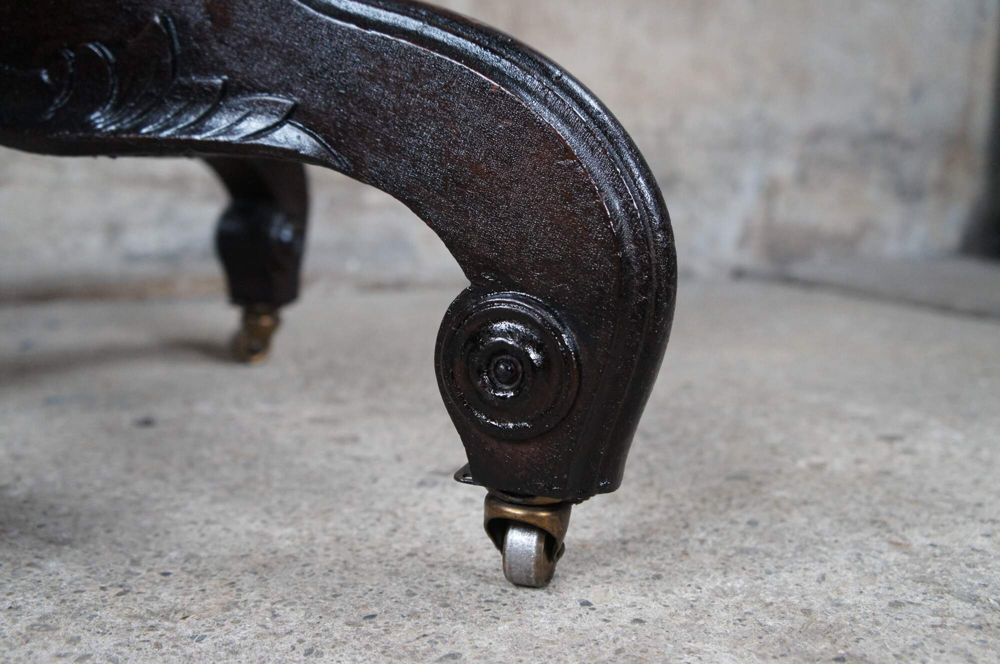 A late Victorian parlor side table. Features an oval form with white marble top over a serpentine base with carved and scrolled accents. The table is on casters for ease of movement.