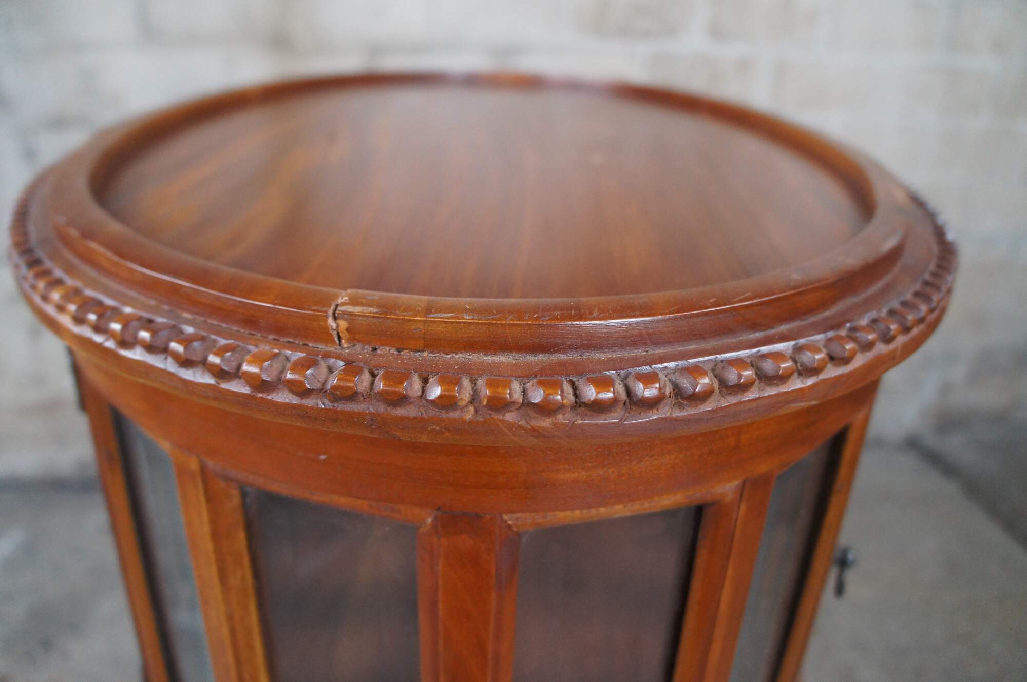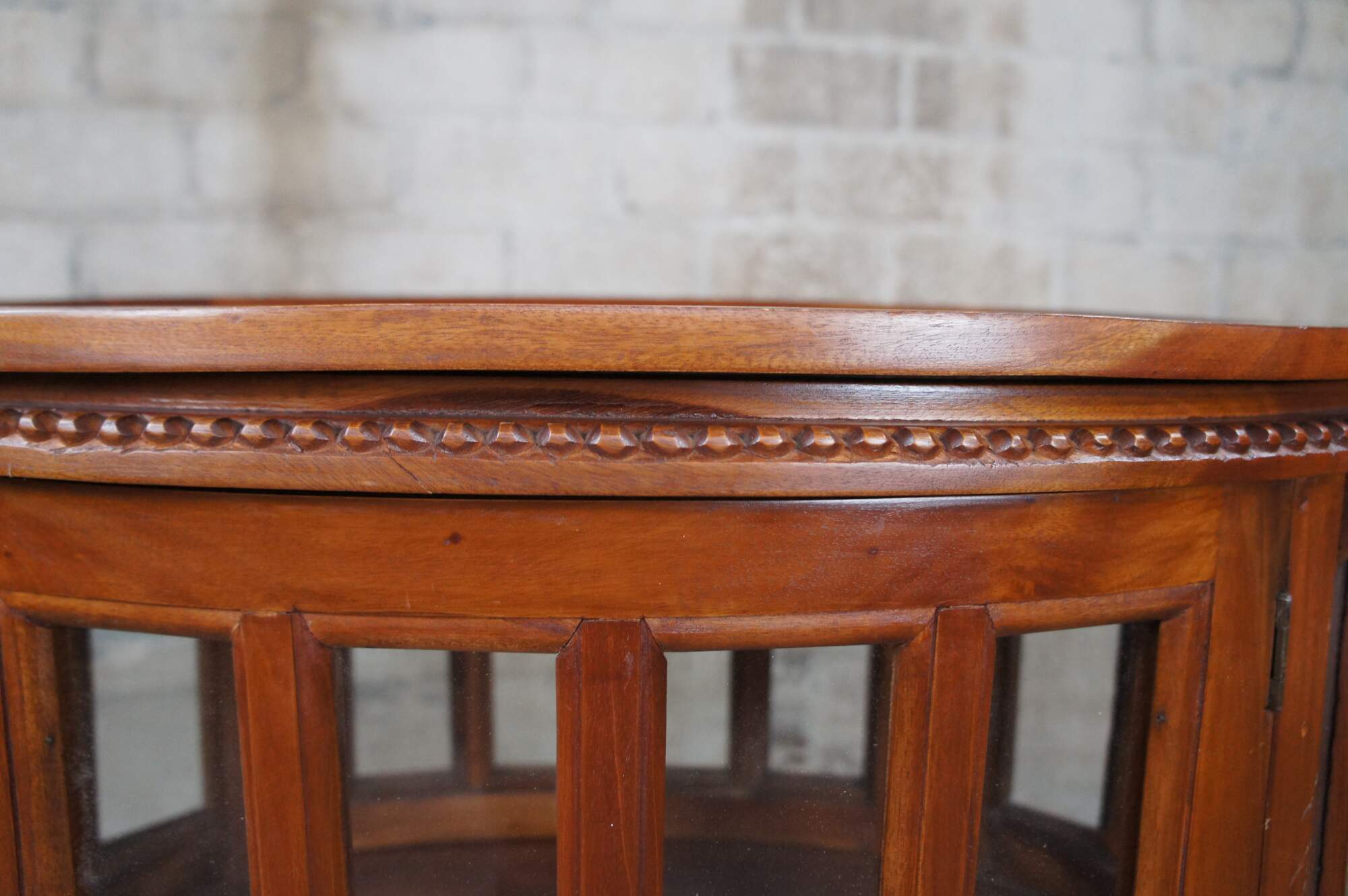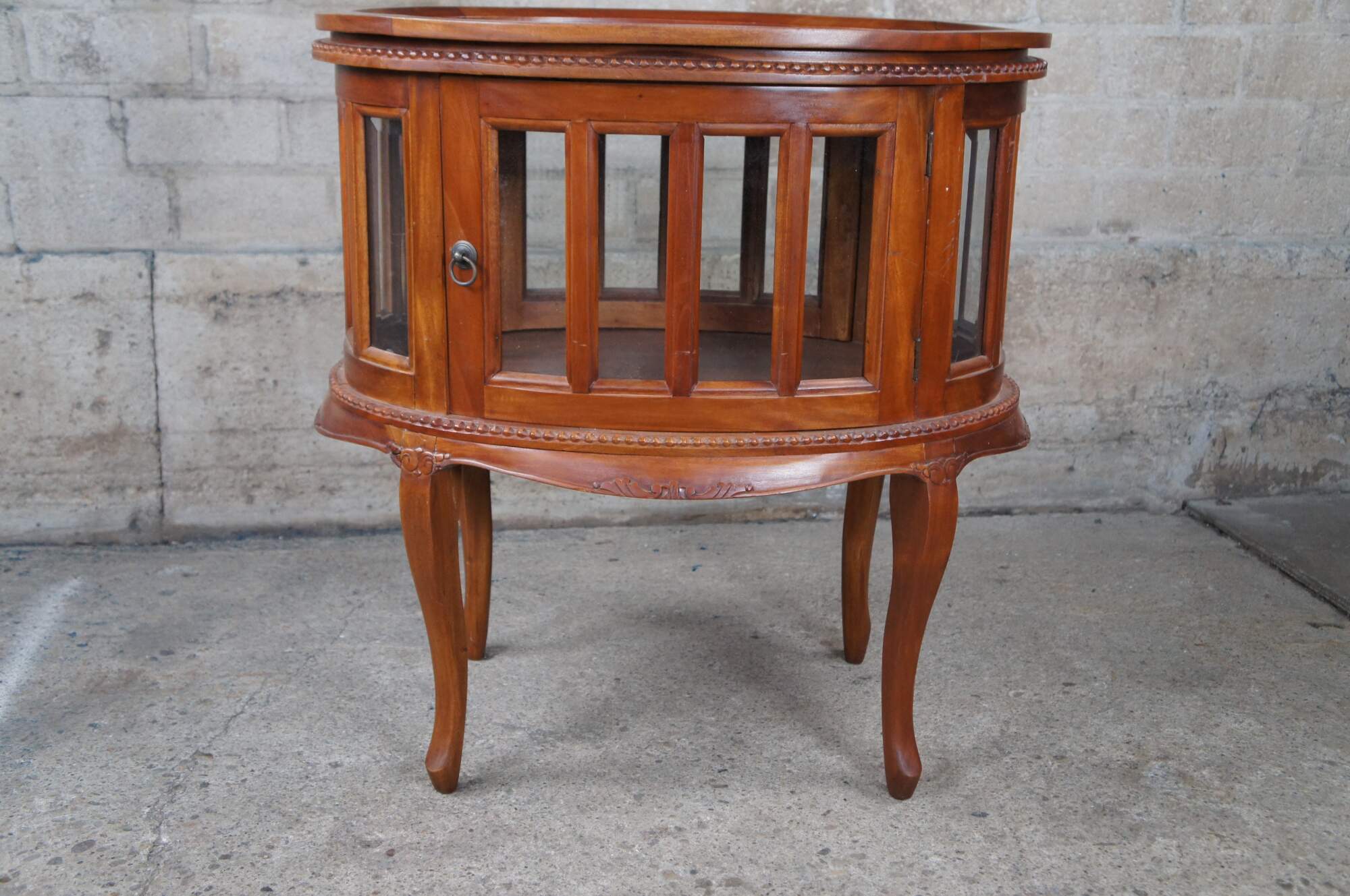 Georgian style Chocolate / Tea table or vitrine cabinet, circa last quarter 20th century. Features an oval frame and tray top over a lower two sided showcase with beveled glass. The table can be opened from each side and is accented by beaded aprons, foliate accents and contoured legs.