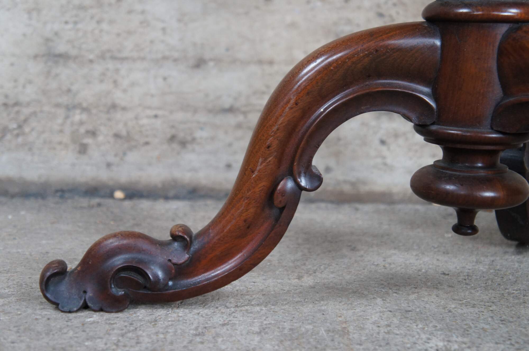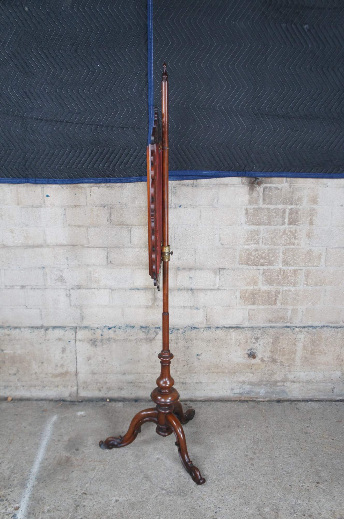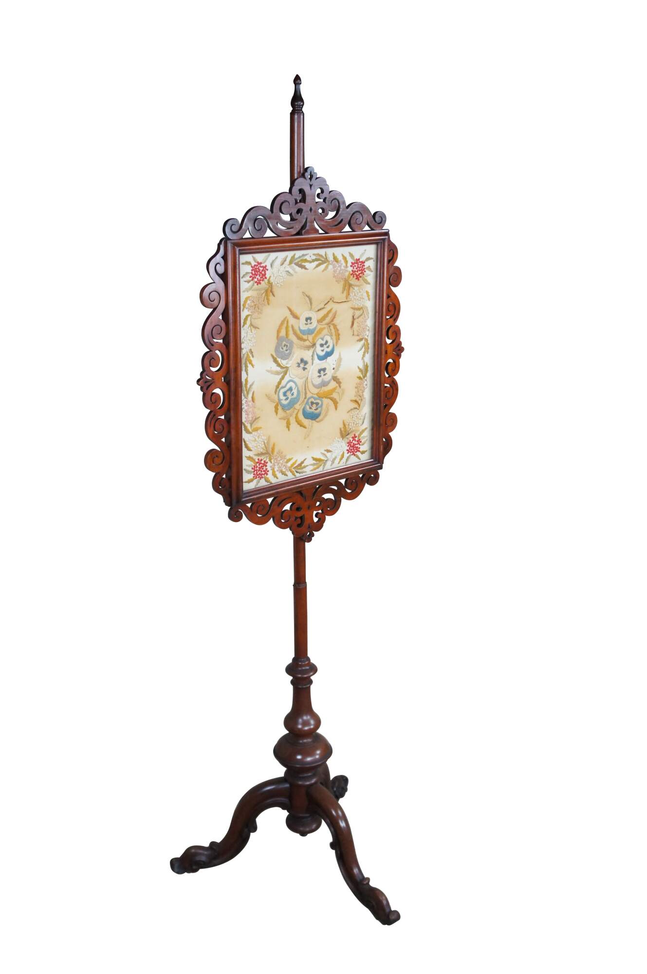 Antique English Regency / Georgian style pole or fire screen on stand. Made of mahogany featuring scrolled pierced / reticulated adjustable screen framing a floral tapestry backed with French fleur de lis. The pole features a tapered design with finial at top and bottom, and a tripod base with downswept legs and acanthus feet.