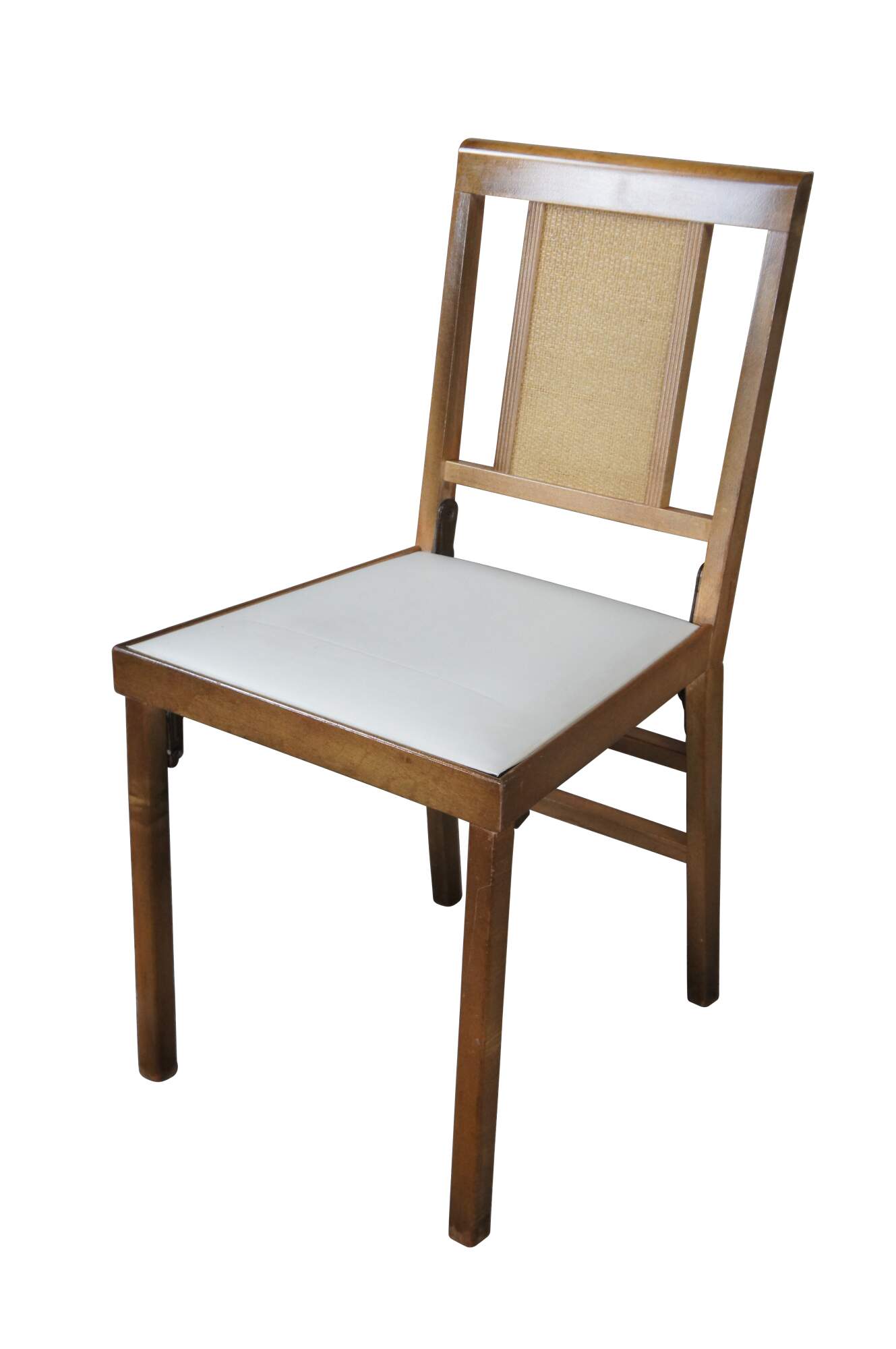 Four mid century Leg o matic folding side chairs. Made of walnut featuring woven wicker rattan backs with vinyl seat and metal hinges.