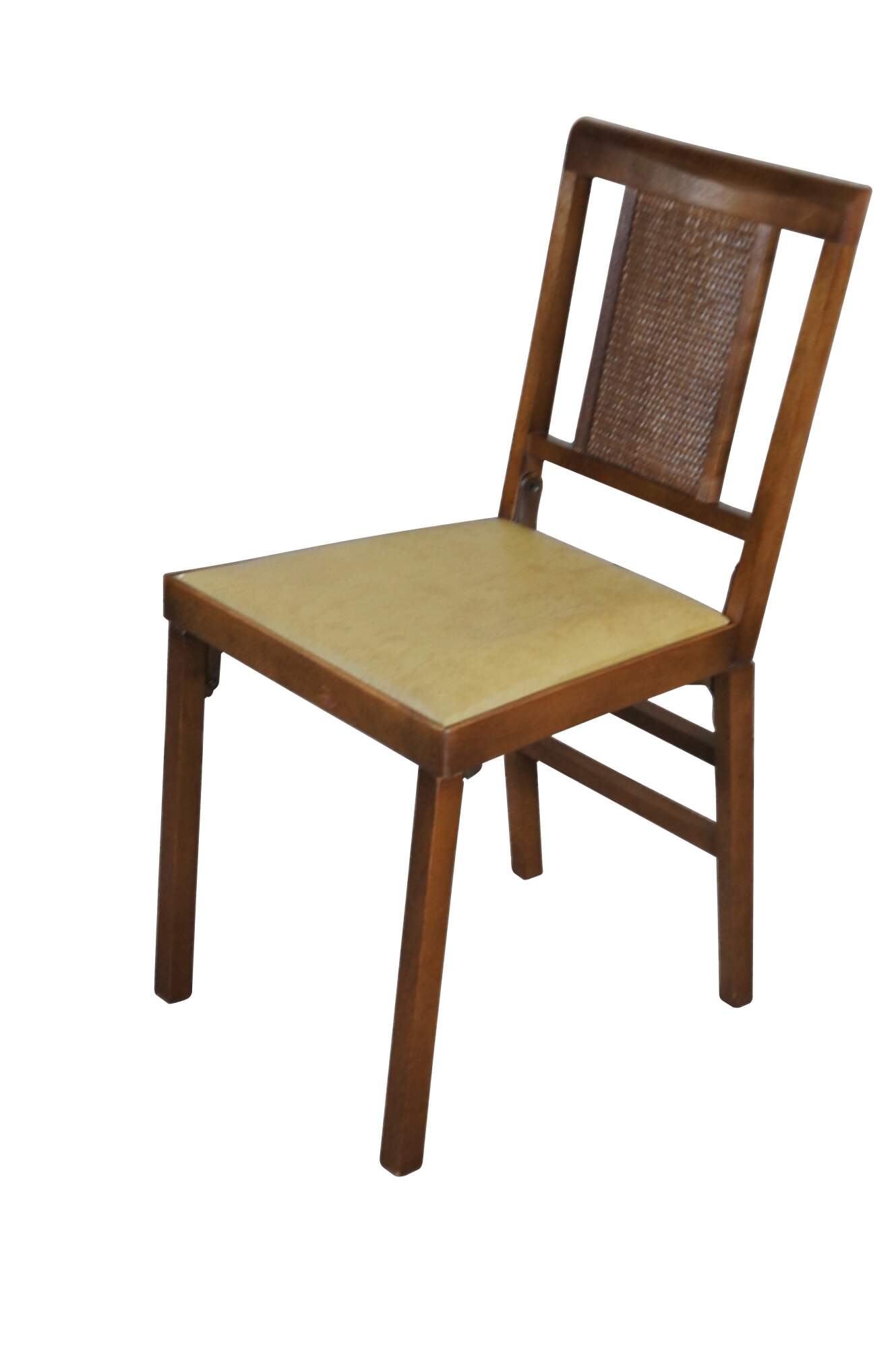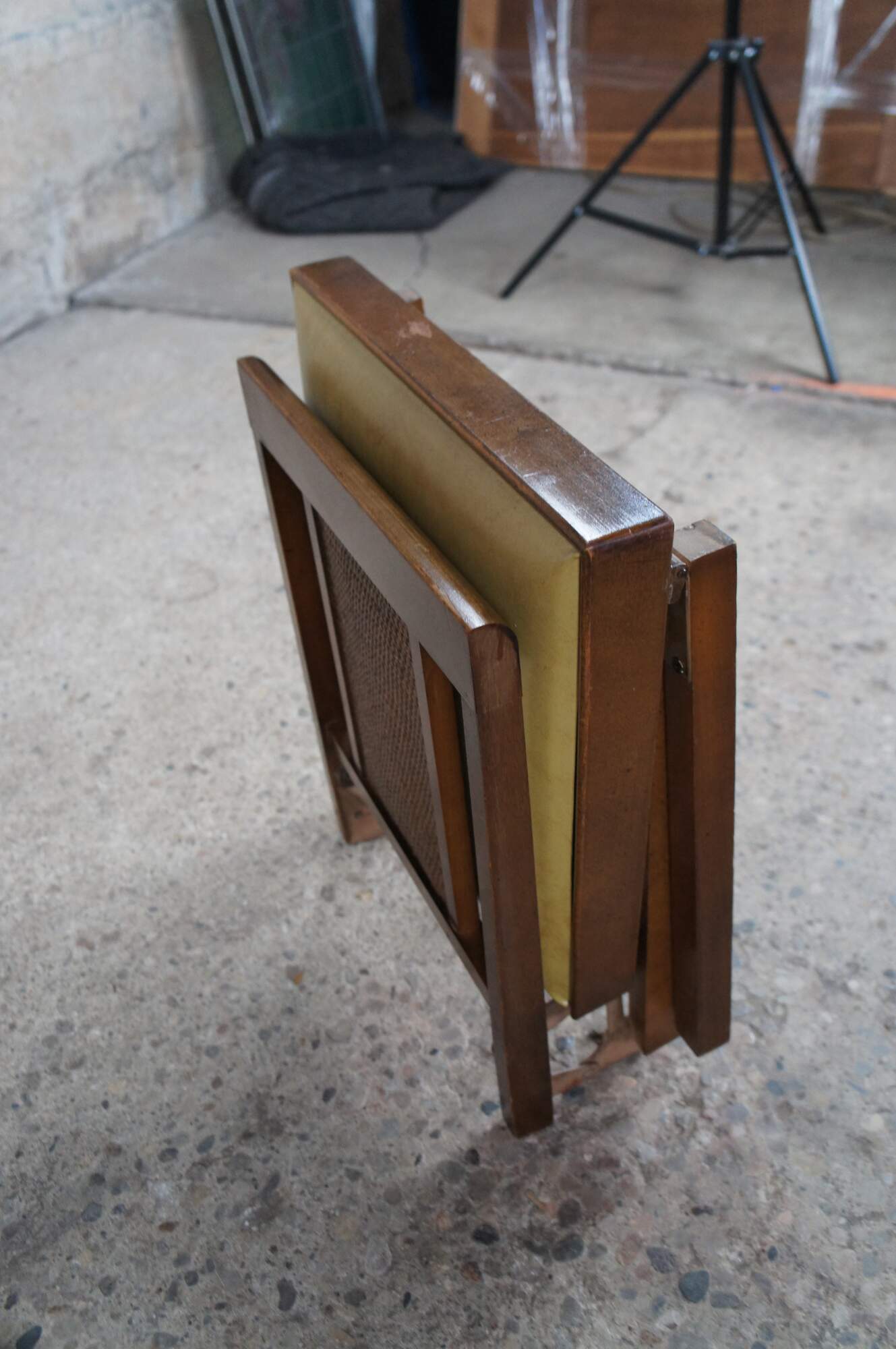 Four mid century Leg o matic folding side chairs. Made of walnut featuring woven wicker rattan backs with vinyl seat and metal hinges.