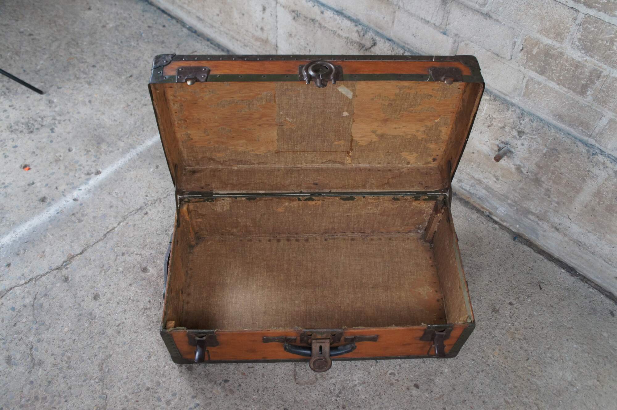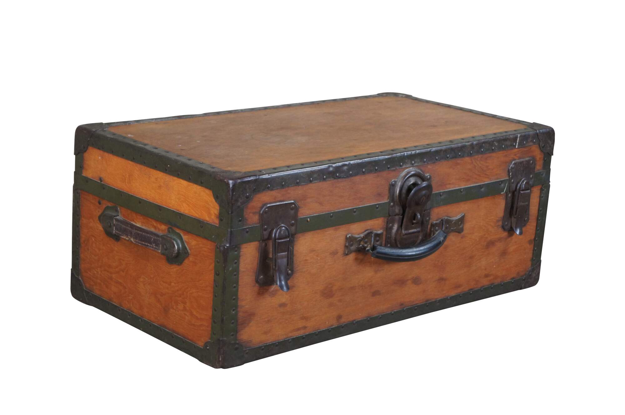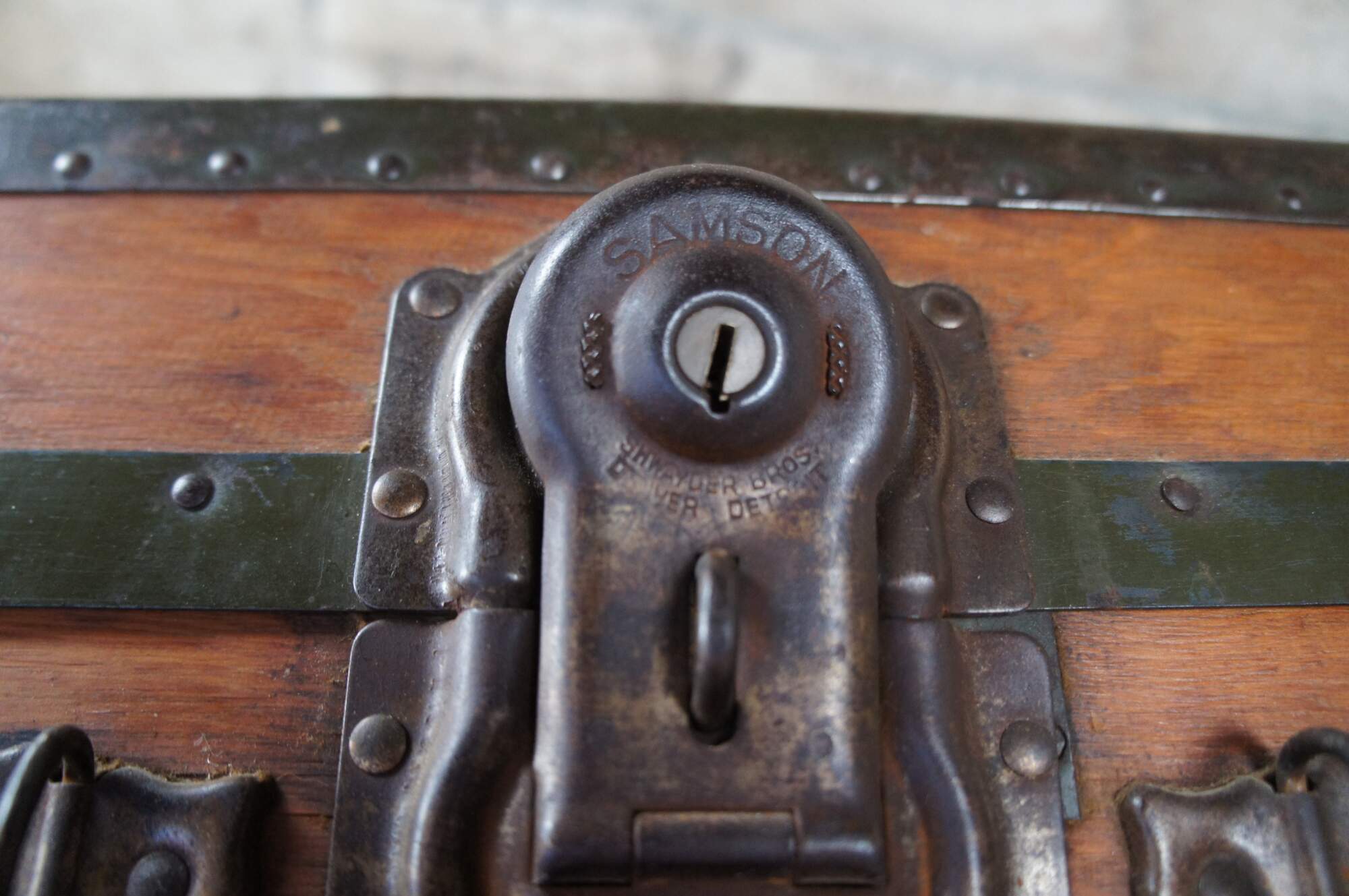 Antique Samson Shwayder Bros steamer trunk / storage chest / footlocker / suitcase / luggage / coffee table. Made of pine featuring metal banded edges with rivets and leather handles. Marked Samson and Shwayder Brother Detroit on lock.