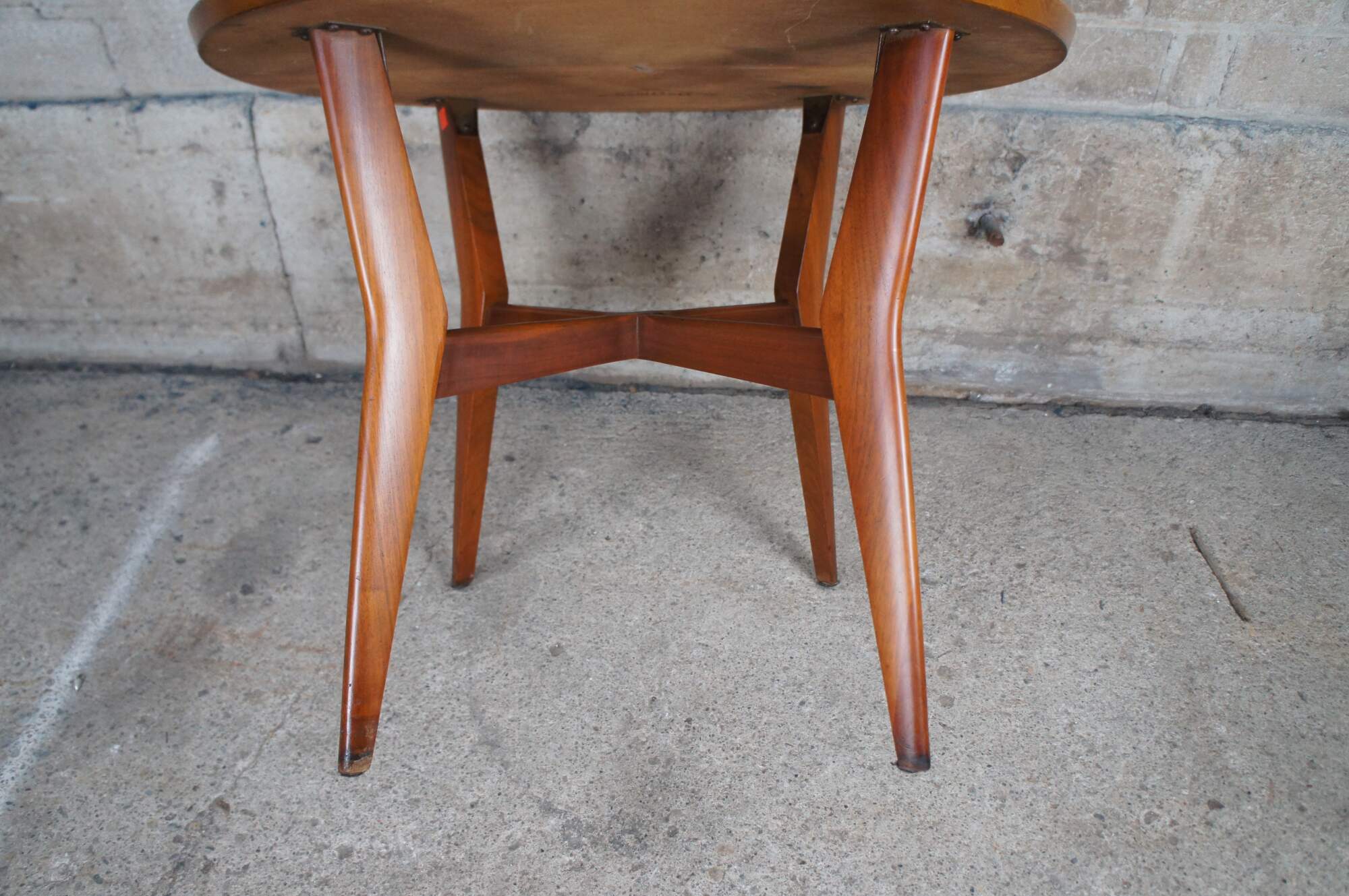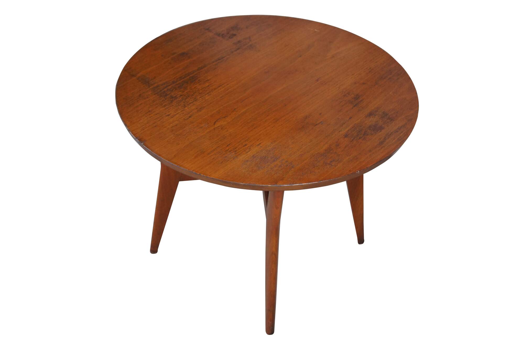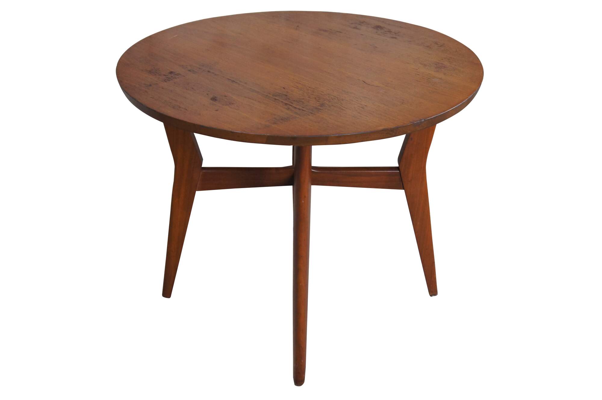 Mid Century Scandanavian style side table by Mersman. Features a round form crafted from walnut with contoured boomerang legs connected by an X stretcher.