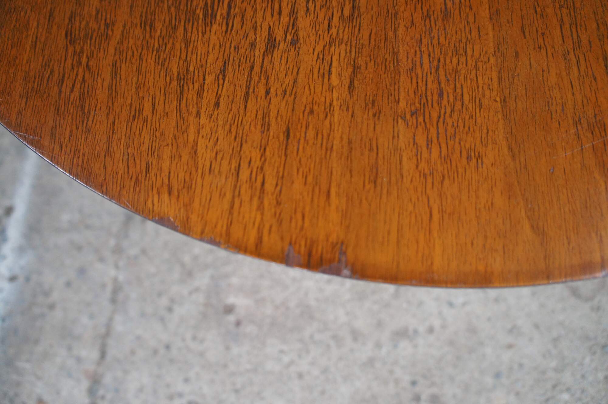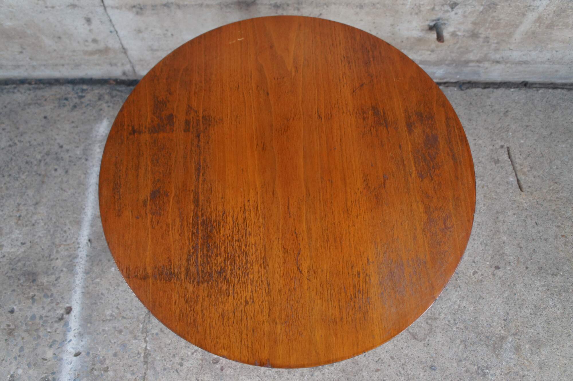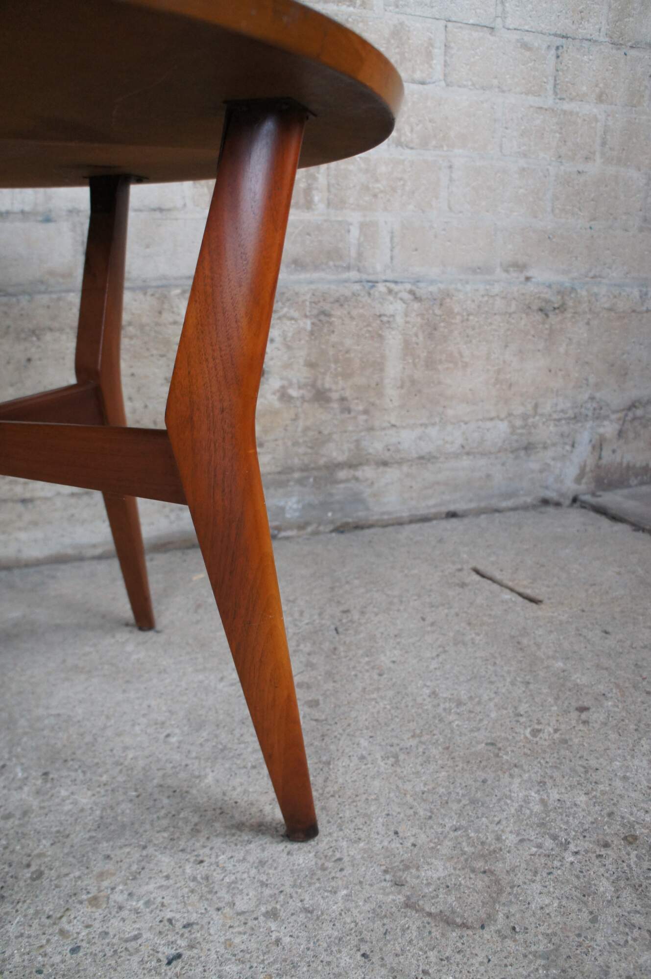 Mid Century Scandanavian style side table by Mersman. Features a round form crafted from walnut with contoured boomerang legs connected by an X stretcher.