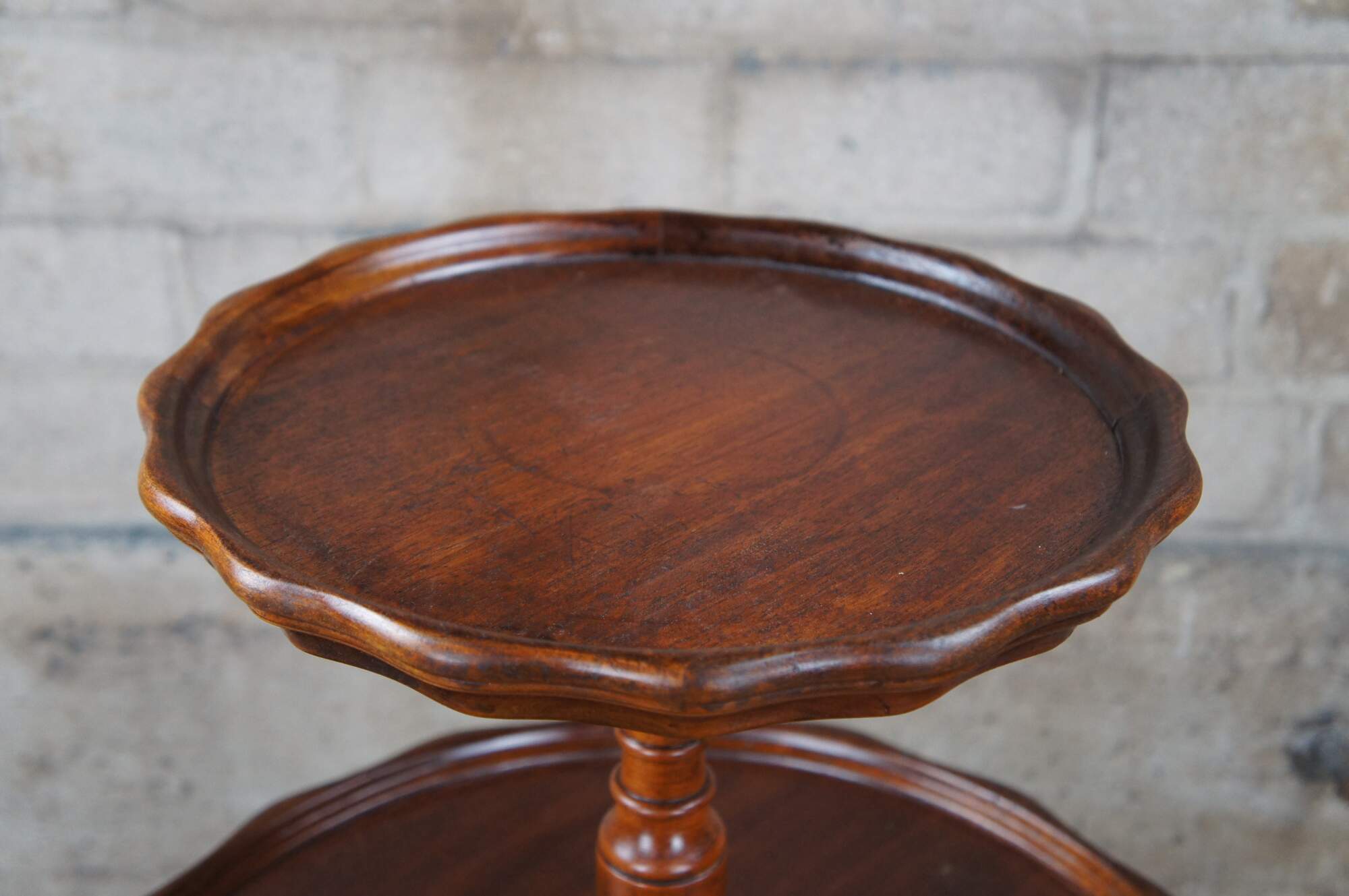 Vintage / Mid century two tier English Walnut dumbwaiter side table featuring serpentine pie crust edge with turned supports and Duncan Phyfe tripod style pedestal base with fluted and flared saber leggs and brass capped feet.