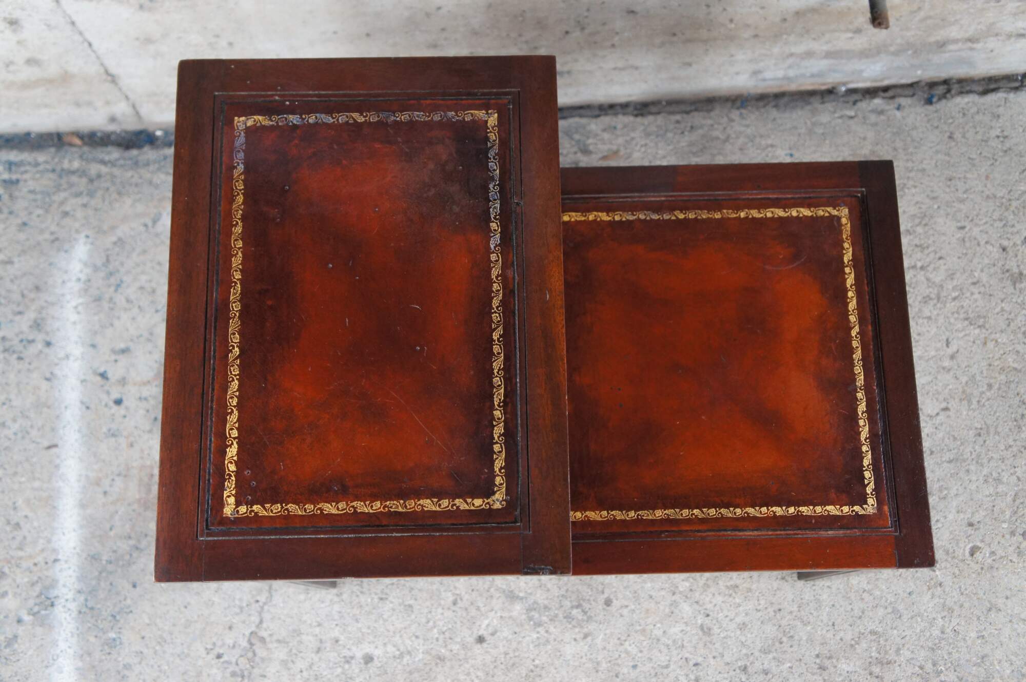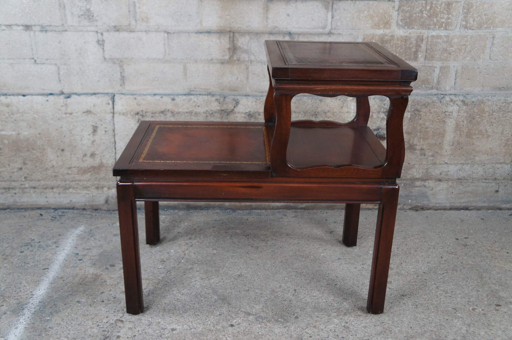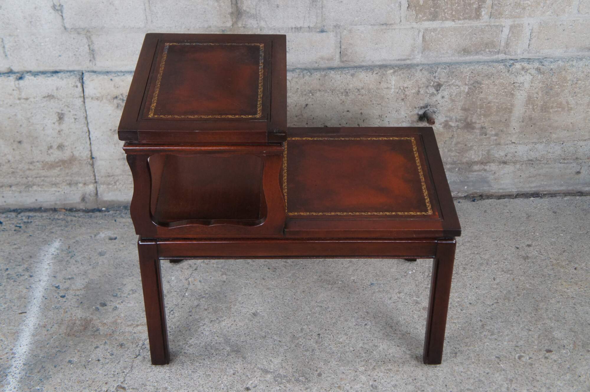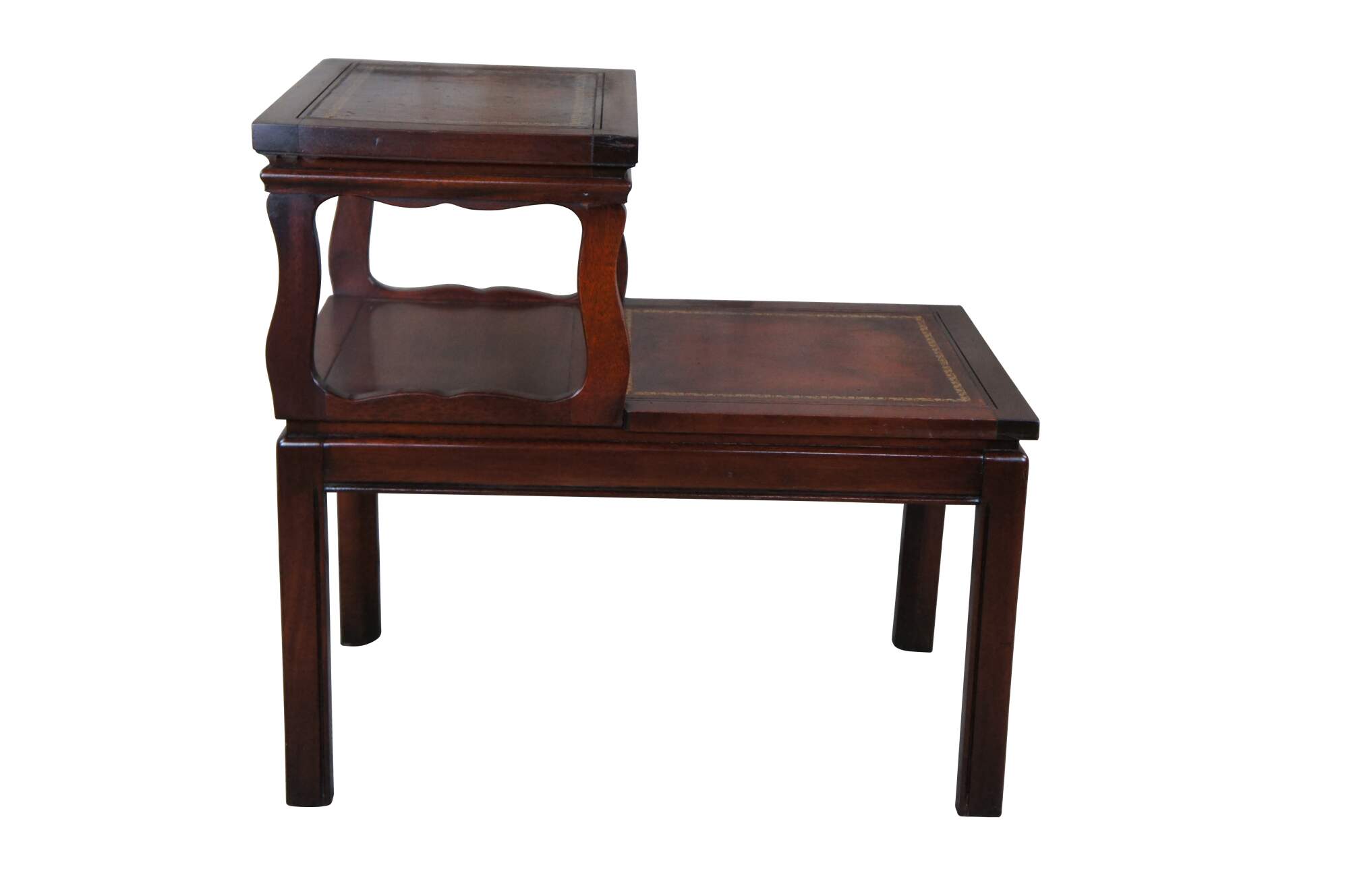 Early to mid century two tier library accent step table. Made of mahogany featuring rectangular form with inset tooled leather tops and fluted accents.
