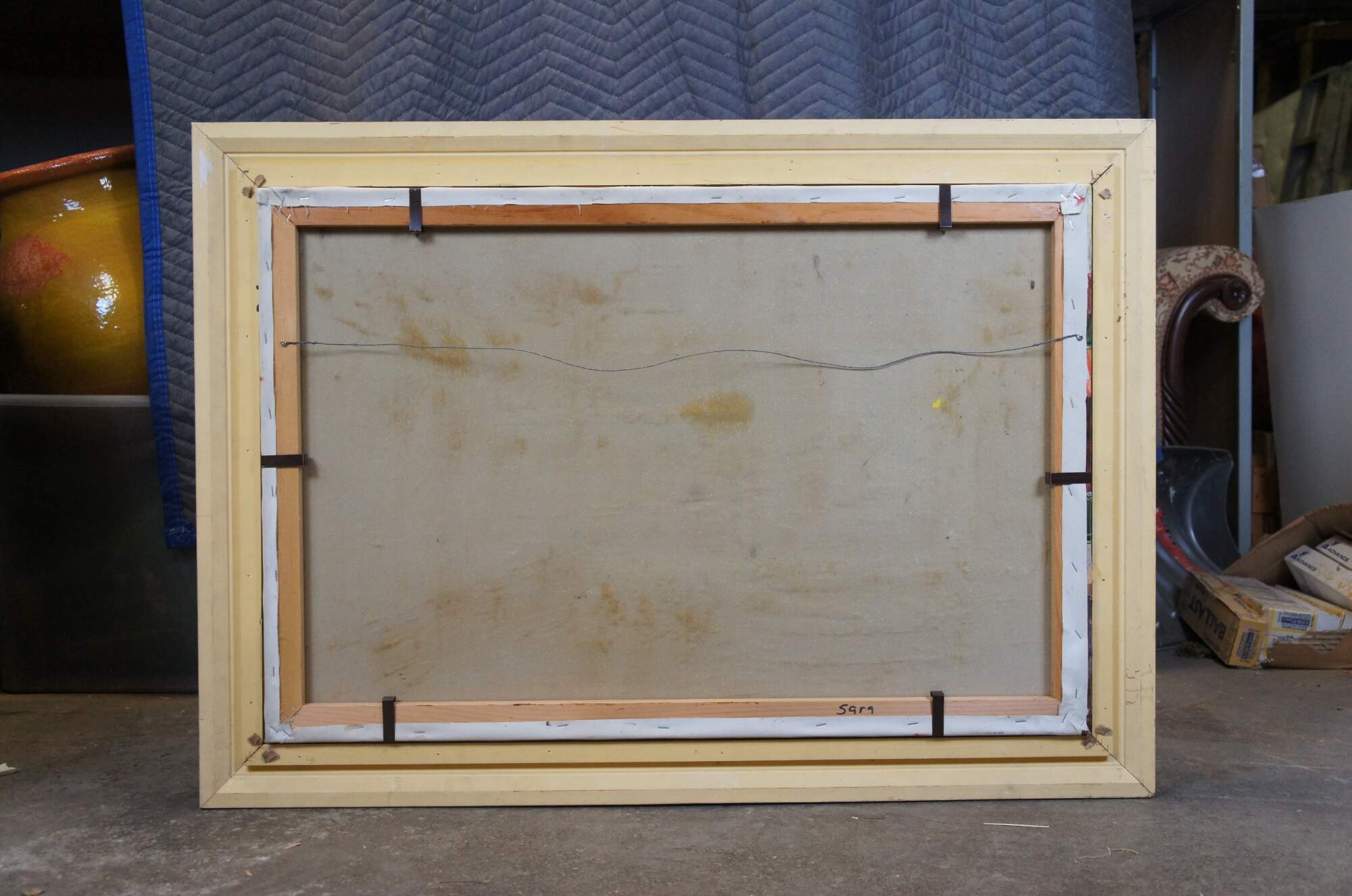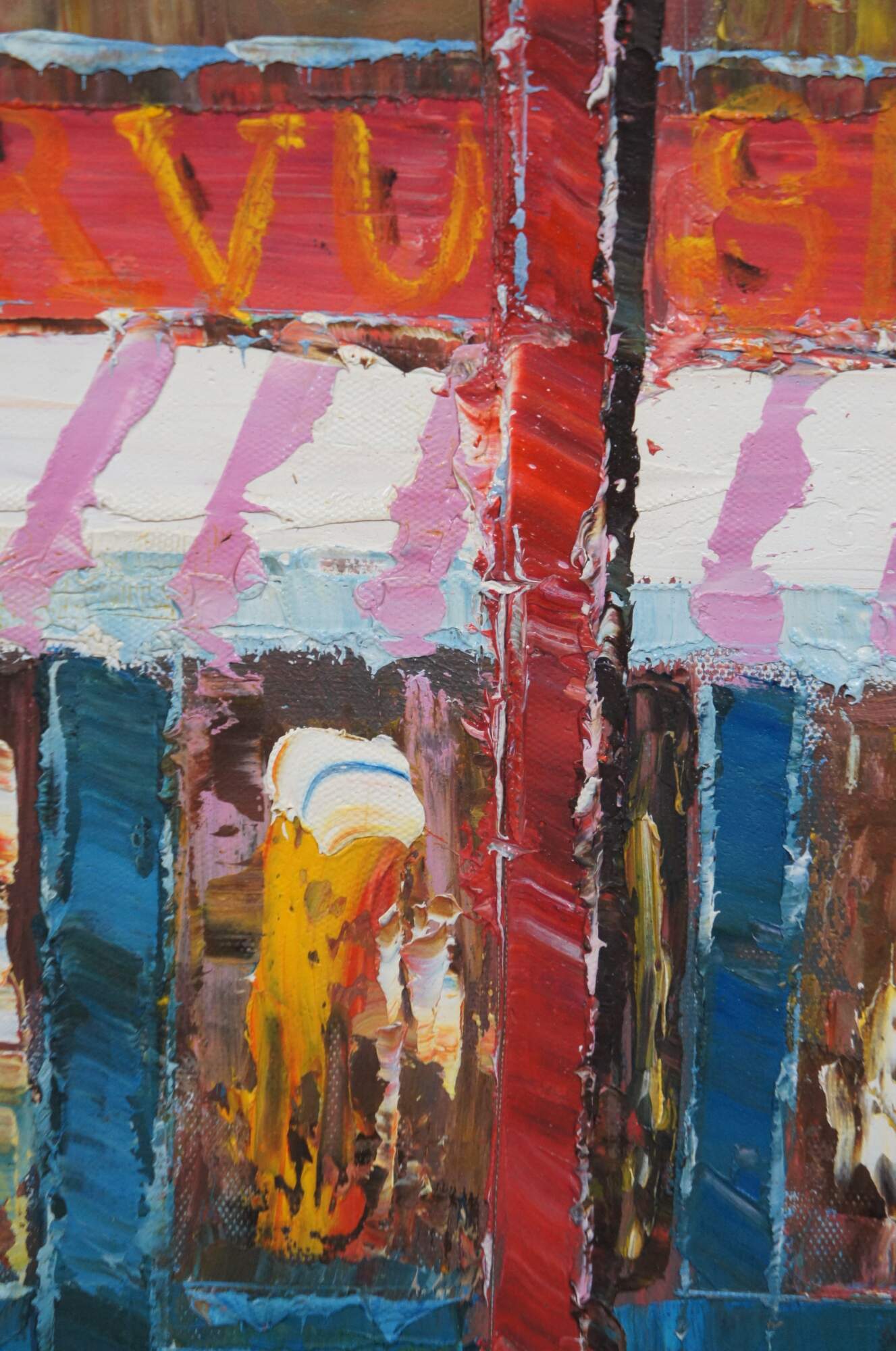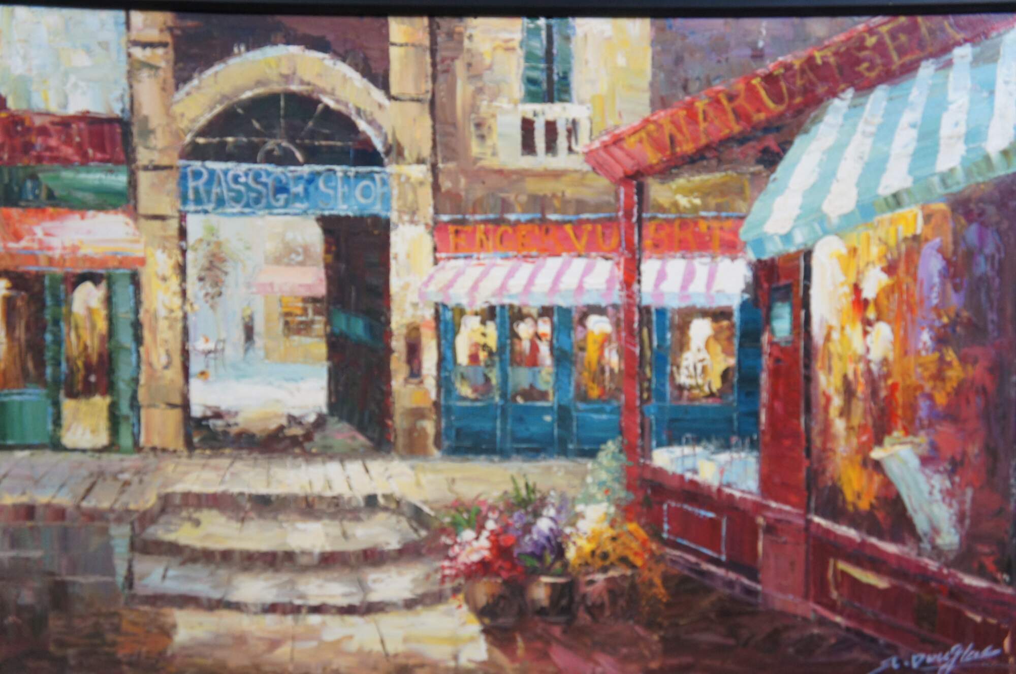 Late 20th century oil on canvas impressionist / expressionist style painting depicting a picturesque Parisian city street and shops. Signed A.(?) Douglas in lower right. Black painted wood frame with raised bevel.