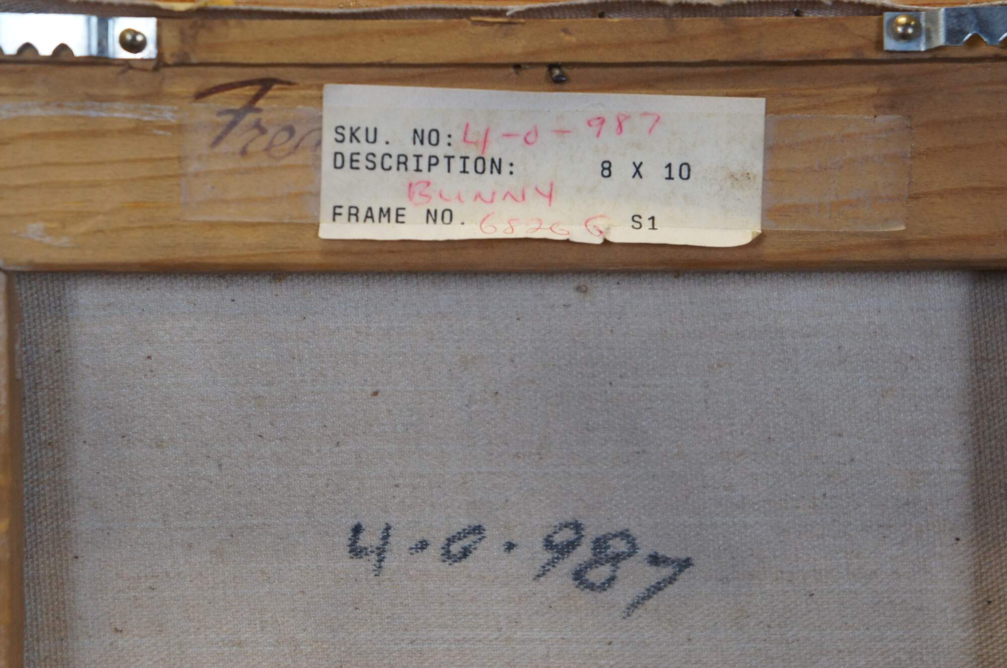 Late 20th century realist oil on canvas painting depicting a brown and white rabbit near a cracked stone wall. Signed K. Christie in lower left corner. Carved and beveled giltwood frame. Marked "Bought Stegman's June 1992 M.D." SKU No: 4-0-987 - Description: Bunny - 8 x 10 - Frame No: G8266 - S1.