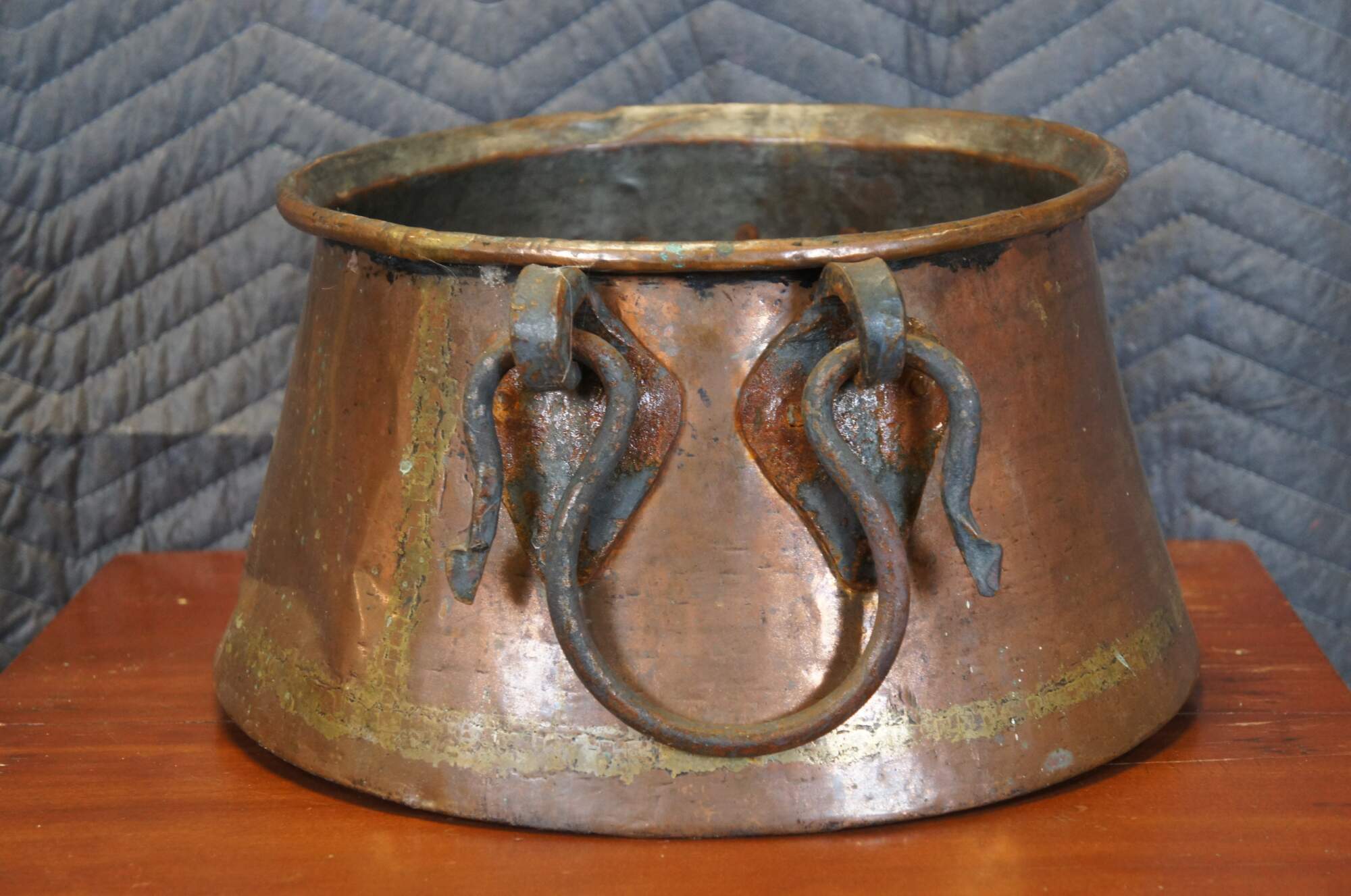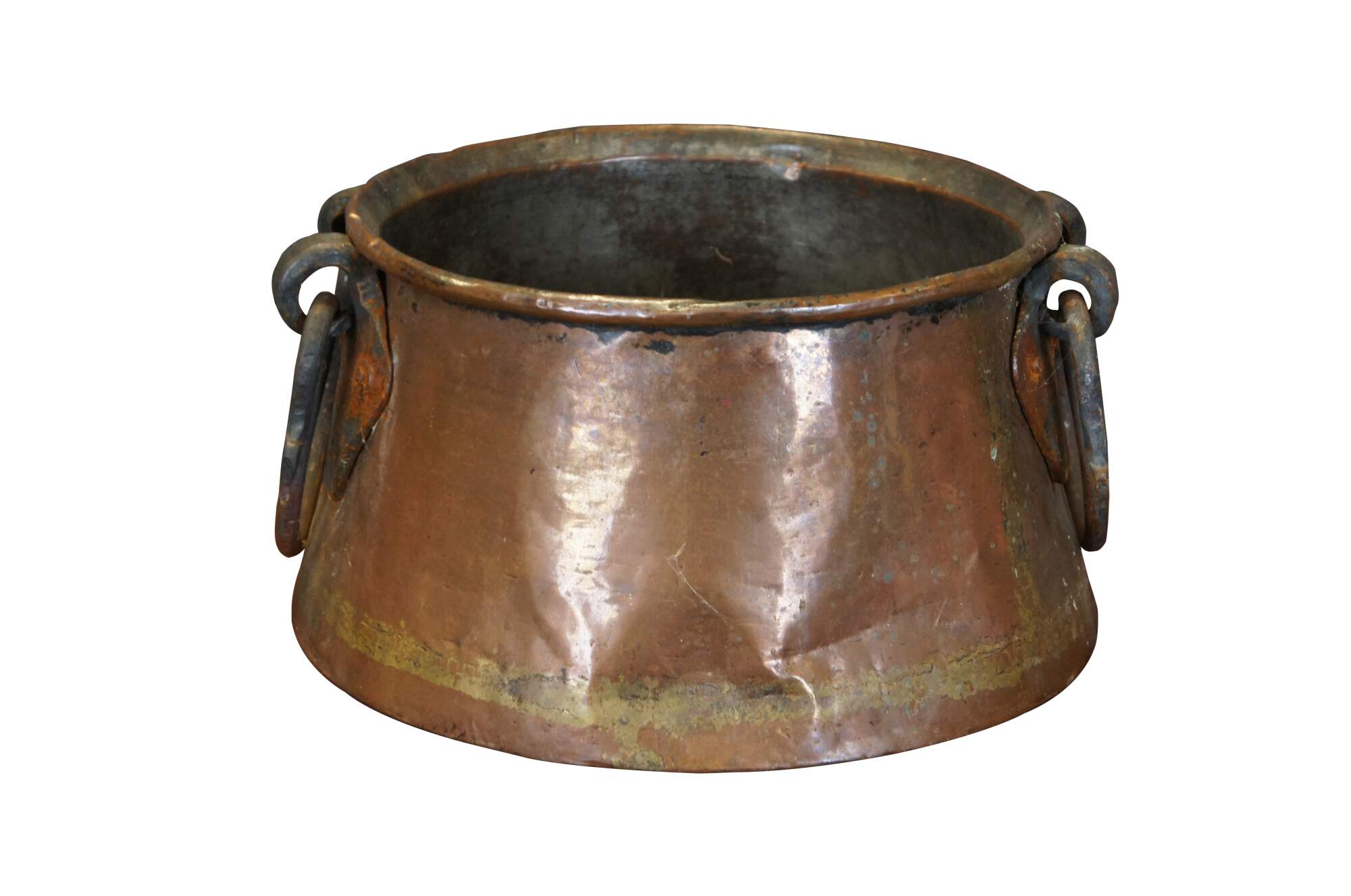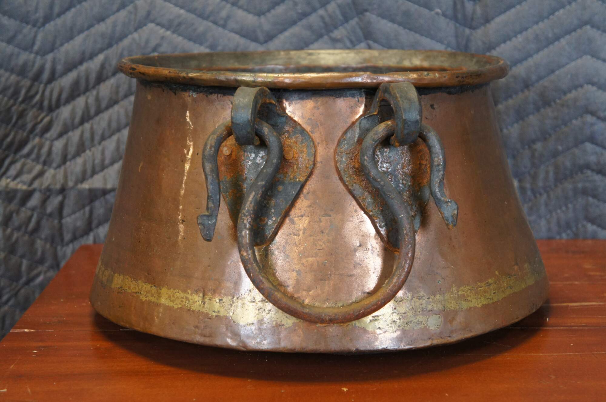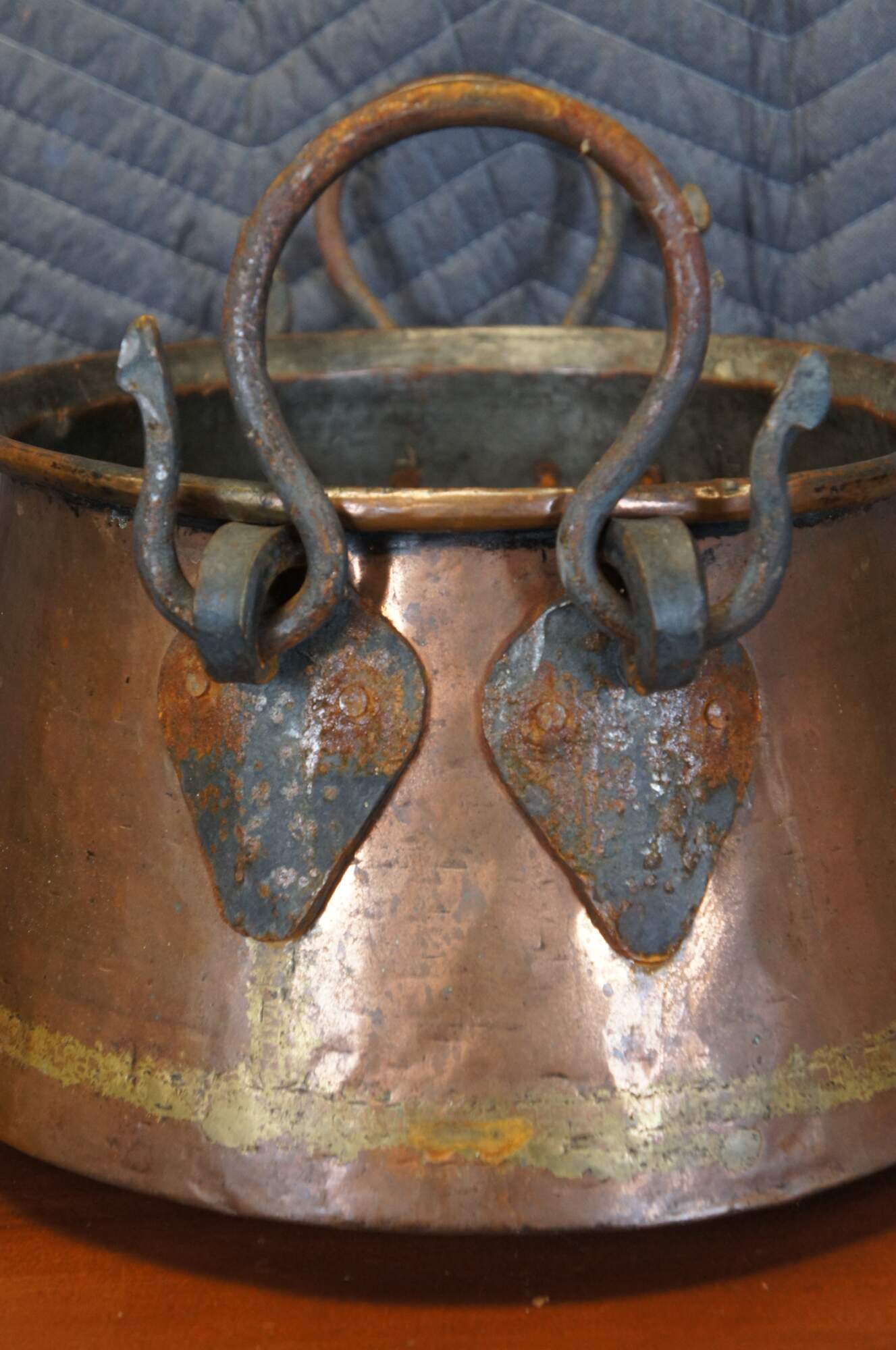 Late 19th century French dovetailed copper cooking pot / cauldron with a wide base, flared rim, and two iron rat tail style bail handles.