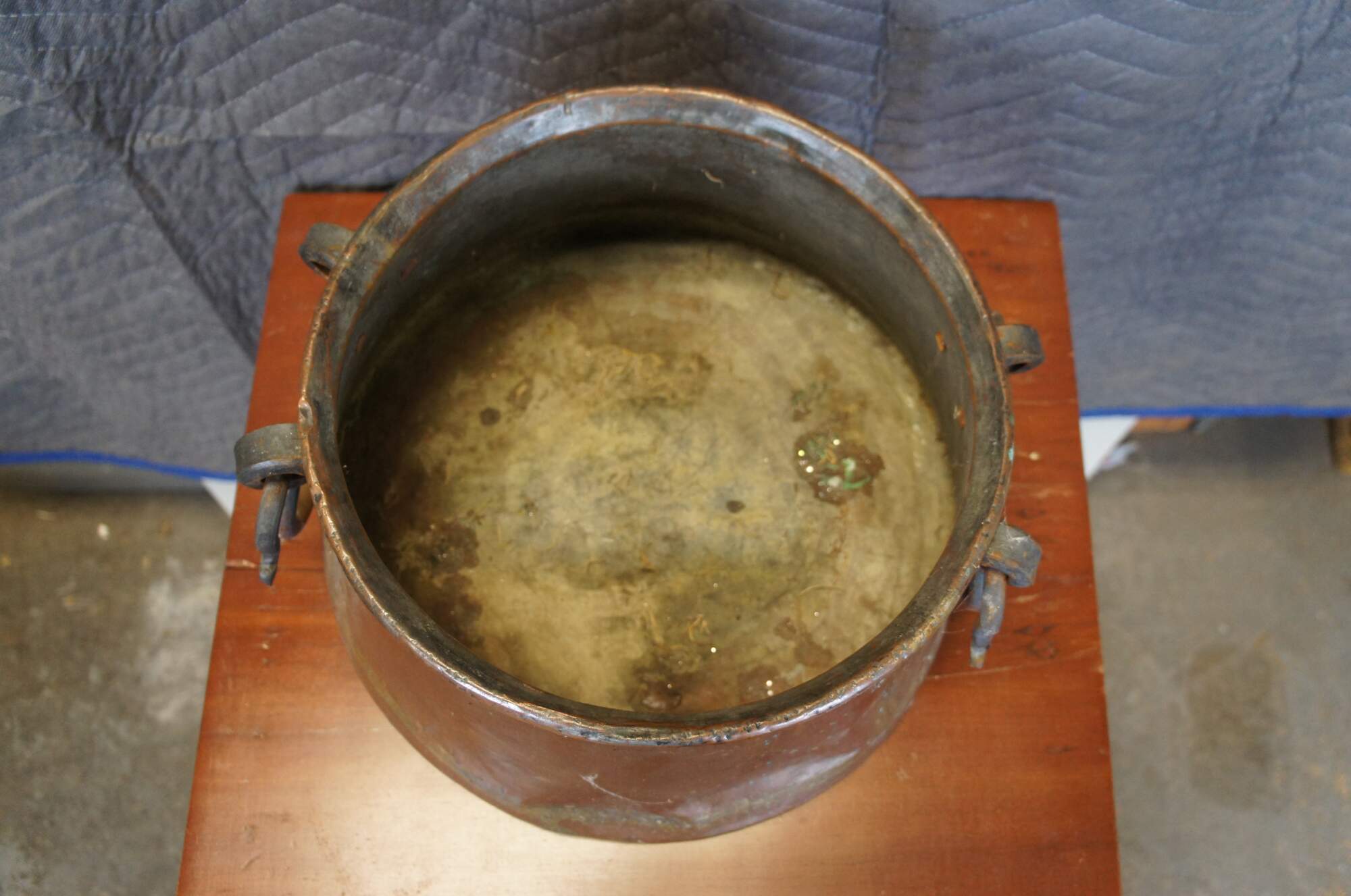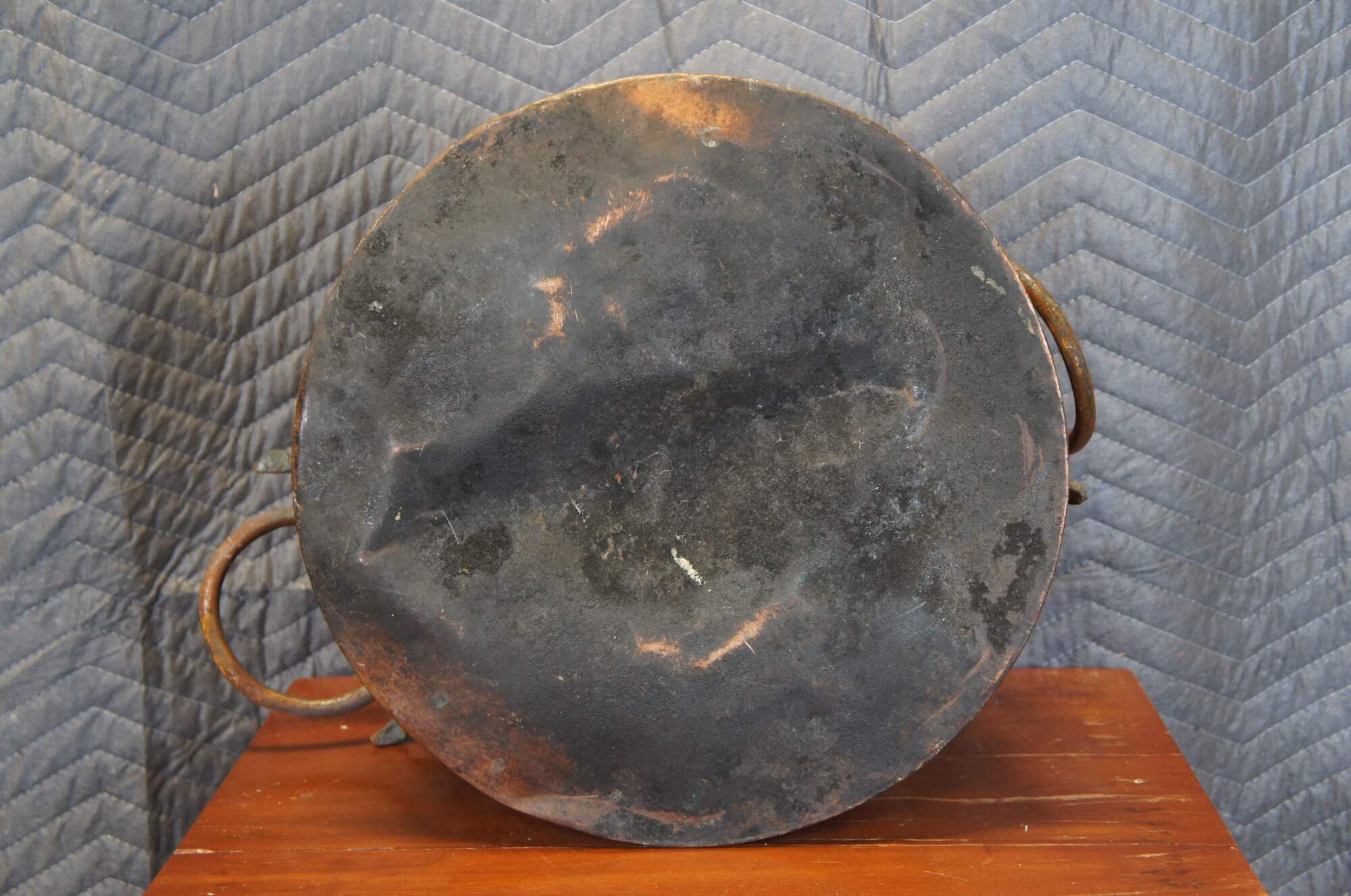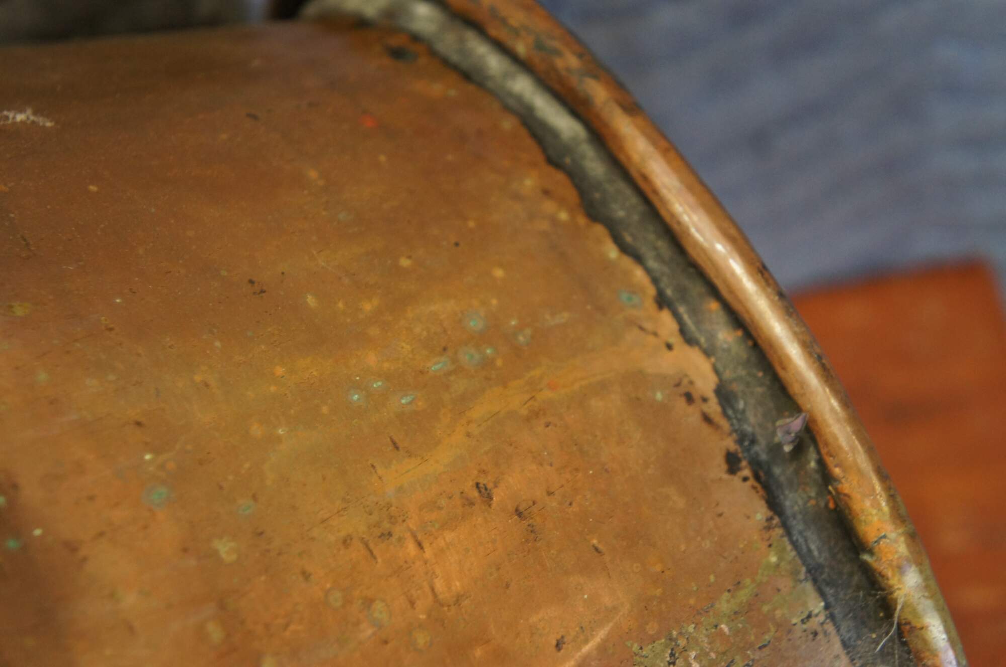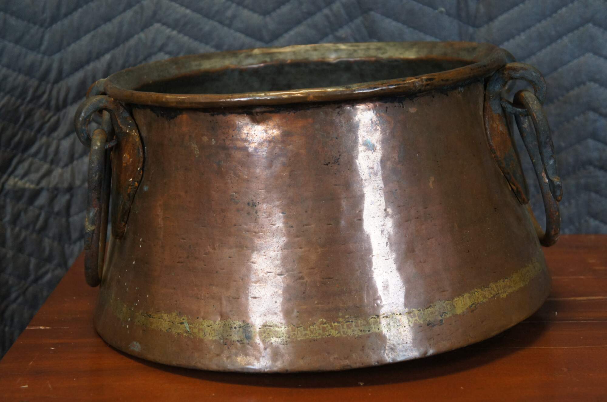 Late 19th century French dovetailed copper cooking pot / cauldron with a wide base, flared rim, and two iron rat tail style bail handles.