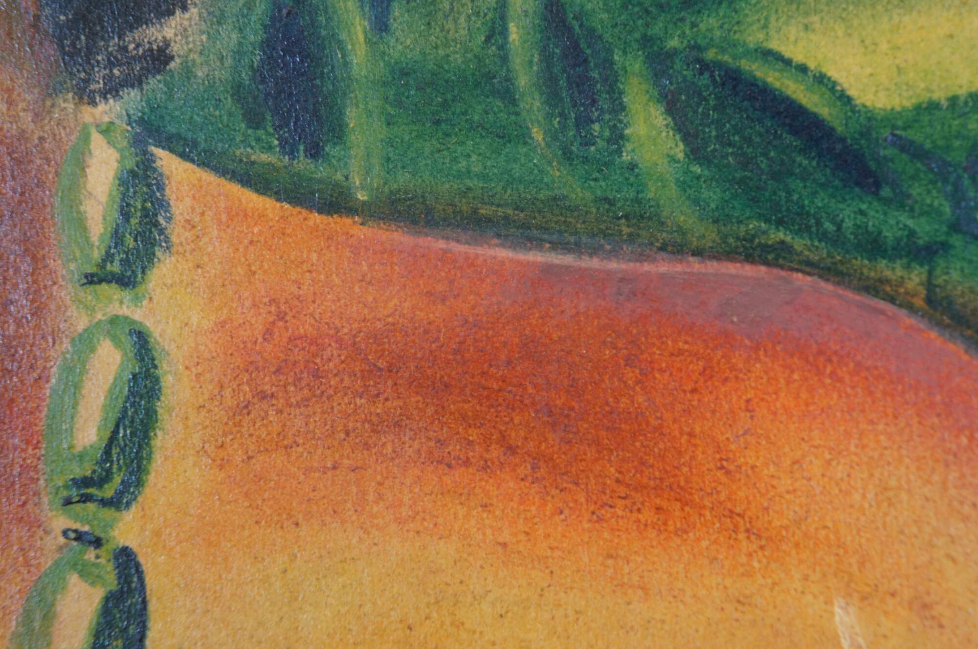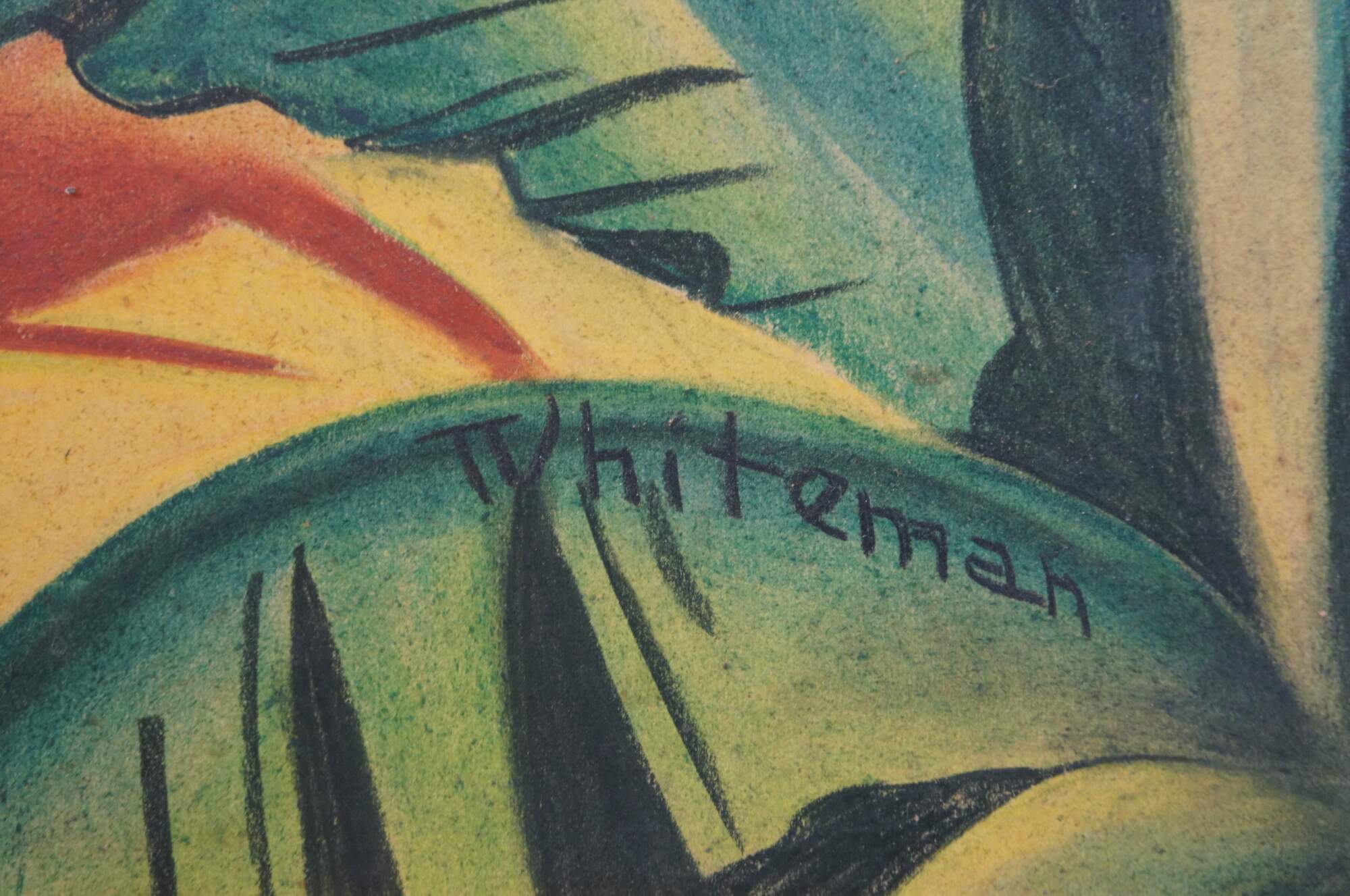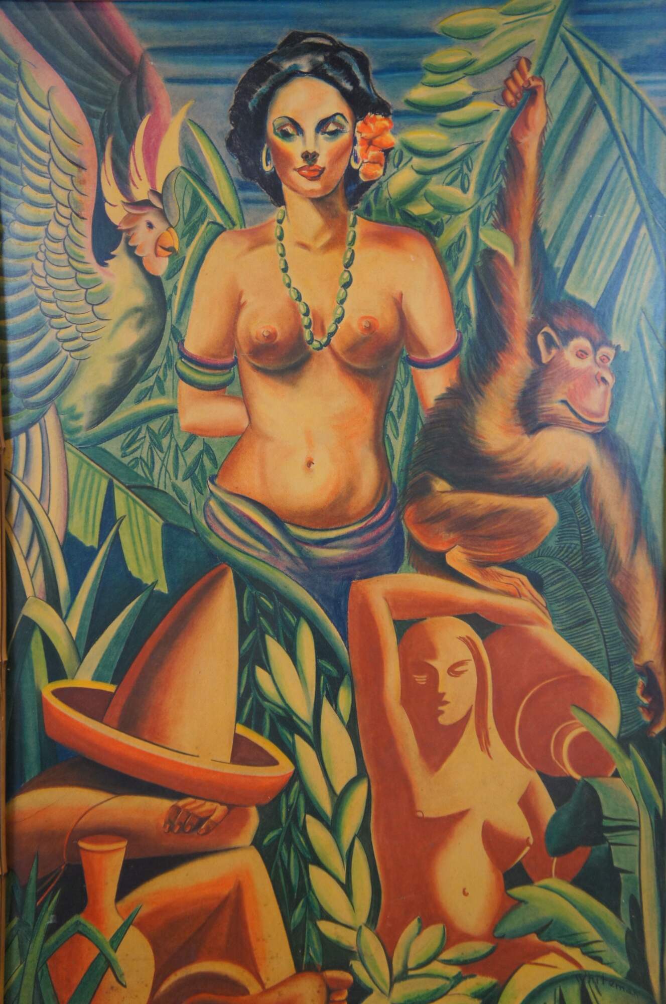 Immense mid 20th century pastel painting on board by Hilbert R. Whiteman, depicting a tropical fantasy scene featuring a topless brunette woman surrounded by terracotta sculptures, lush foliage, a parrot, and monkey. Signed in lower right corner. Bamboo pole frame. Marked/stamped "Property of HR Whiteman - HR Whiteman Art Studio" on reverse.