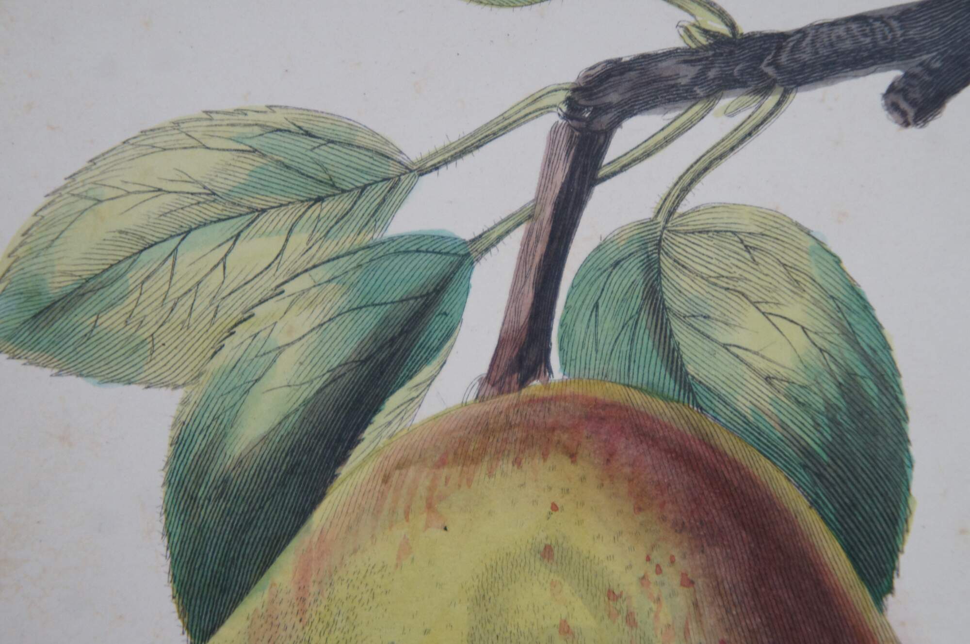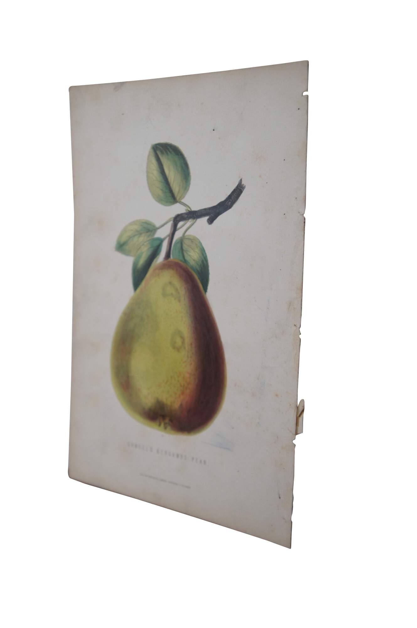 Late 19th century hand colored horticulture engraving of a yellow and red Gansel's Bergamot Pear on a branch, a plate taken from a volume published by William Mackenzie circa 1874.