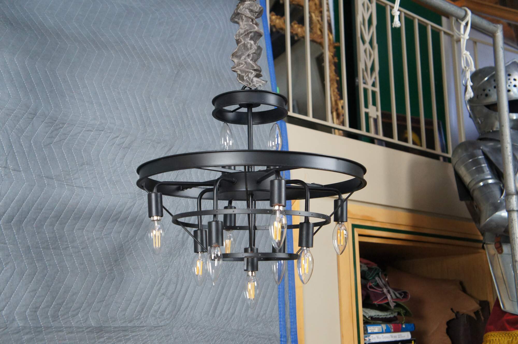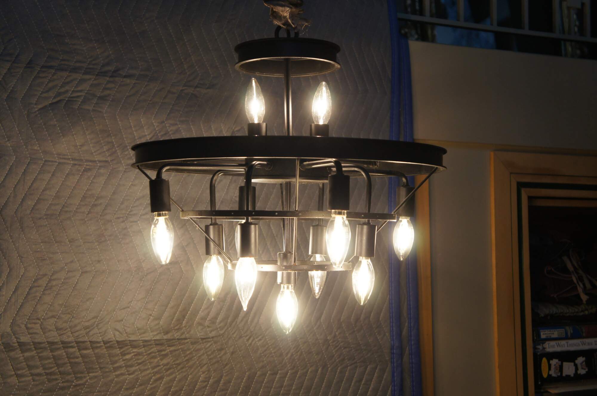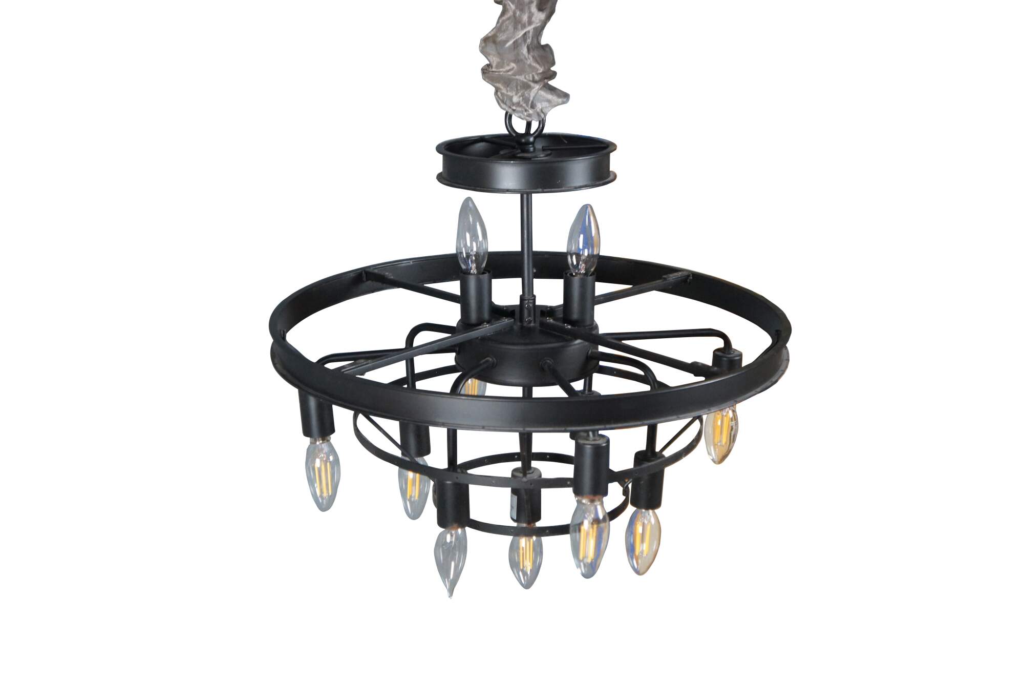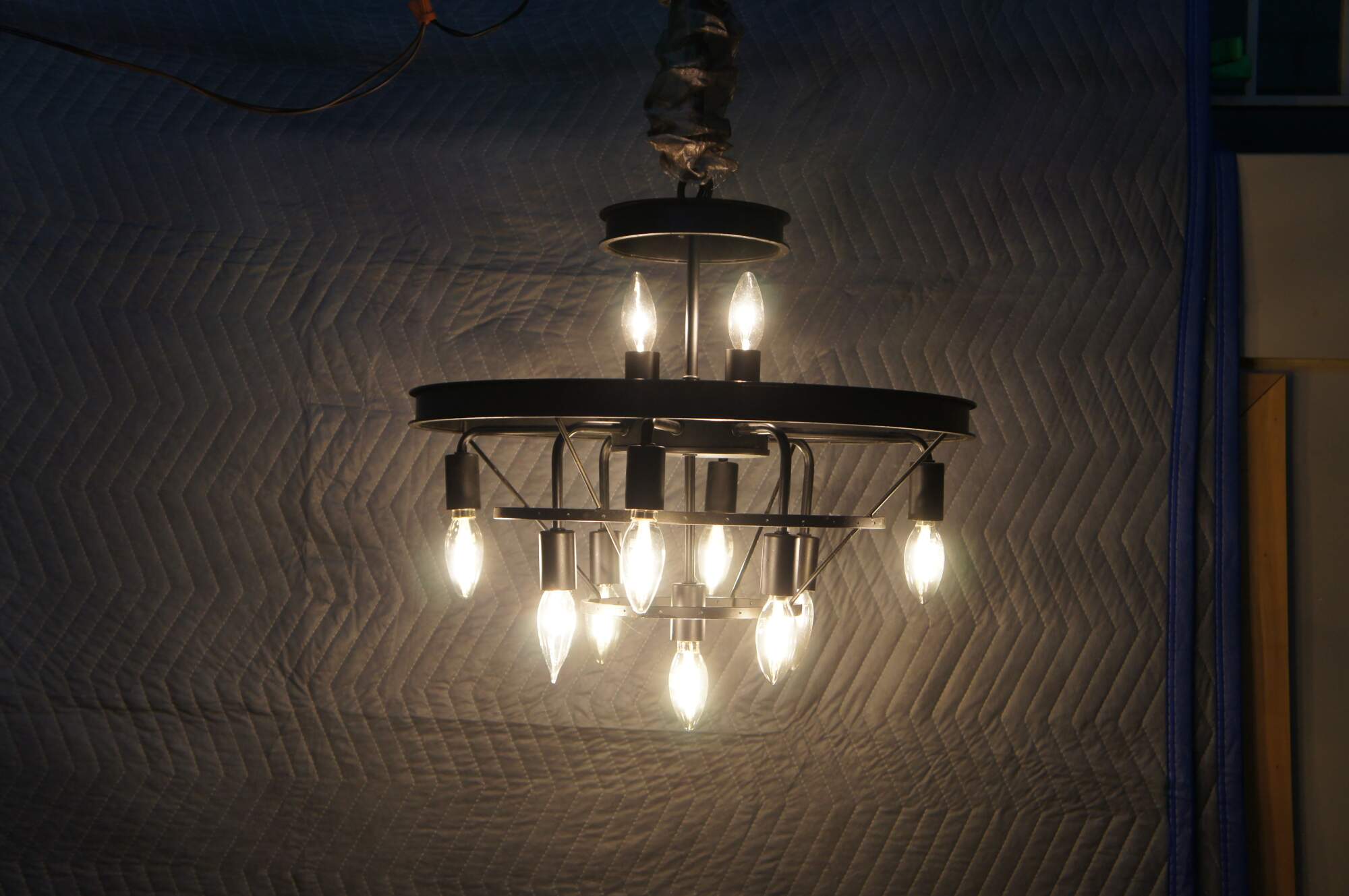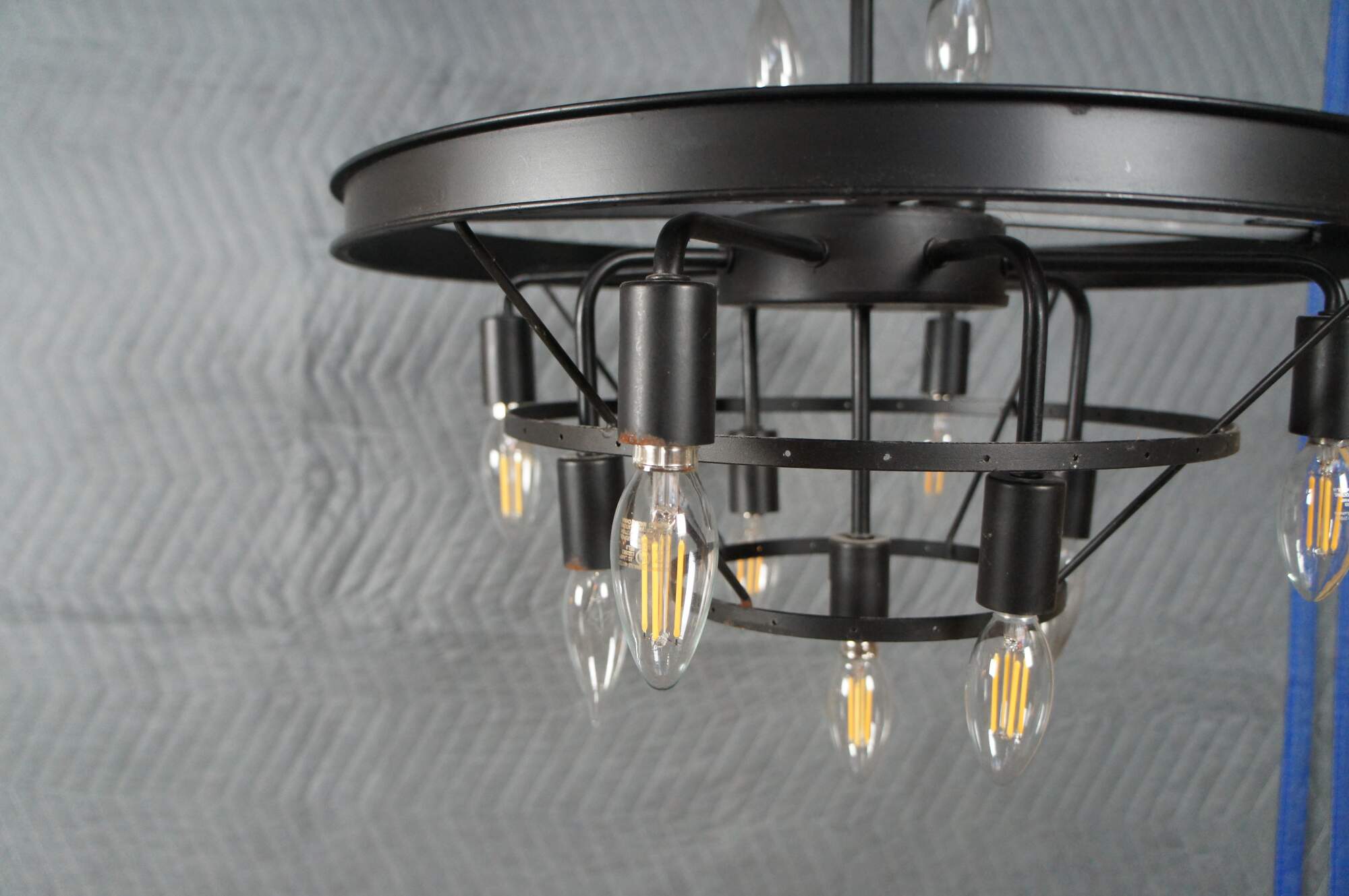Charming modern chandelier with round tiered design featuring 9 downlights and two uplights along the top.