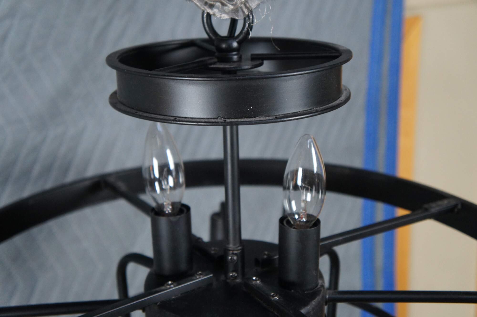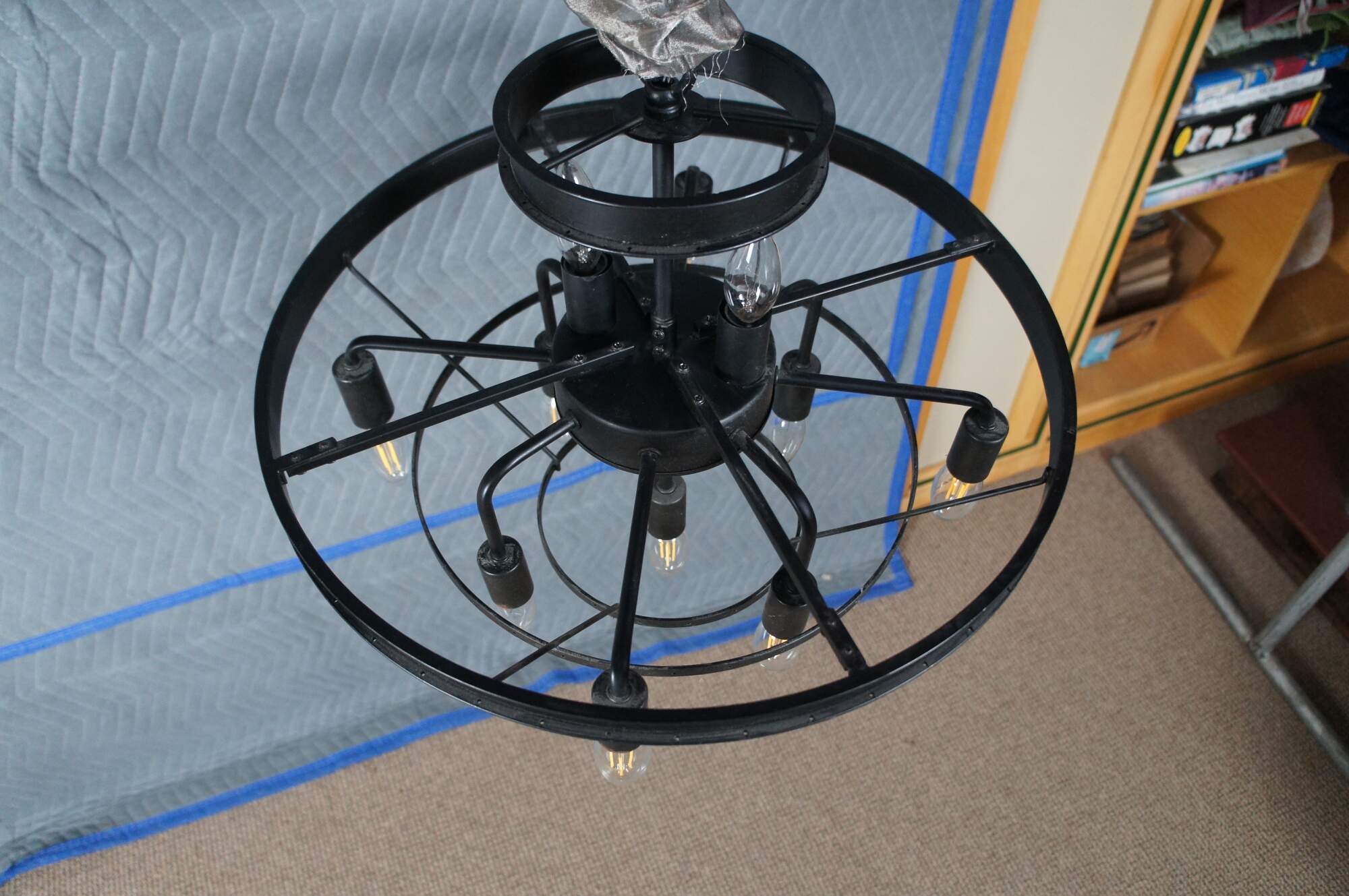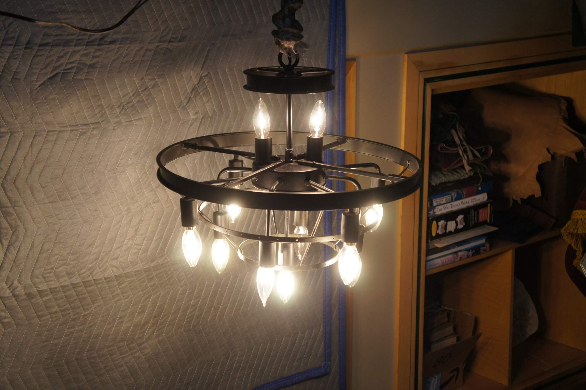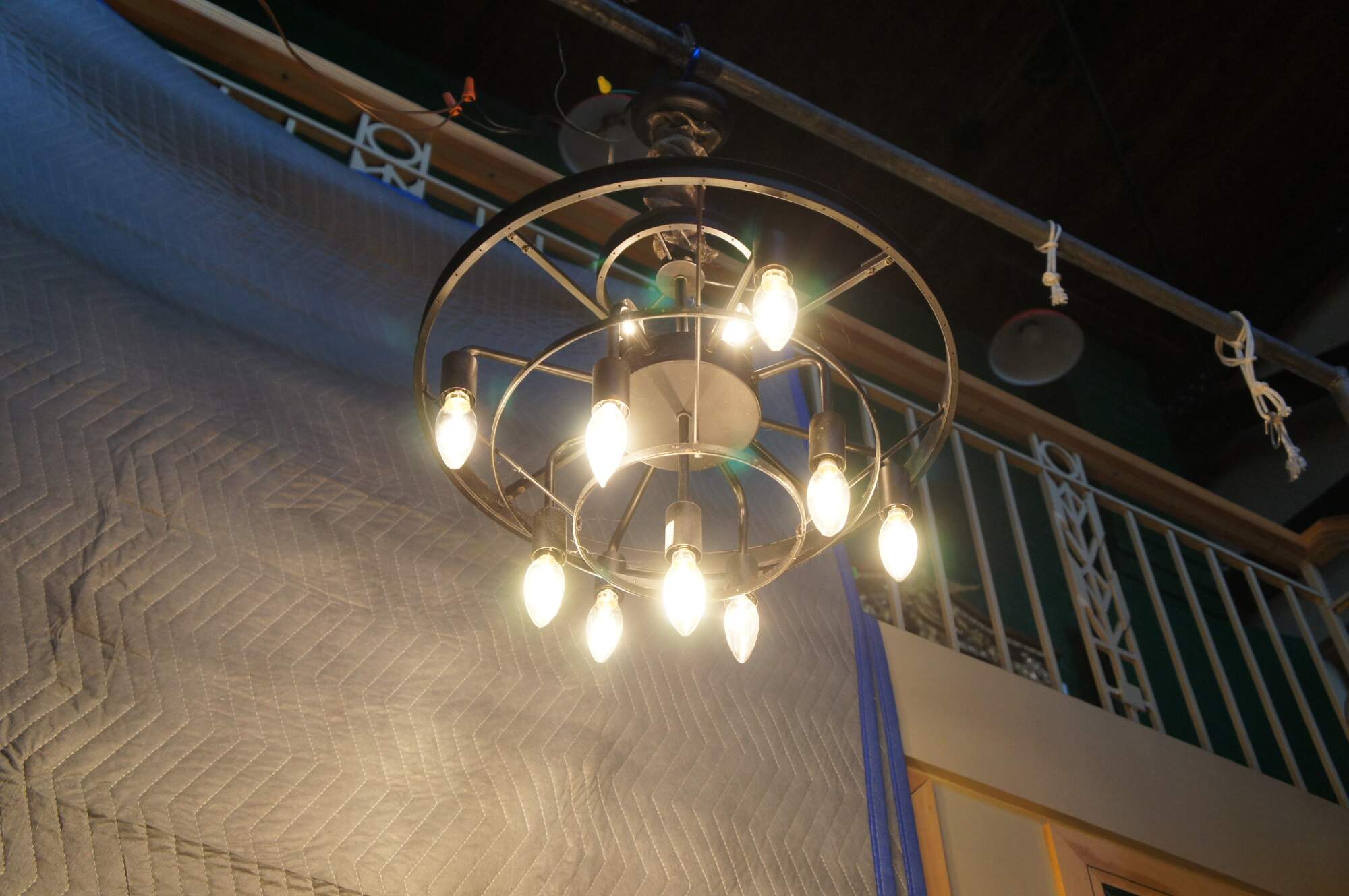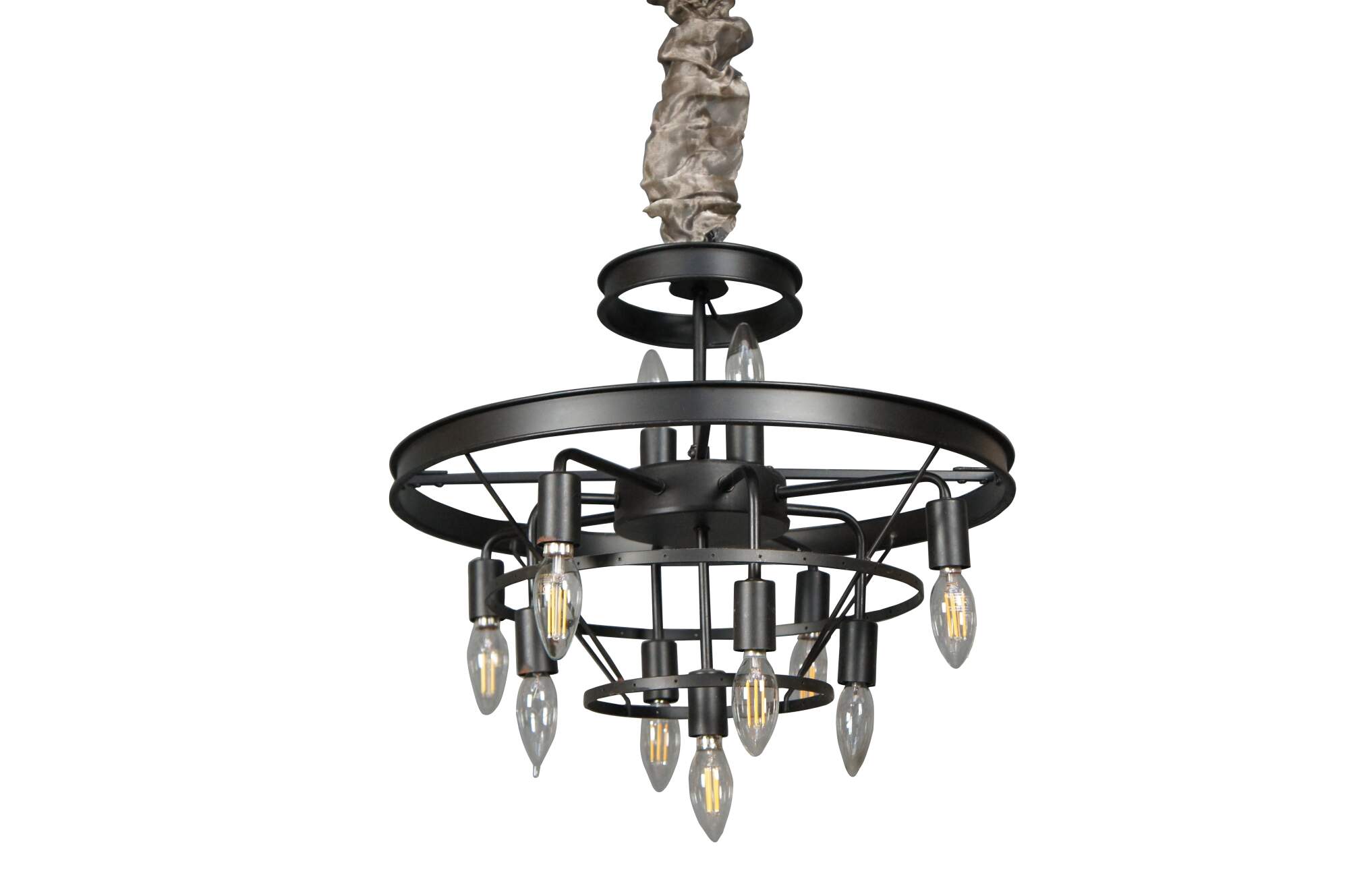 Charming modern chandelier with round tiered design featuring 9 downlights and two uplights along the top.