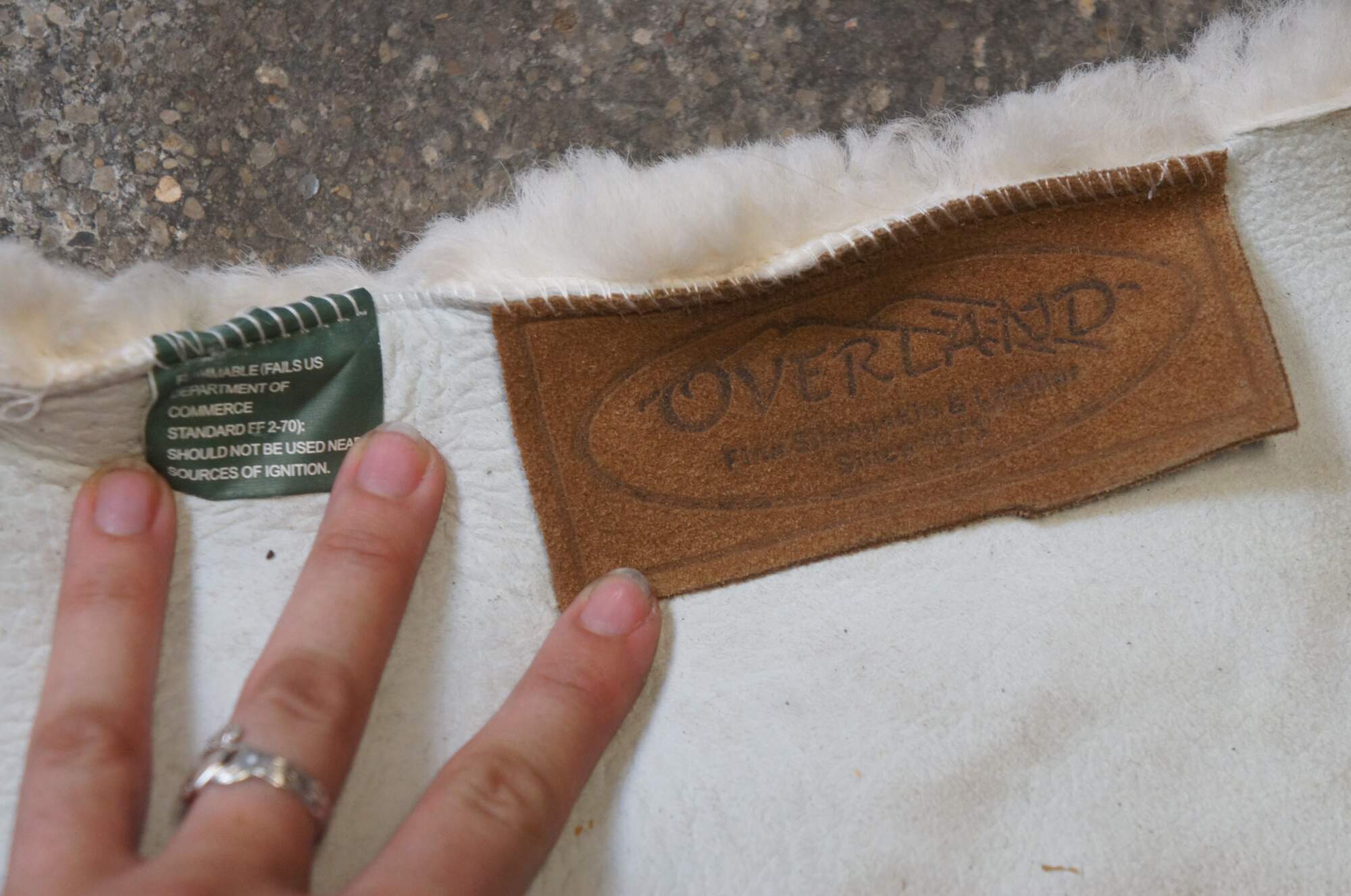 Vintage white Australian sheepskin single pelt rug / mat by Overland Fine Sheepskin and Leather.