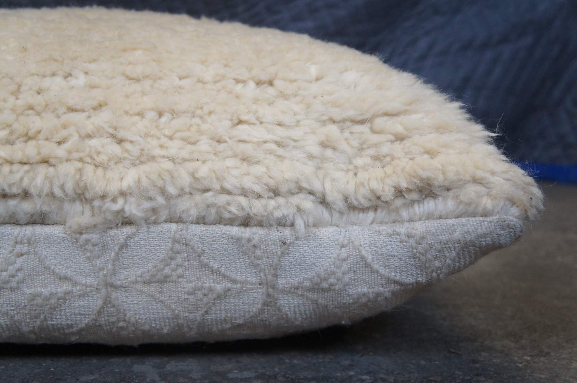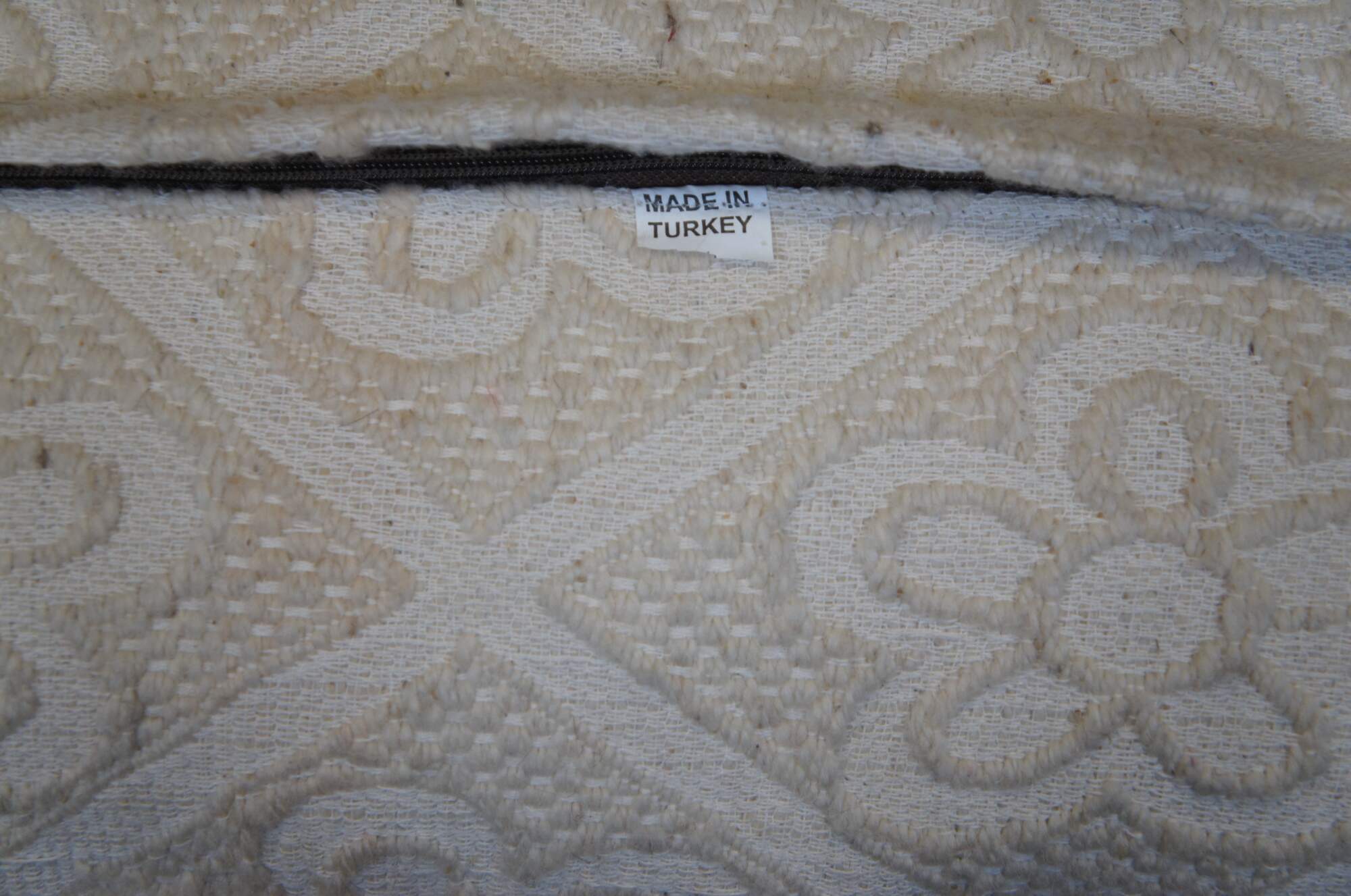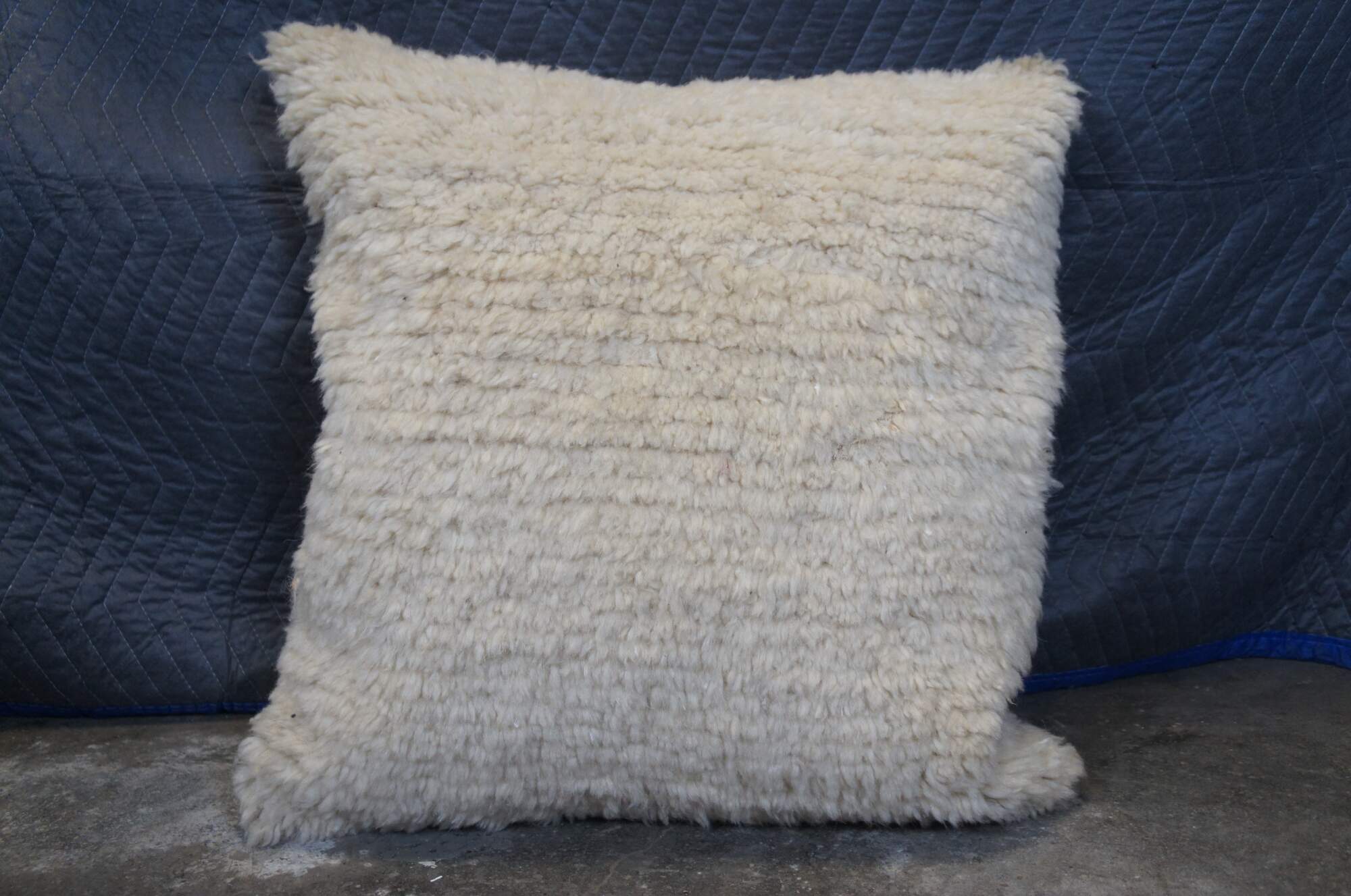 Set of 3 late 20th century white wool kilim / tulu accent pillows, with fuzzy fronts and floral / geometric embroidered backs. Down / white duck feather filled. Zipper closure. Made in Turkey.