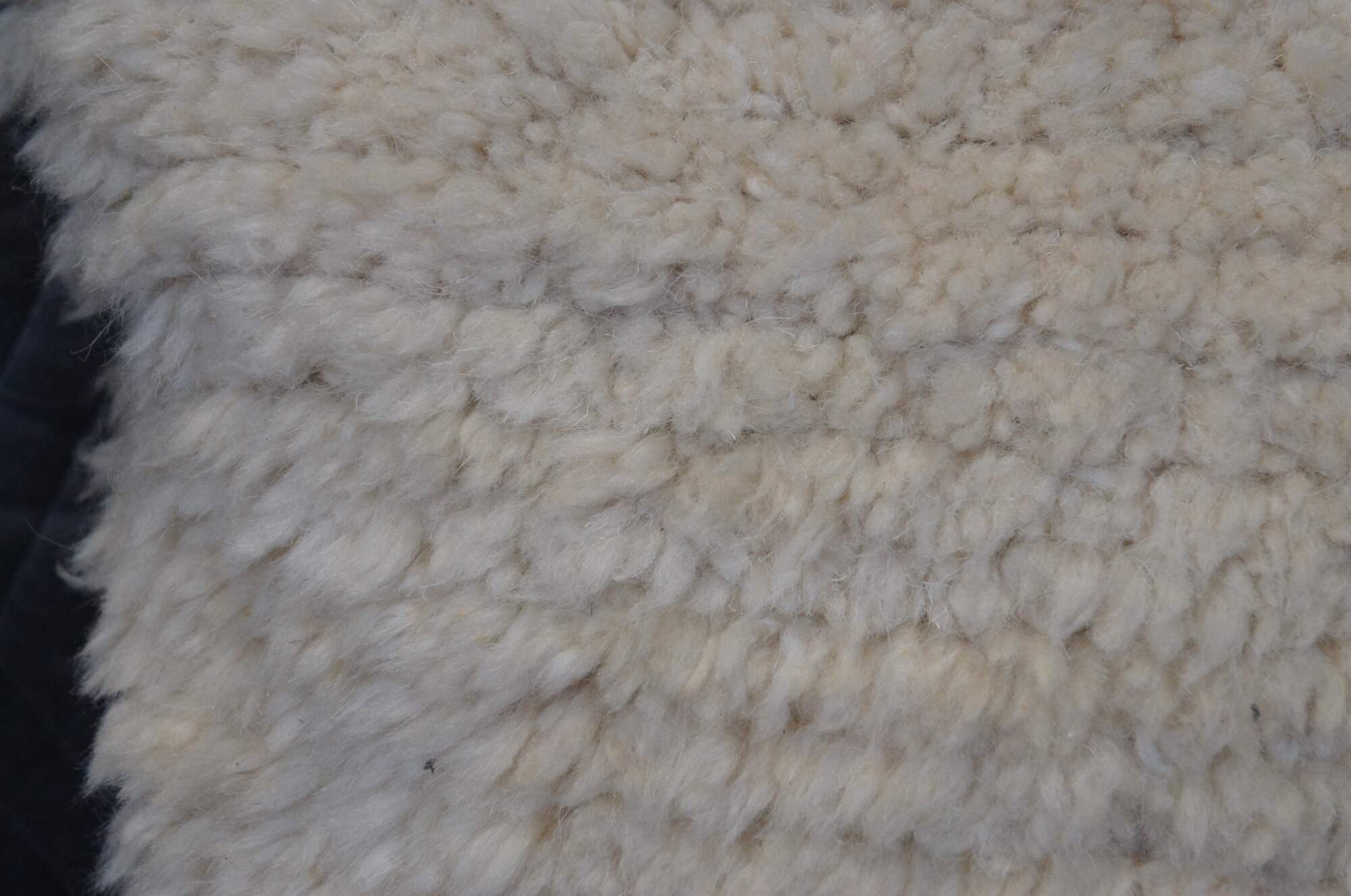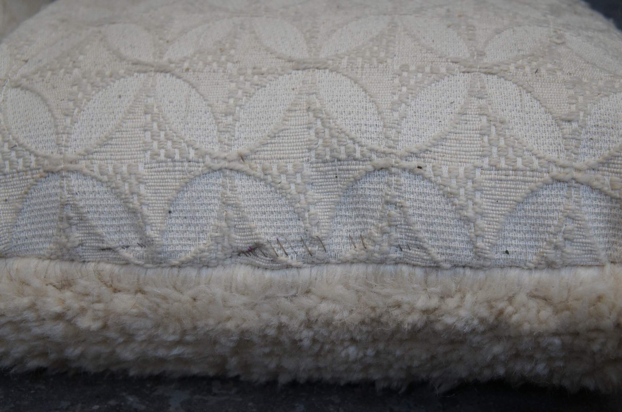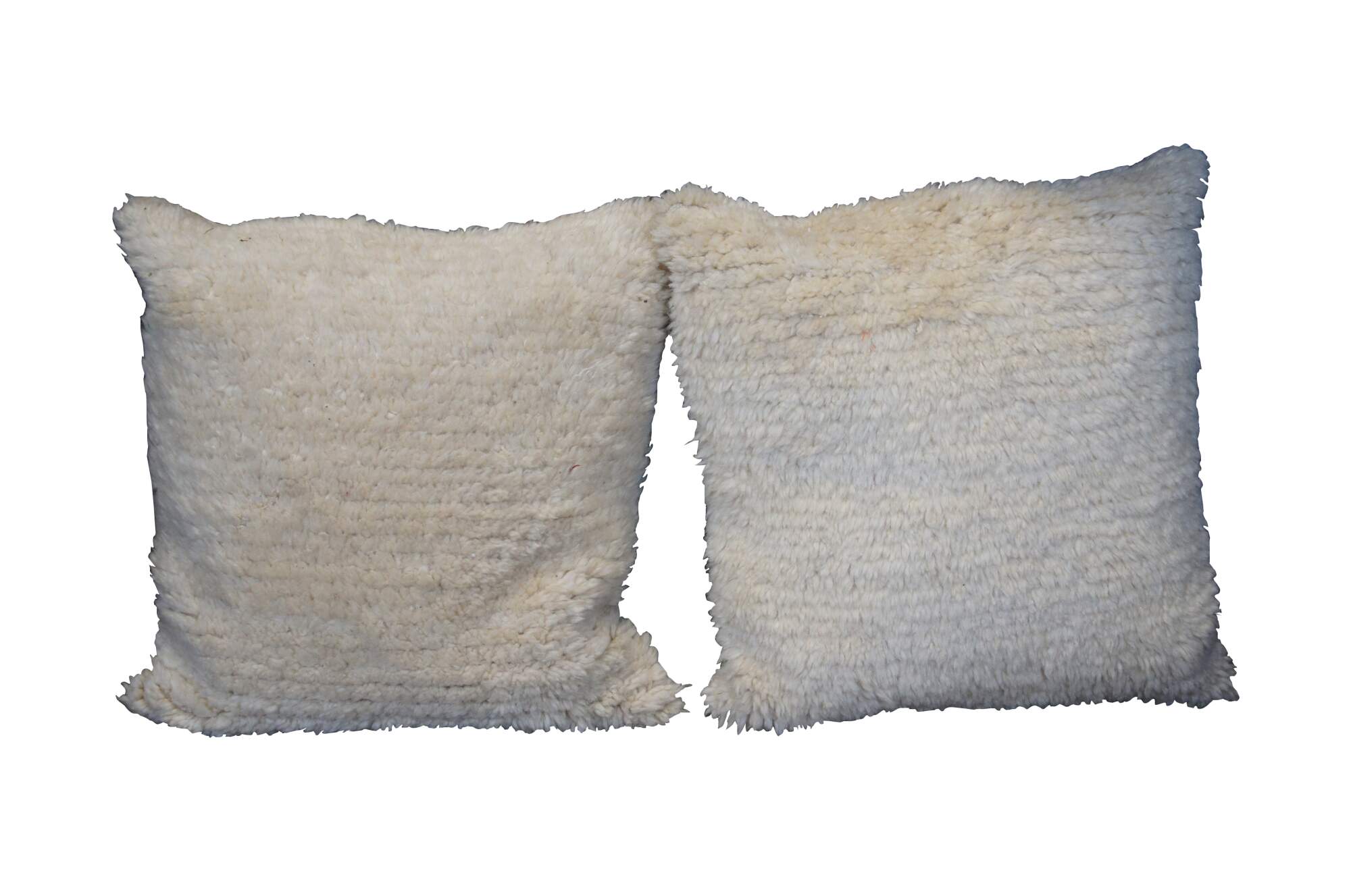 Set of 3 late 20th century white wool kilim / tulu accent pillows, with fuzzy fronts and floral / geometric embroidered backs. Down / white duck feather filled. Zipper closure. Made in Turkey.