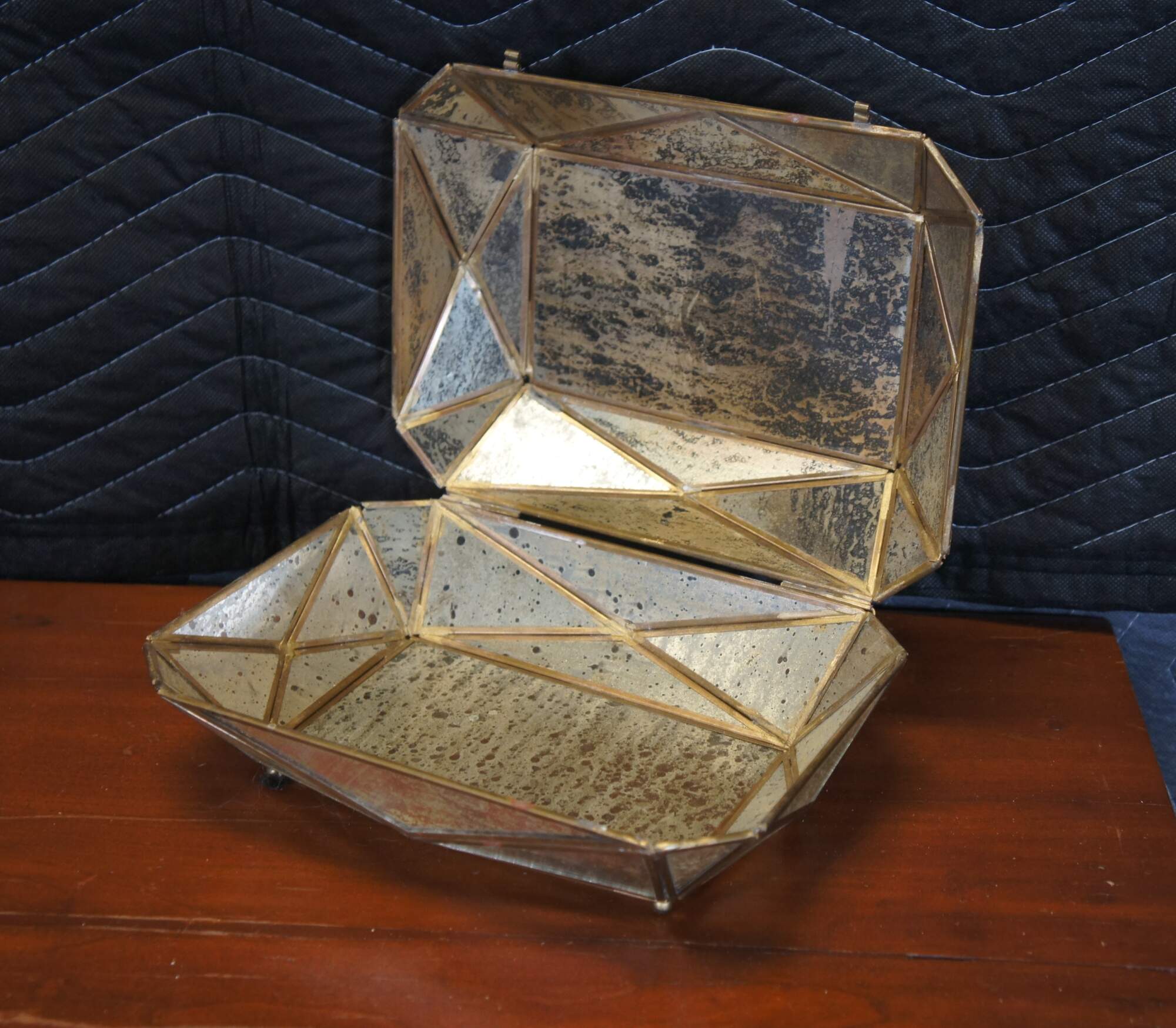 Late 20th century Diamond #2 jewelry / trinket box by Aidan Gray. Multi-faceted geometric form with a brass frame holding gold flecked mirrored glass panels. Item number: AIDAN-D349. Discontinued.