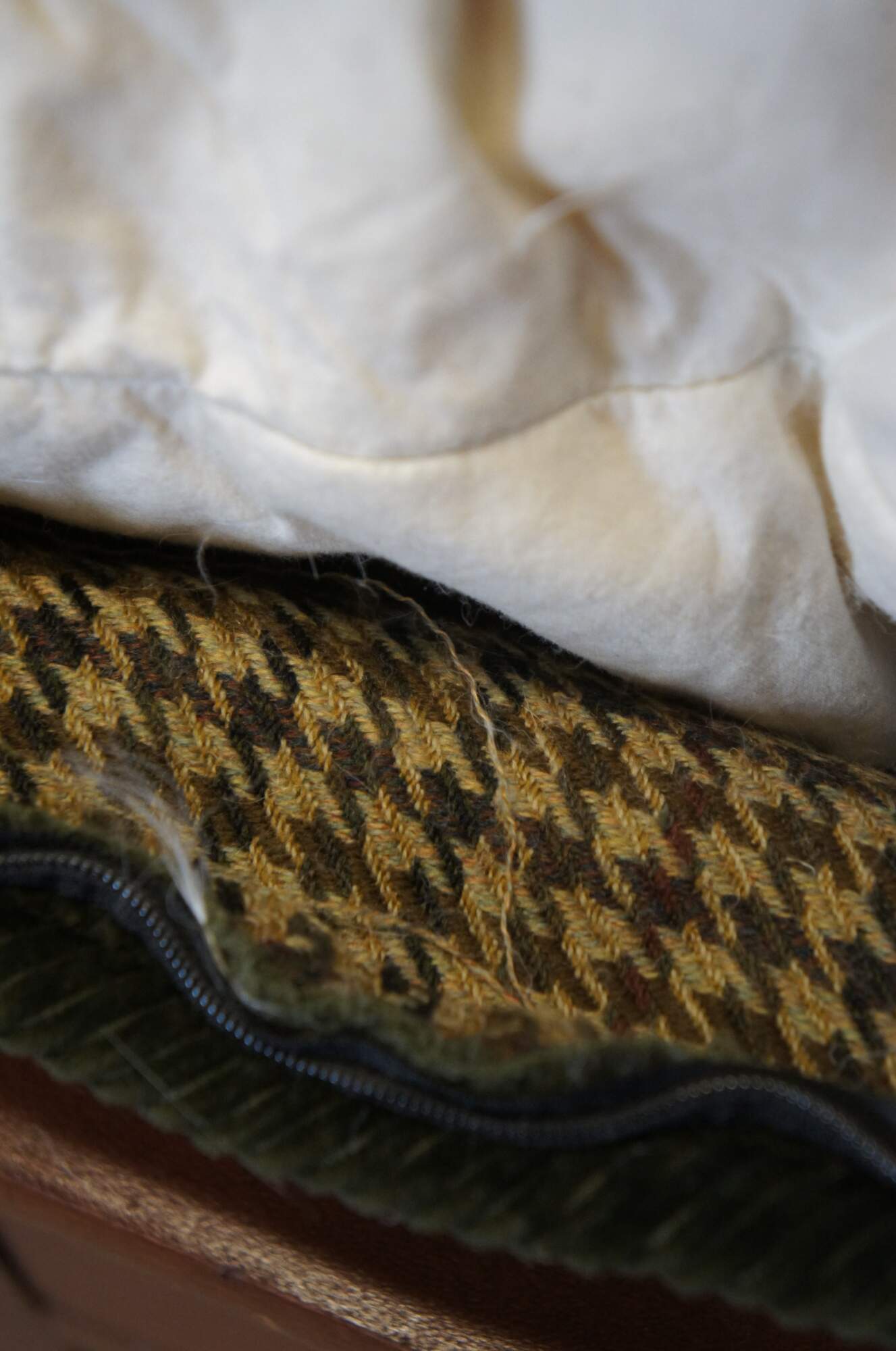 Late 20th century down filled square throw / accent pillow, houdnstooth tween in beige, gray, olive green, and red front with olive green courderoy back and piping. Zipper closure.
