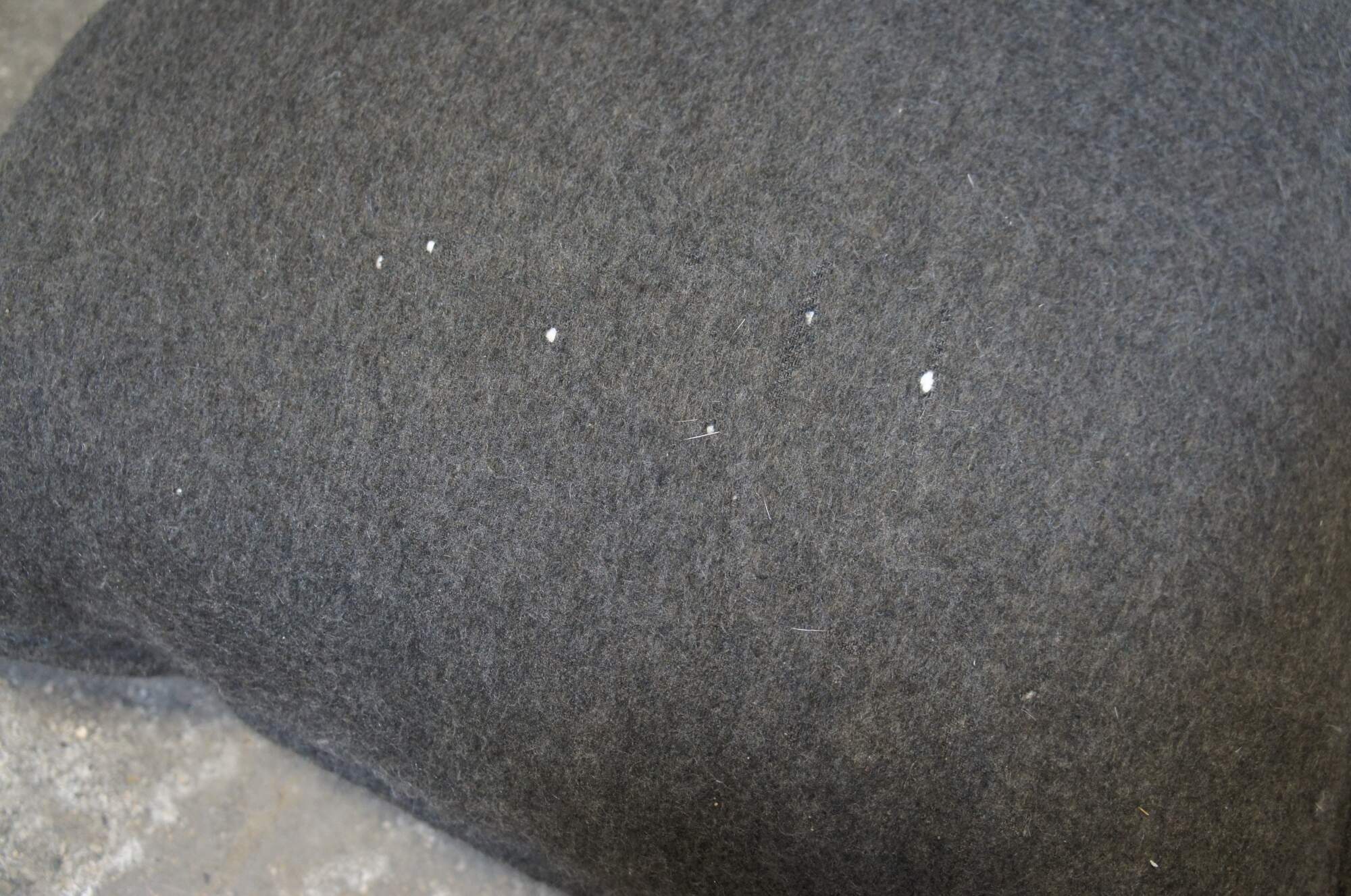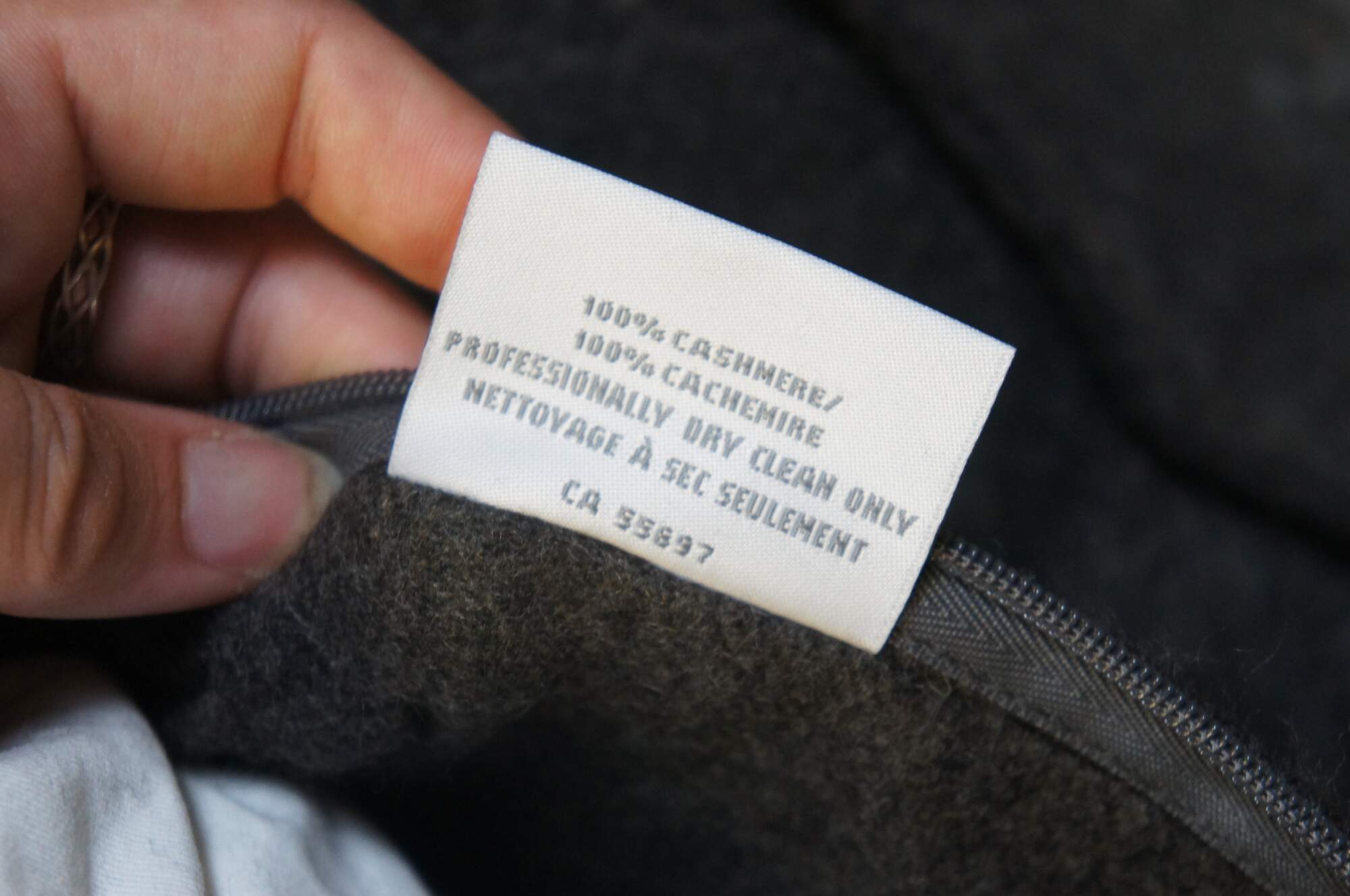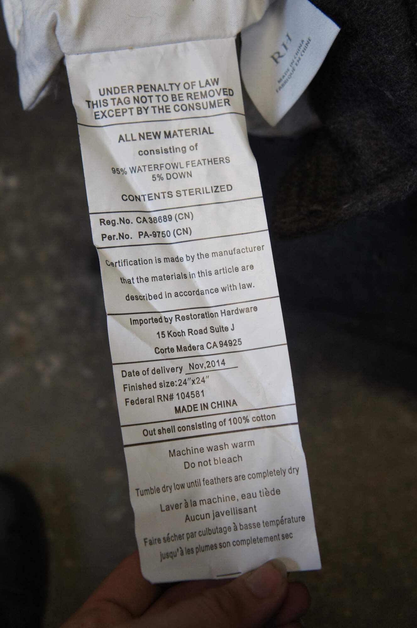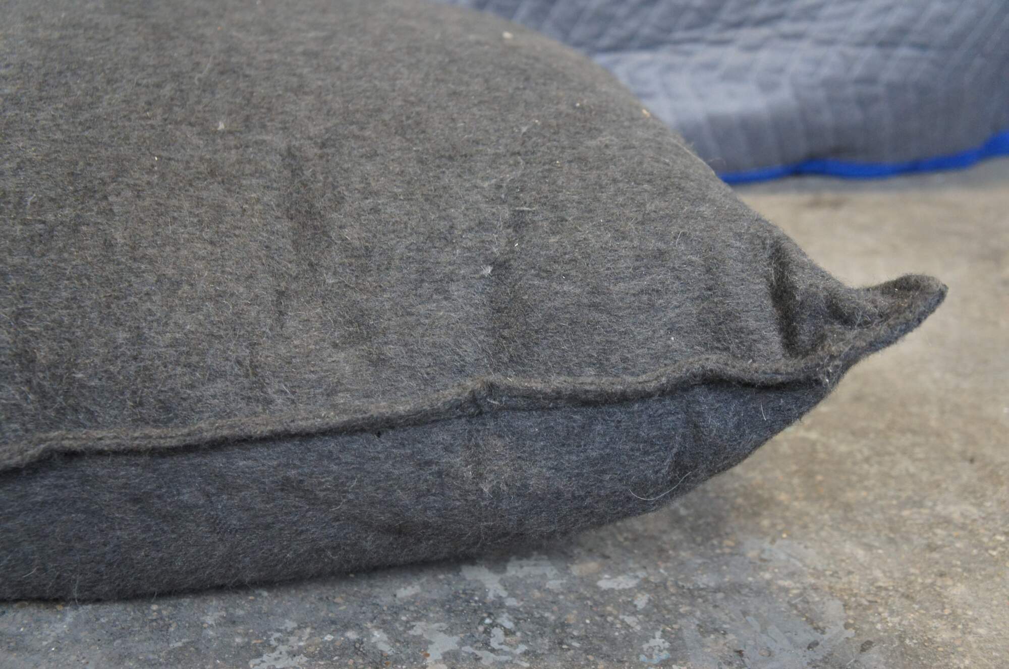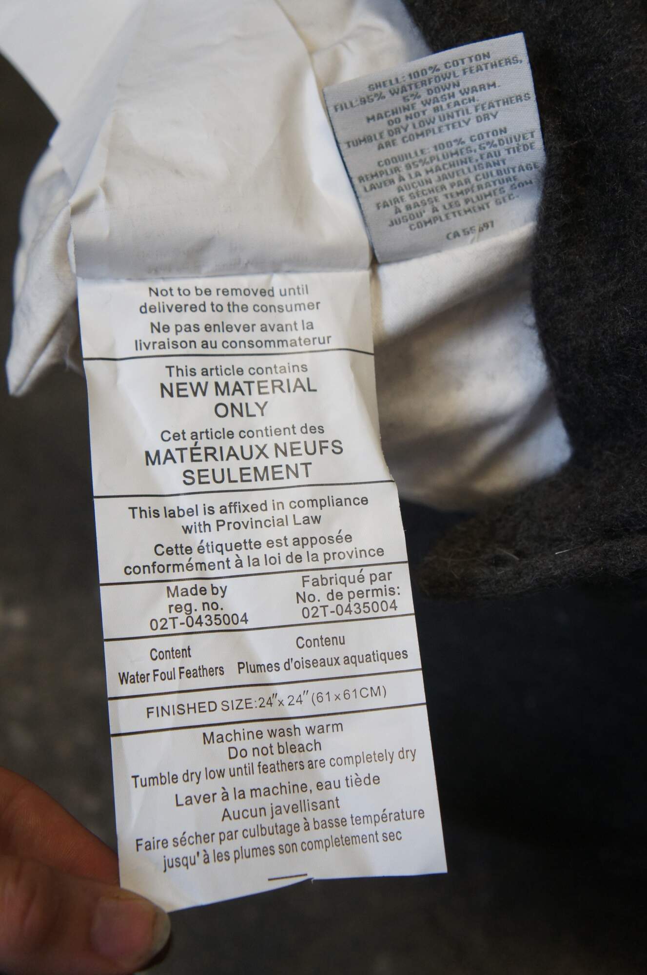 Very large pair of Restoration Hardware felted charcoal gray, 100% cashmere square throw pillows; down / waterfowl feather filled. Zipper closure.