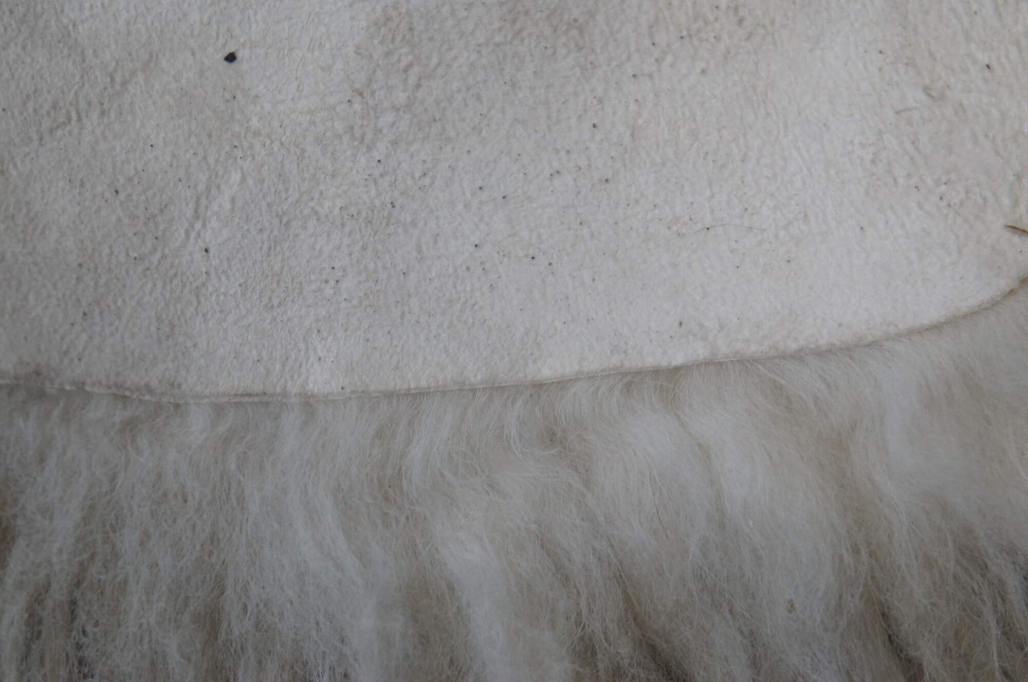 Late 20th century Eco Products Icelandic sheepskin rug - white long-haired / curly sheep hide with large gray spot at the center. Sueded back.