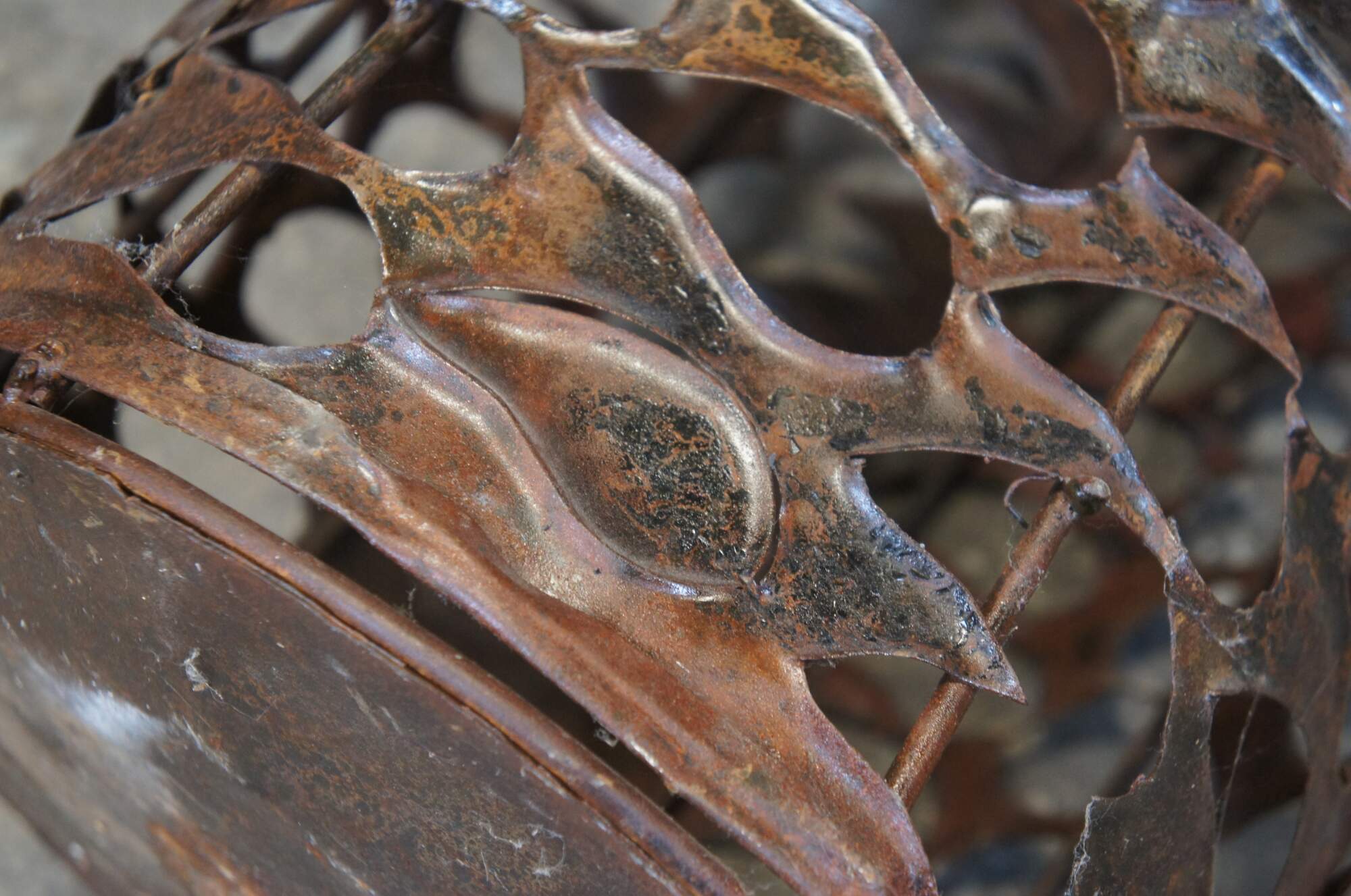 Late 20th century sculptural / brutalist apple sorting style vessel, cylindrical in form made of artistically rusted iron pierced with rows of leaf shapes around a solid base. Could be used as a floor vase to display dried / artificial flower arrangements / foliage or as an umbrella / cane stand / trash can.