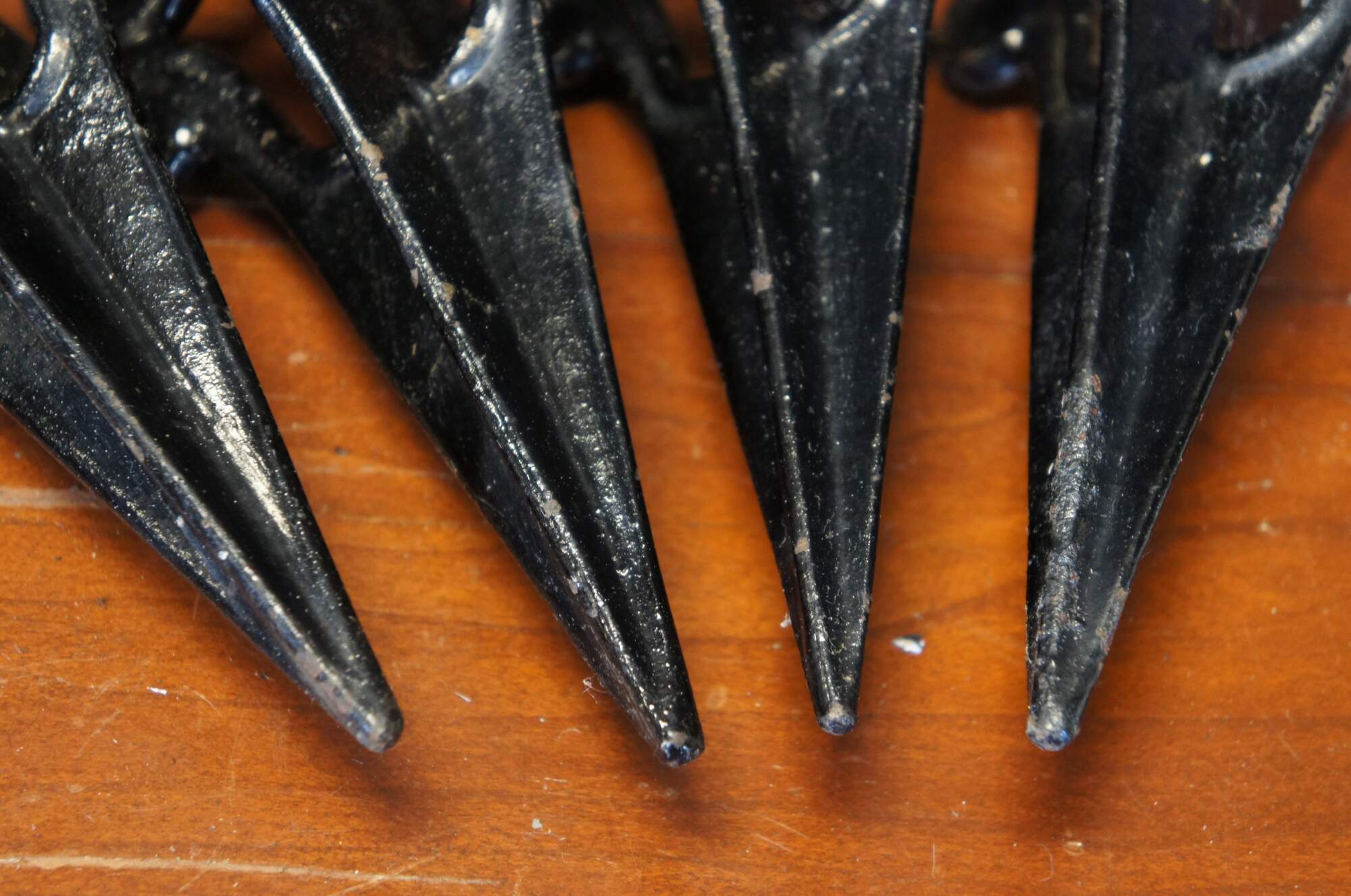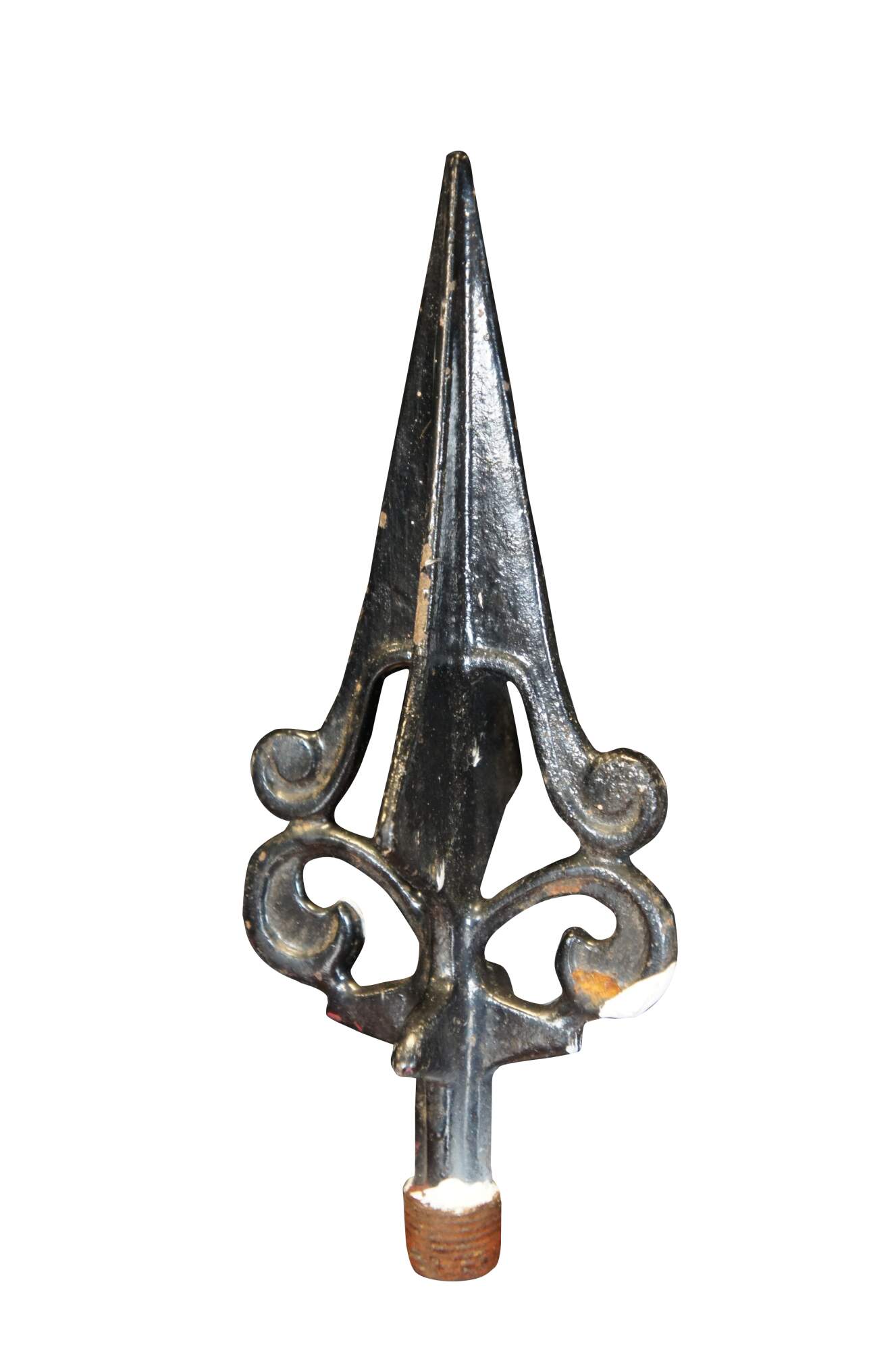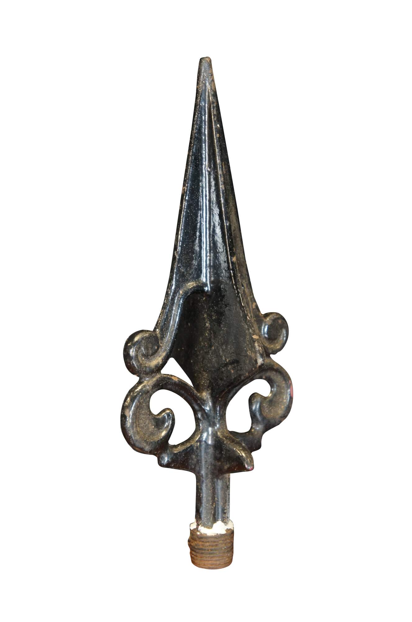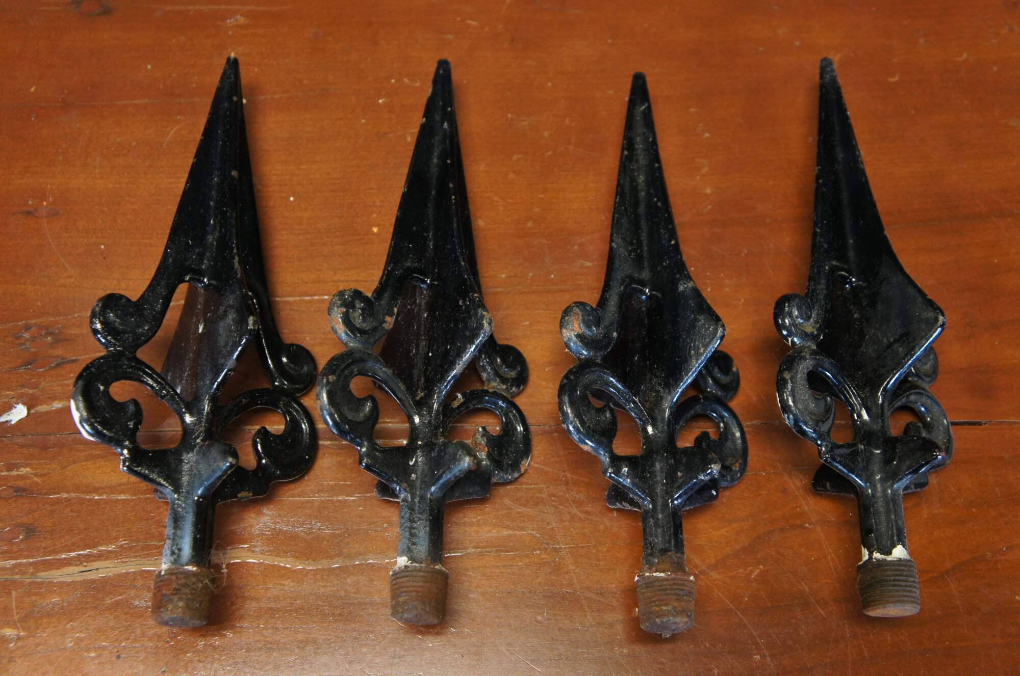 Set of four 20th century cast iron fence post toppers - arrow shaped spike with scrolled accents and threaded bases. Finished in black enamel.