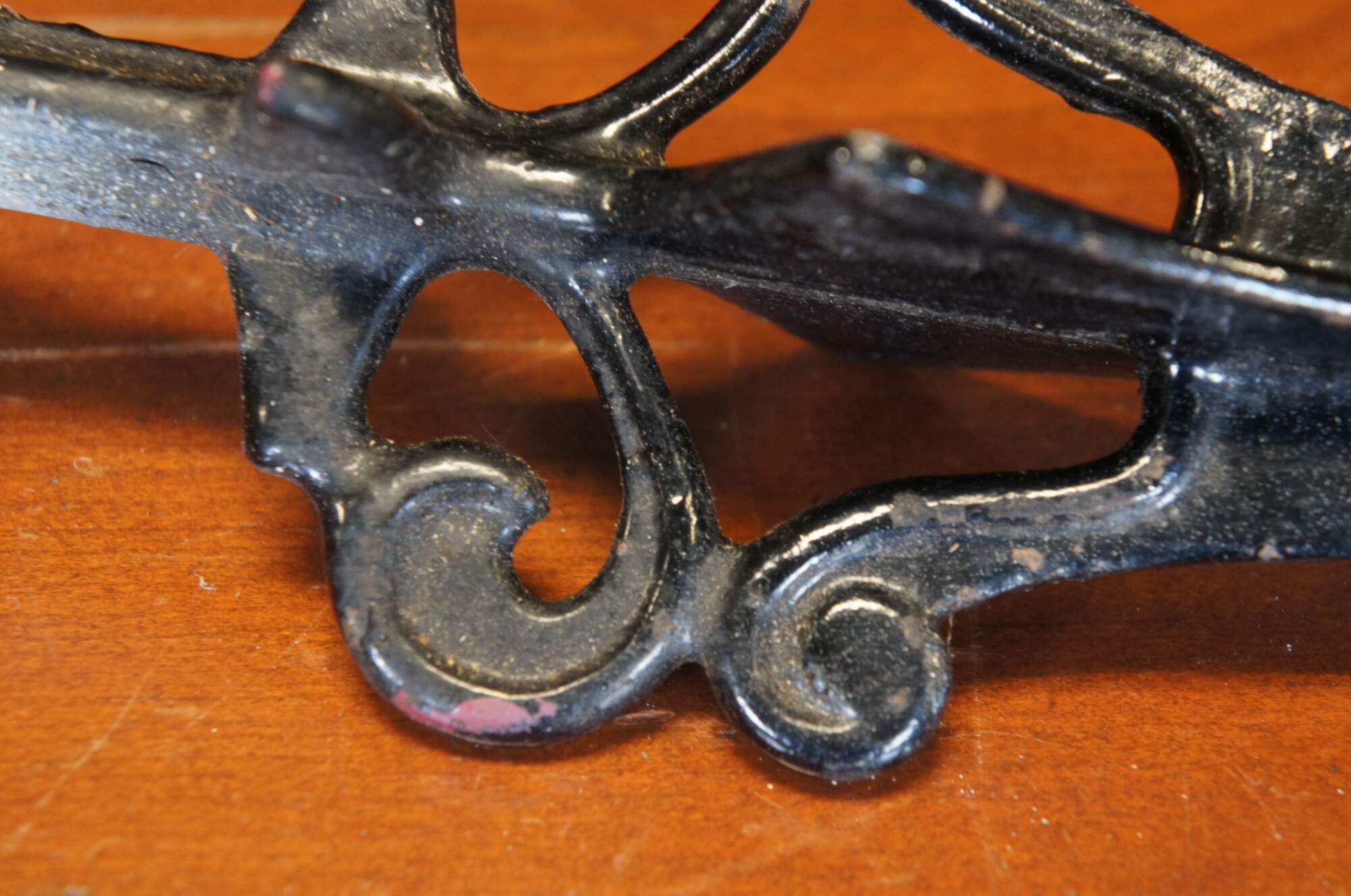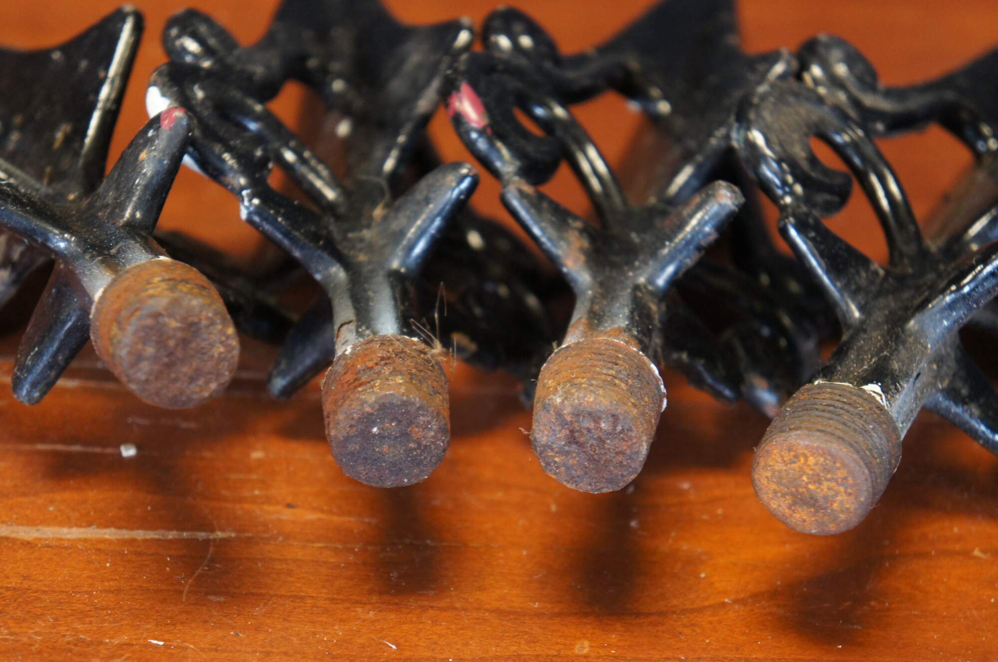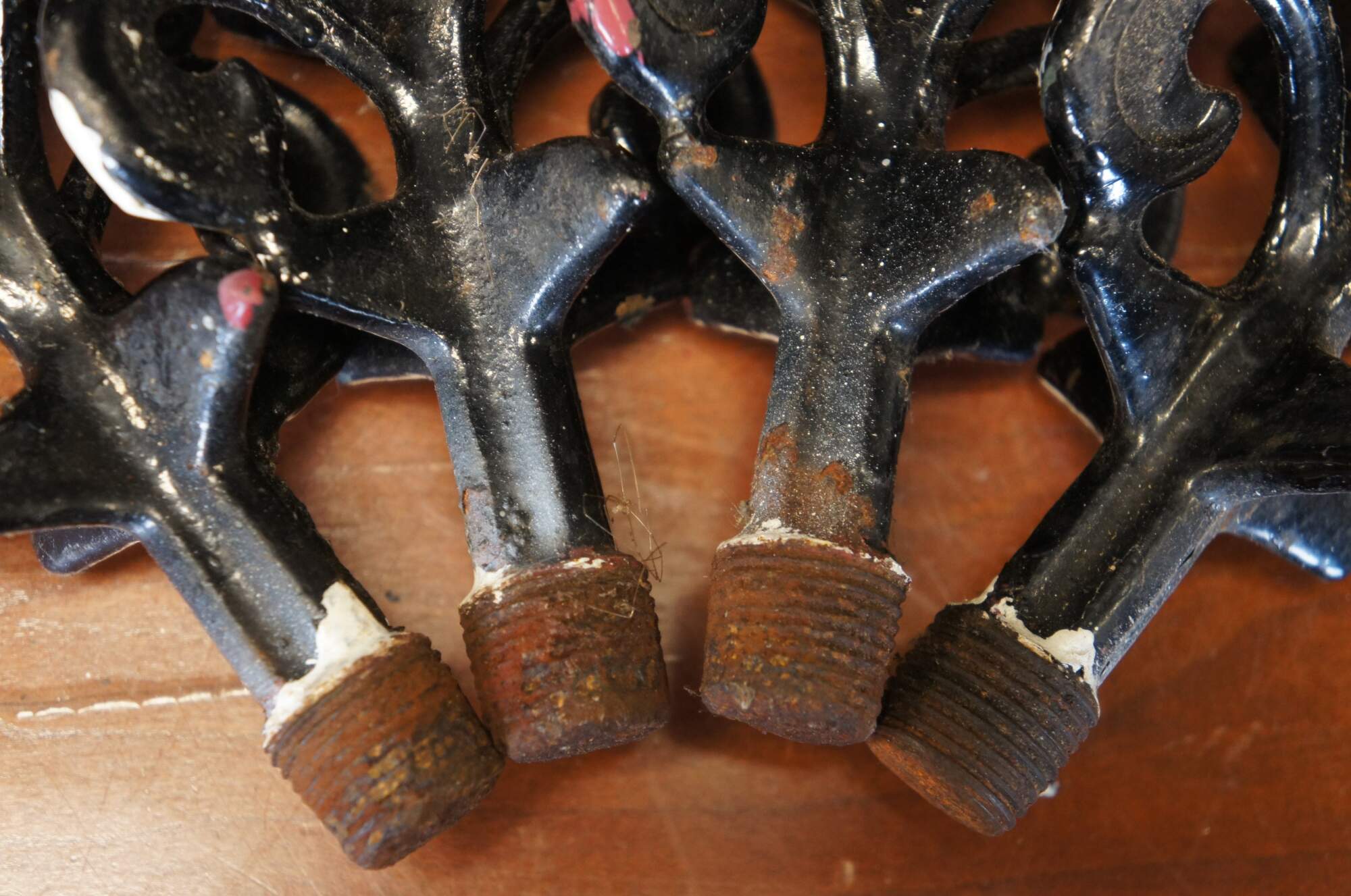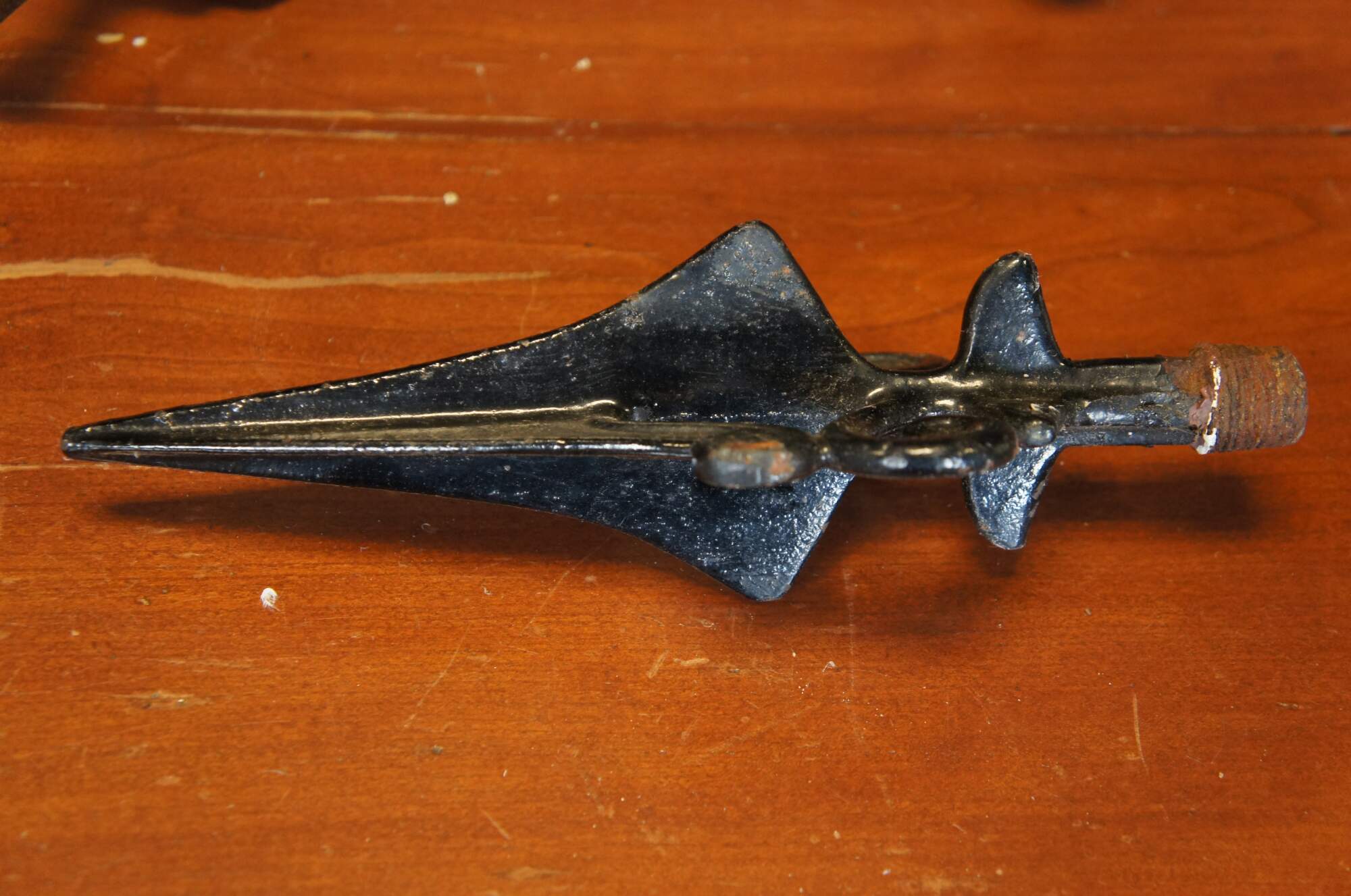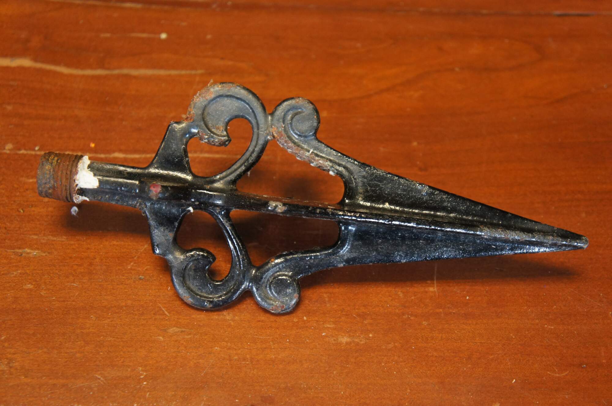 Set of four 20th century cast iron fence post toppers - arrow shaped spike with scrolled accents and threaded bases. Finished in black enamel.