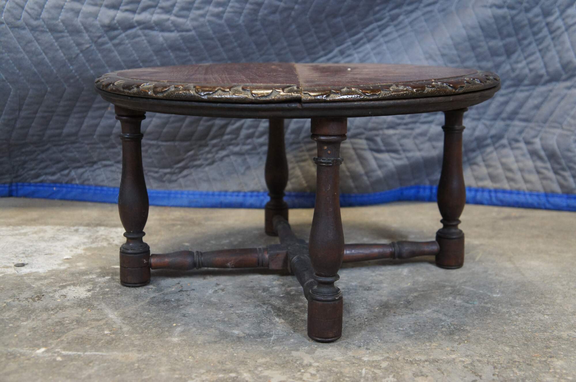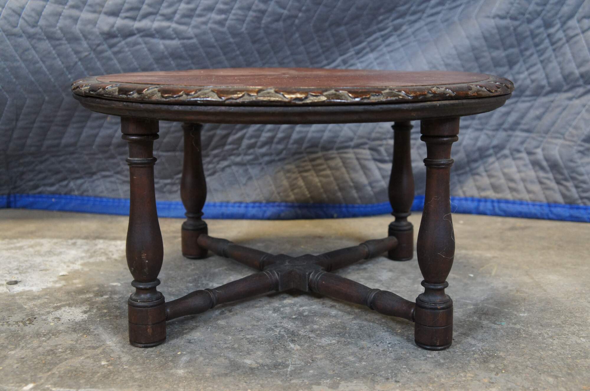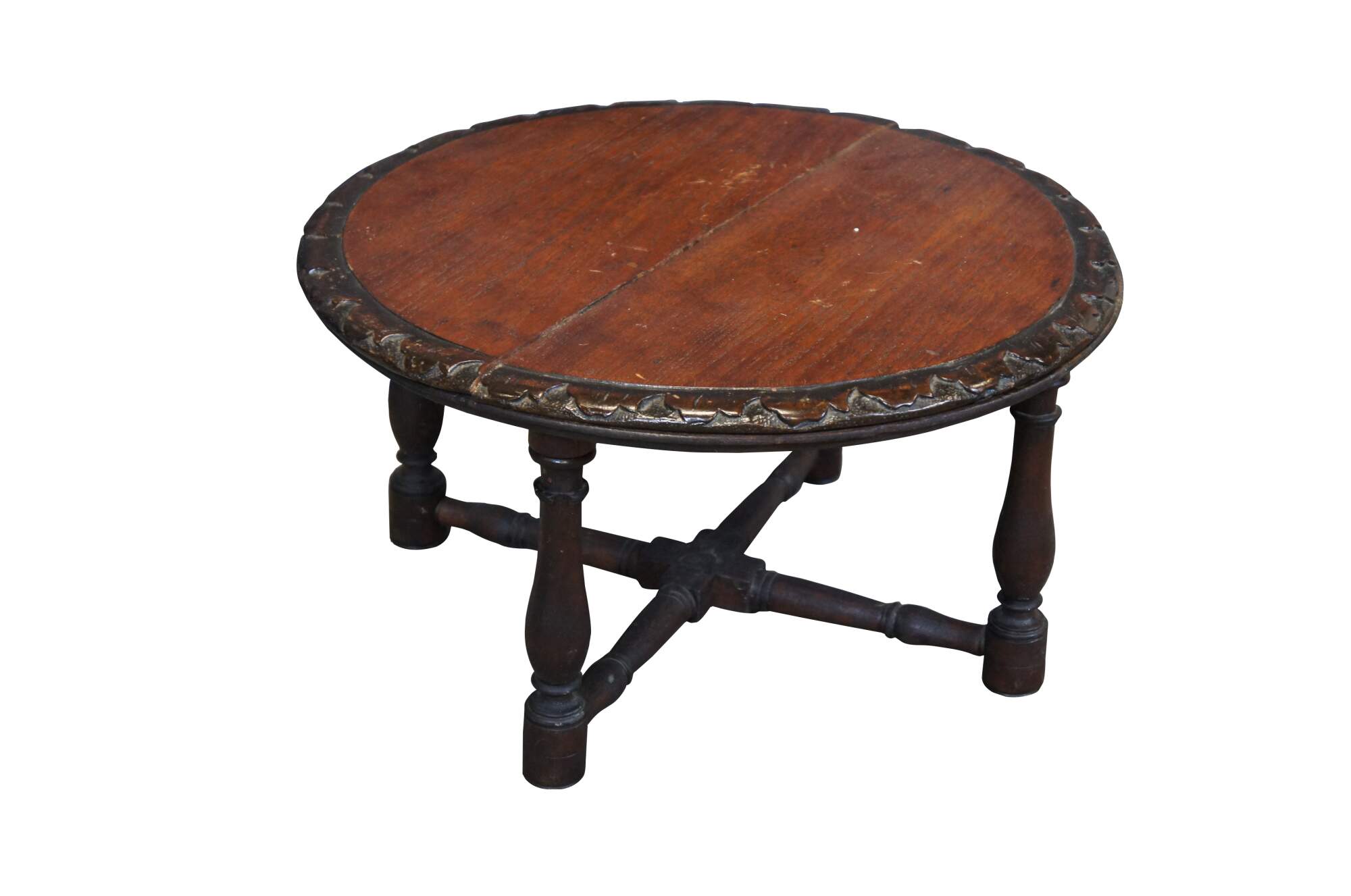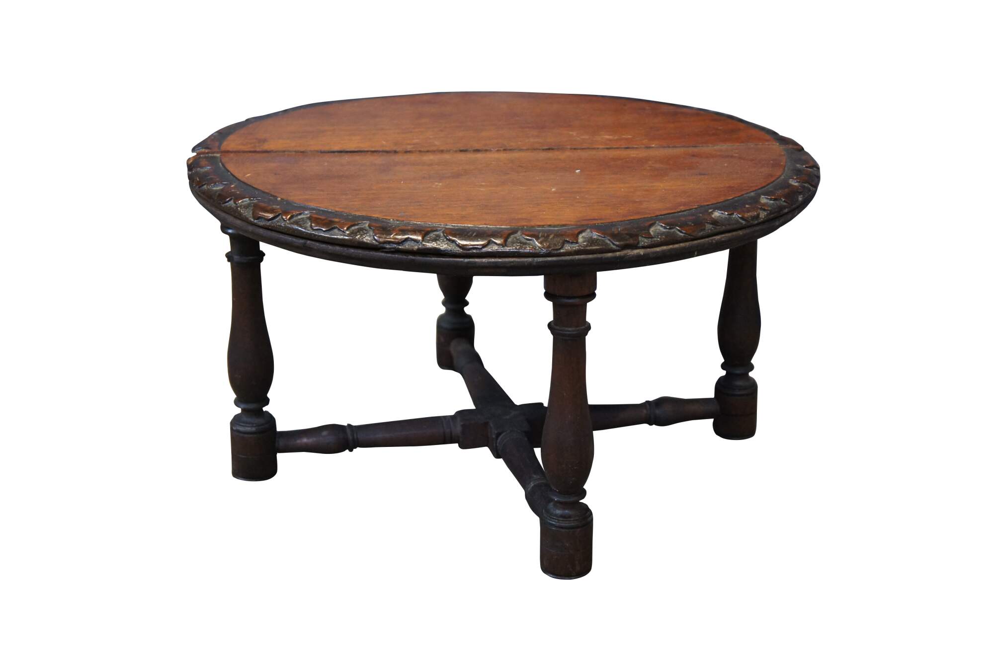 Antique French rustic / farmhouse mahogany plant stand / pedestal / trivot / low table - round shape with leaf carved border, four turned legs and X shaped stretcher.