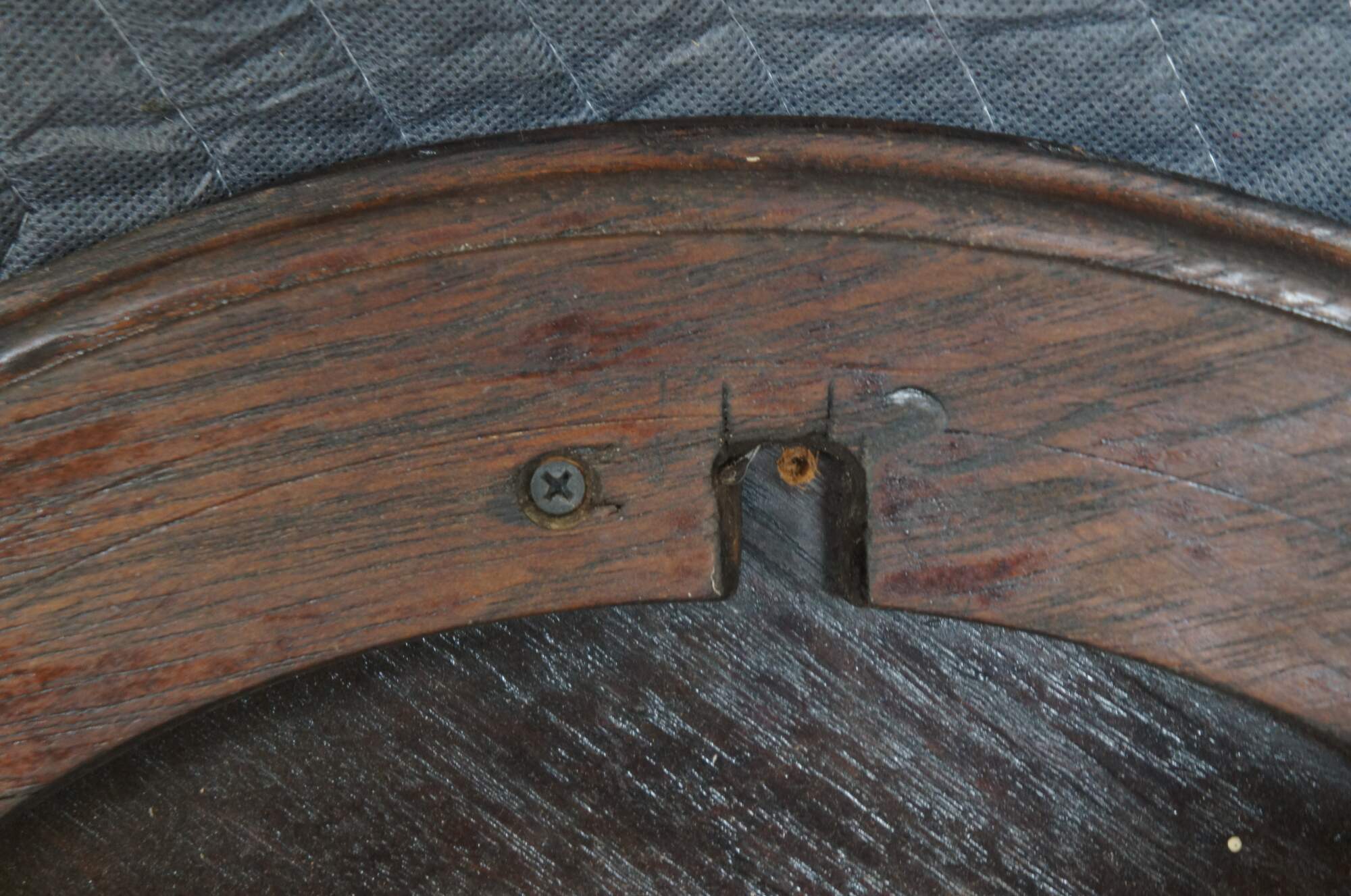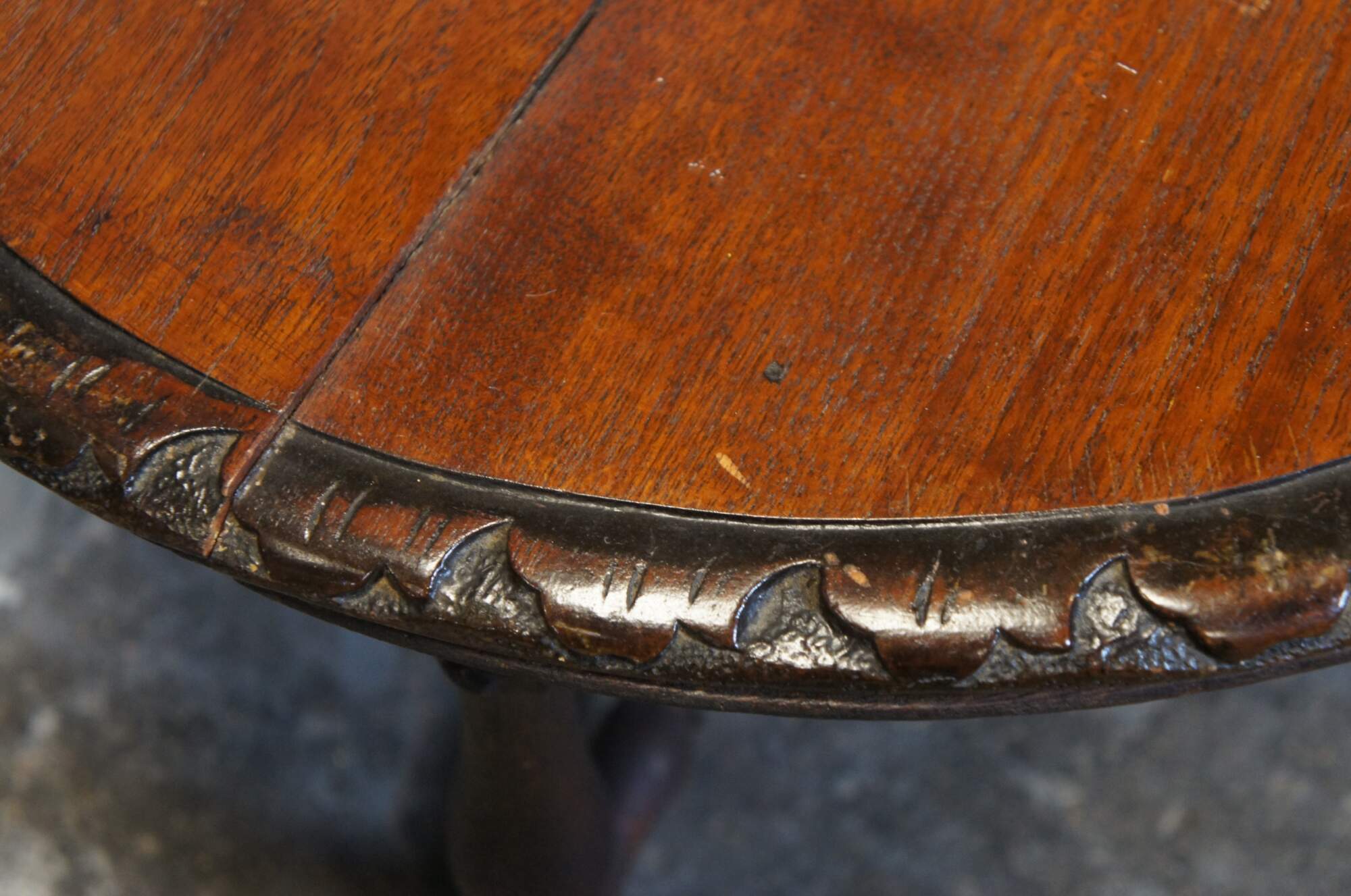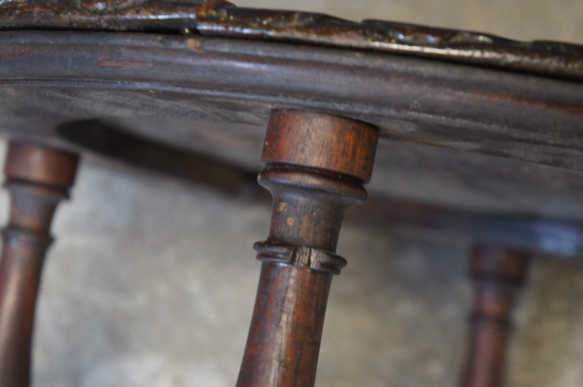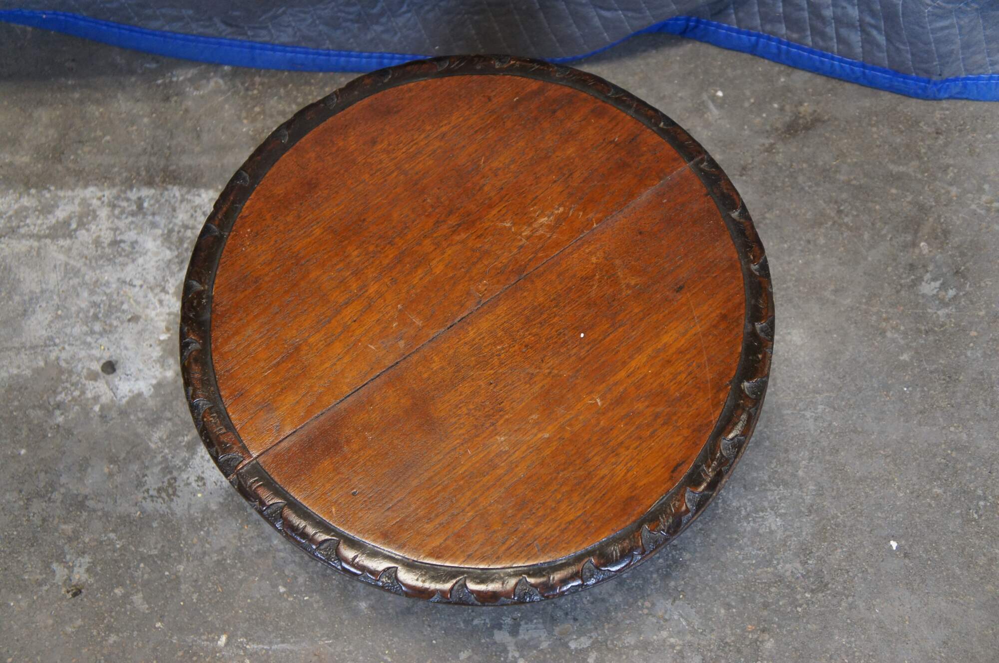 Antique French rustic / farmhouse mahogany plant stand / pedestal / trivot / low table - round shape with leaf carved border, four turned legs and X shaped stretcher.